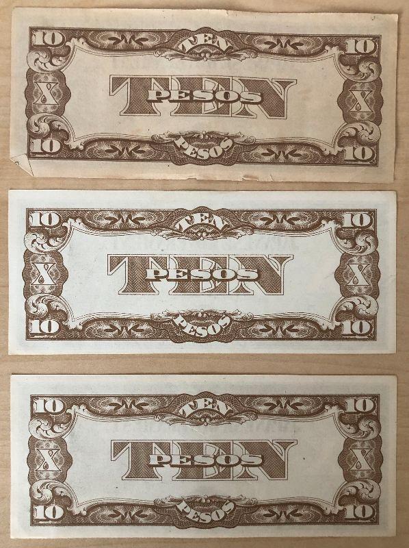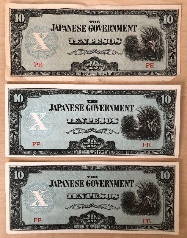 Lot #191 World War II Japanese Government 10 Peso Bills Wartime Currency