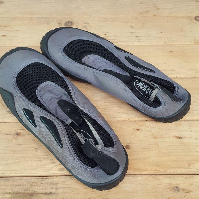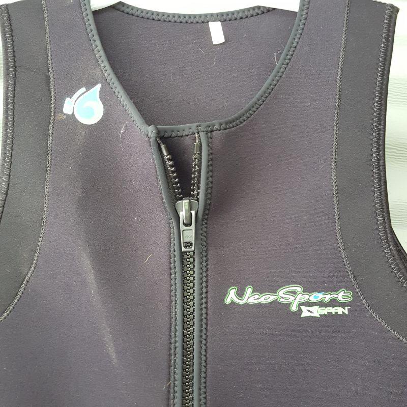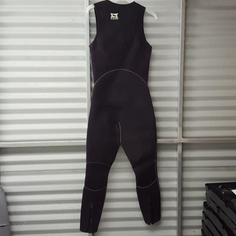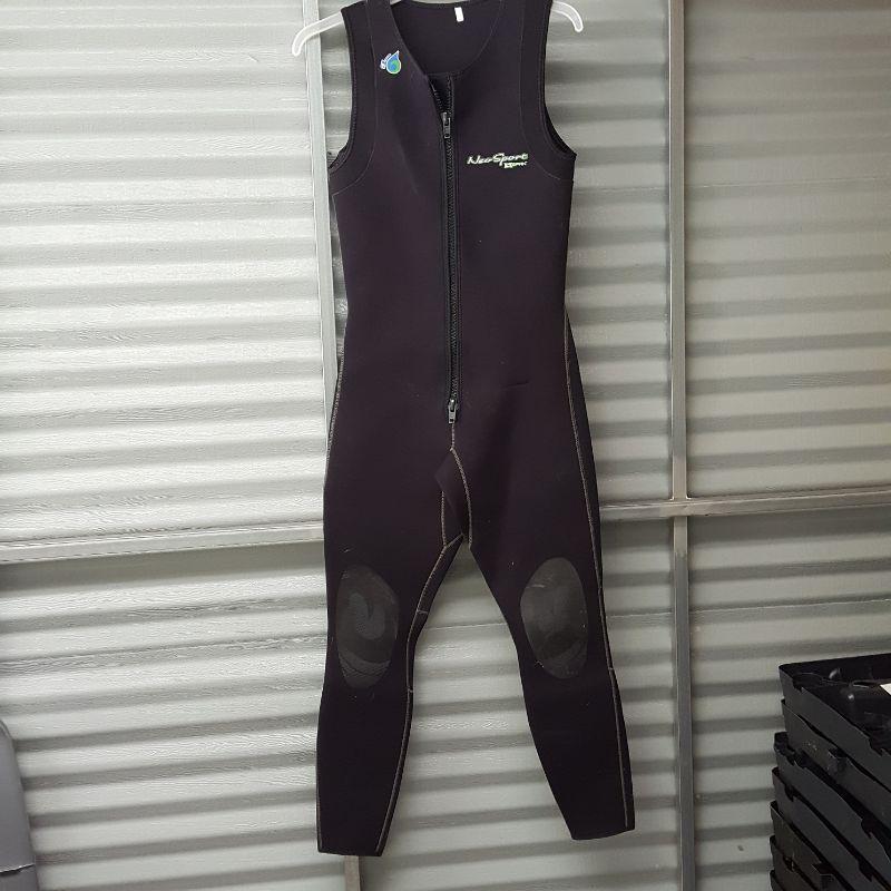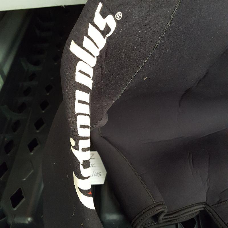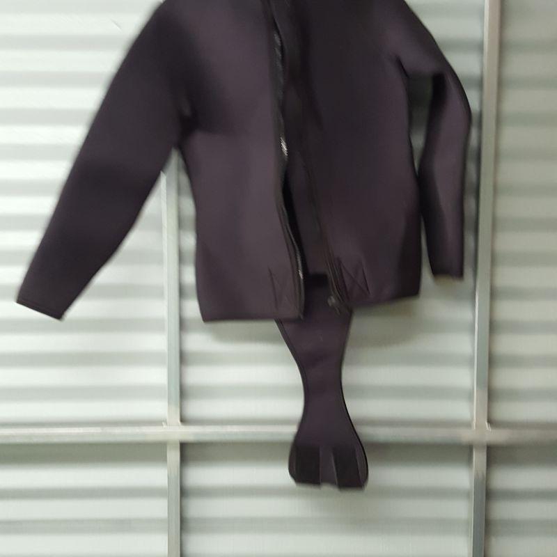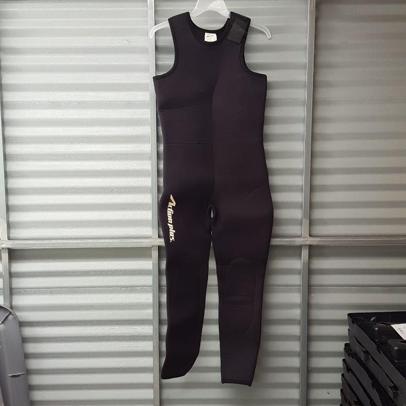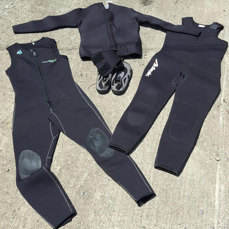 This lot comes with 4 items. Two full length wet suits, a wet jacket and a pair of men's size 10 water shoes. The jacket is from Action Plus size extra large. The one full length wet suit is also from Action Plus size extra large. The other full length wet suit is by Neo Sport and is a large. Shipping available