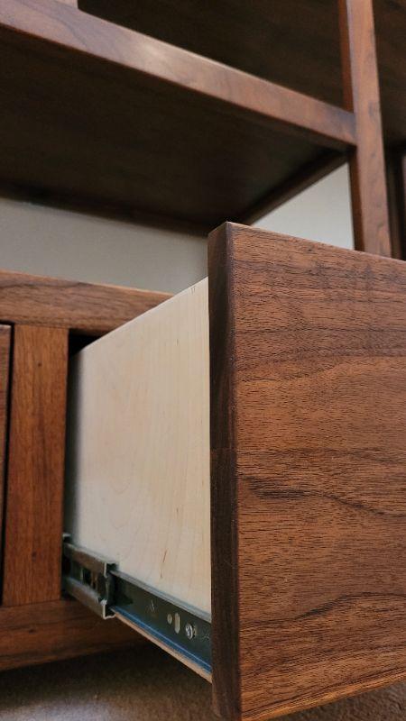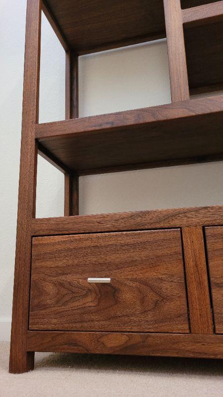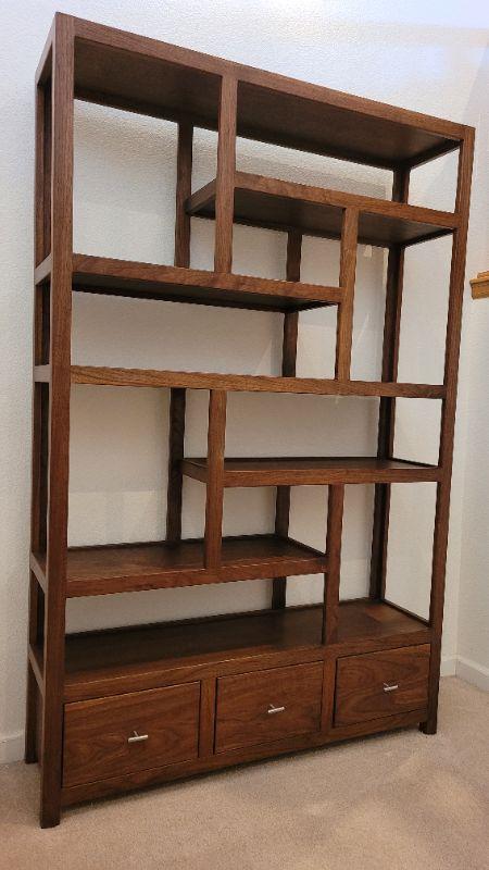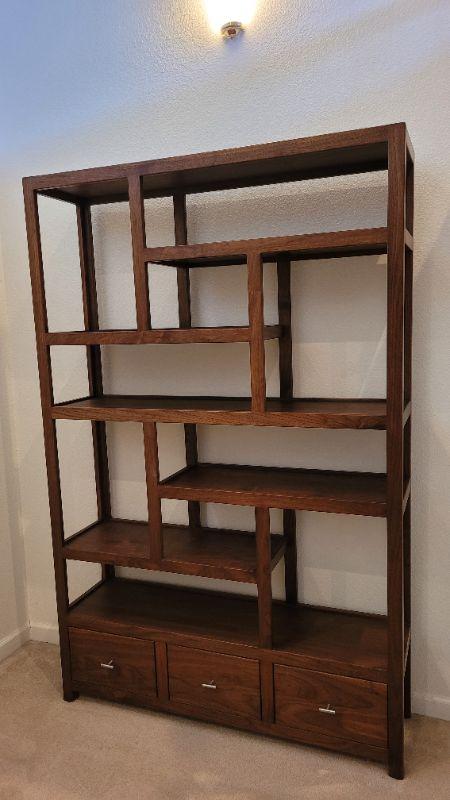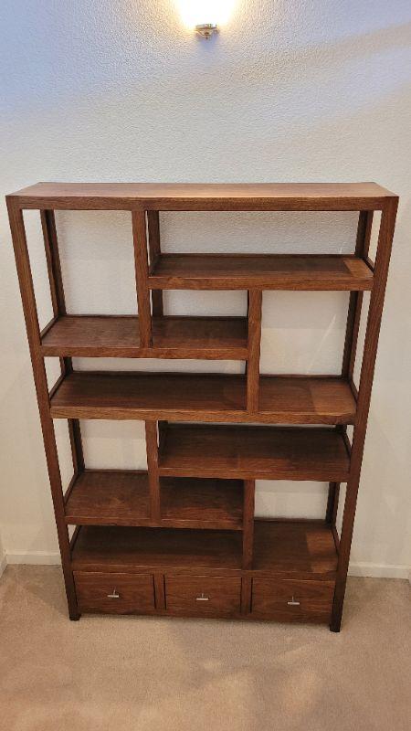 13" x 49" x 75". Ms. Museum RATING: 9.25 out of 10. ☆ Handsome Display Shelf that also features 3 drawers at the bottom. No maker marks were found upon inspection. We also had another matching unit that has a reverse configuration of shelves so that when both are joined they form a symmetrical presentation to increase the style of any wall. The 1st unit was in the previous Auction. ☆ Please view all pictures to determine if the condition meets your standards. The pictures are the best representation of the item. Please ask any questions prior to bidding to ensure your satisfaction.