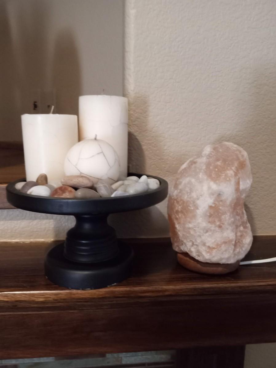 CANDLES SIT ON A METAL PEDESTAL BASE SURROUNDED BY RIVER ROCK