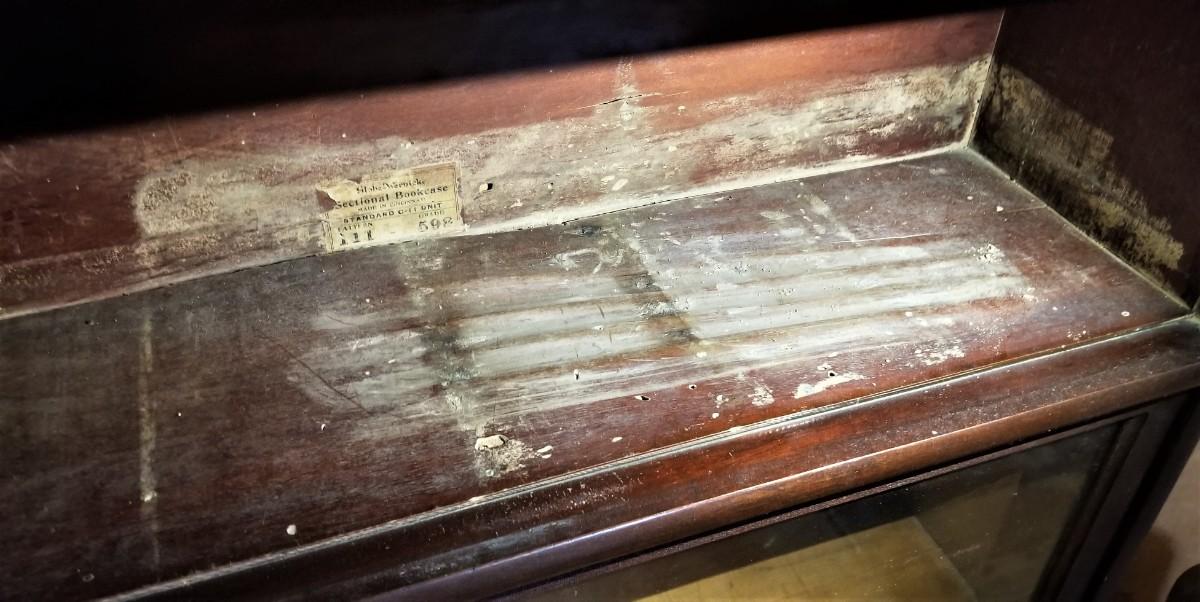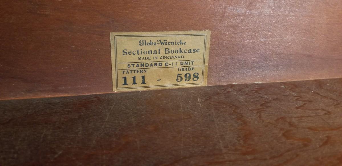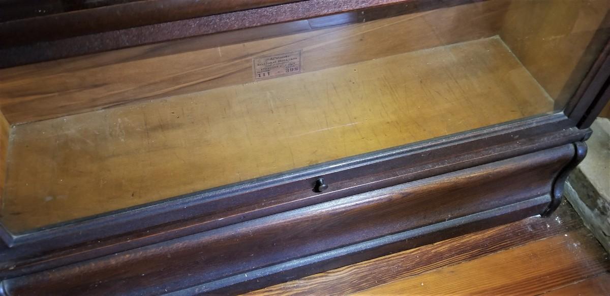 It's all there, but needs some TLC. Antique Barrister bookcase with glass doors - all the doors work ok and they have the metal struts, which is what you want. Made by the Wernicke Sectional Bookcase Company in Cincinnati, Ohio. Top and bottom shelves are good, but number 2 and 3 need some love. Check out all photos. 62" tall, 34" across, 10.5" deep.