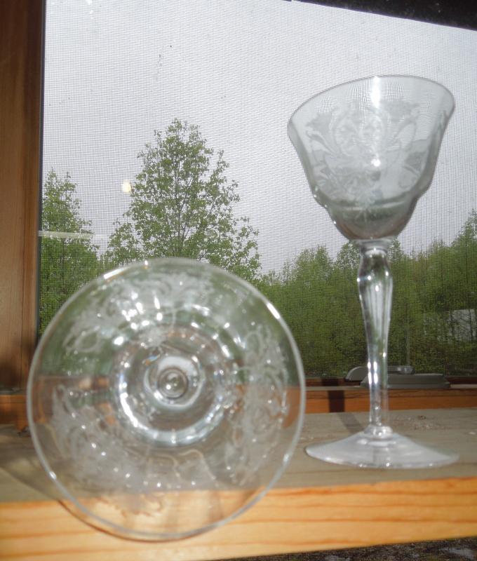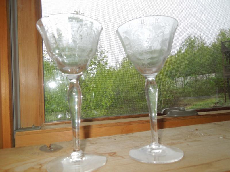 Beautiful etched glass design. Total of six stemmed glasses. No cracks or chips.