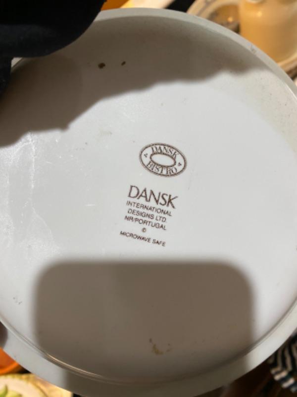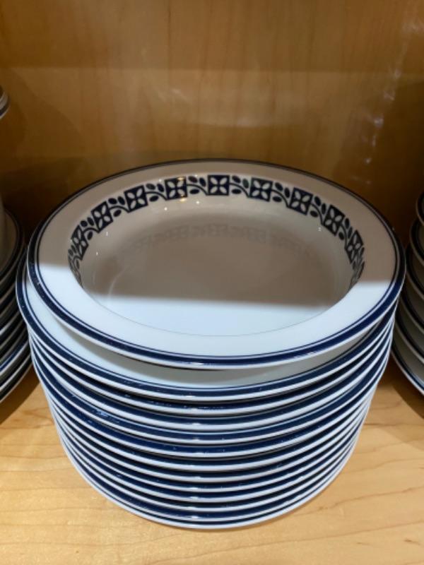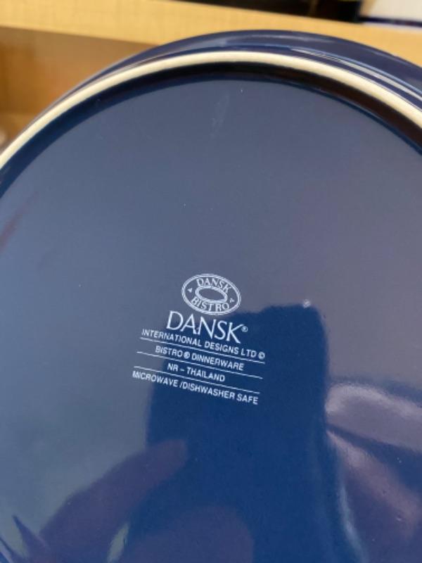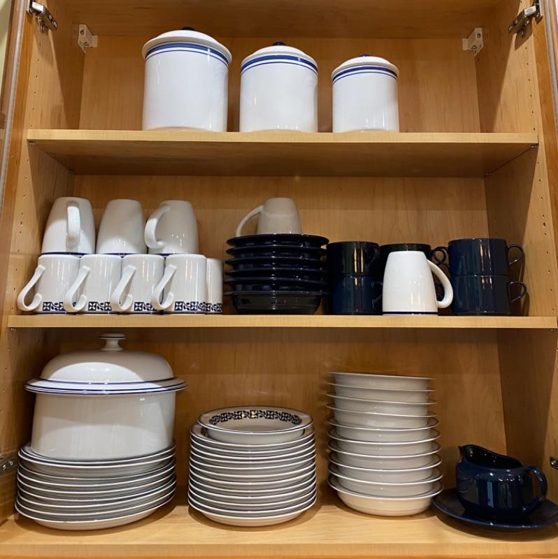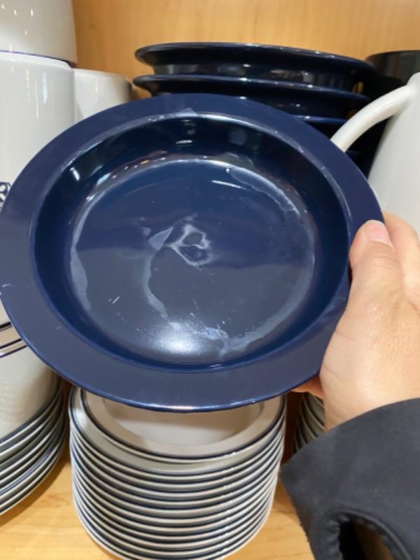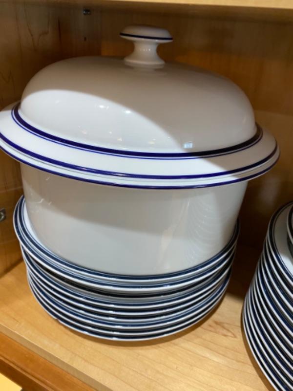 3 canisters By HOME , 1- navy gravy boat, 6- handles soup bowls,
