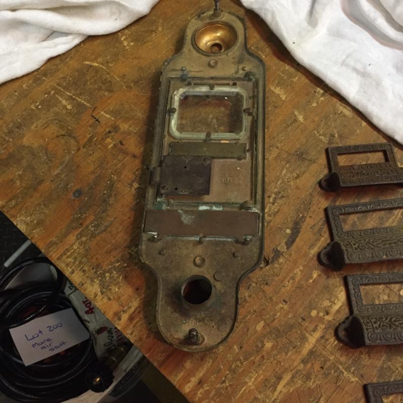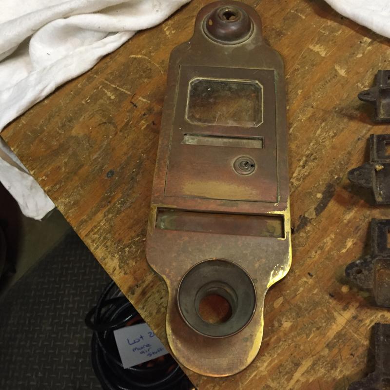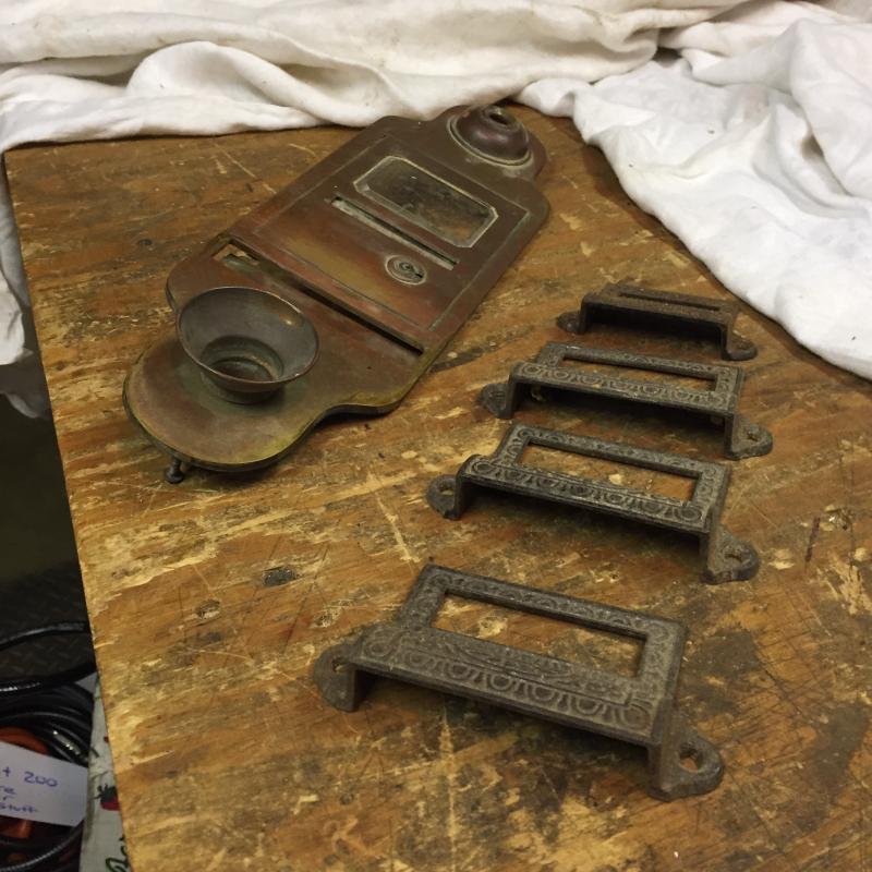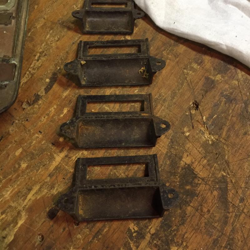 4 label display Drawer Pulls and what looks like an old door plate for a mail drop. Door plate measures 13.5” x4”.