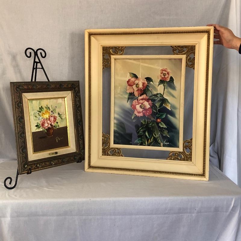 2 framed floral art pieces. Smaller one is a signed acrylic and larger is a watercolor and also signed. Each frame is vintage with nice detail and ready to hang. Smaller piece has blemish on frame in bottom left corner see photos.