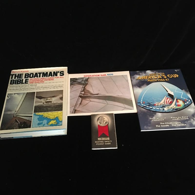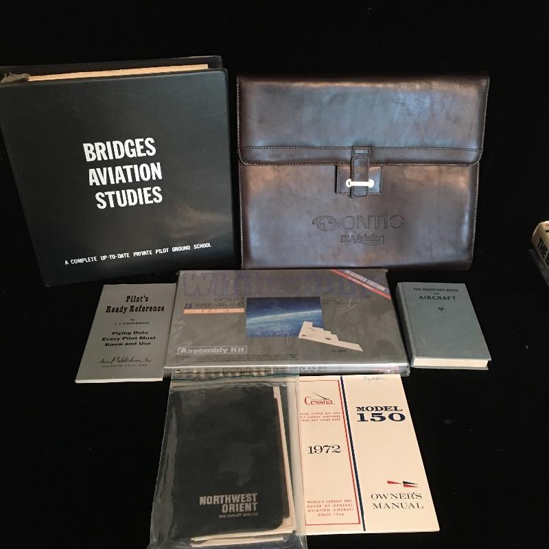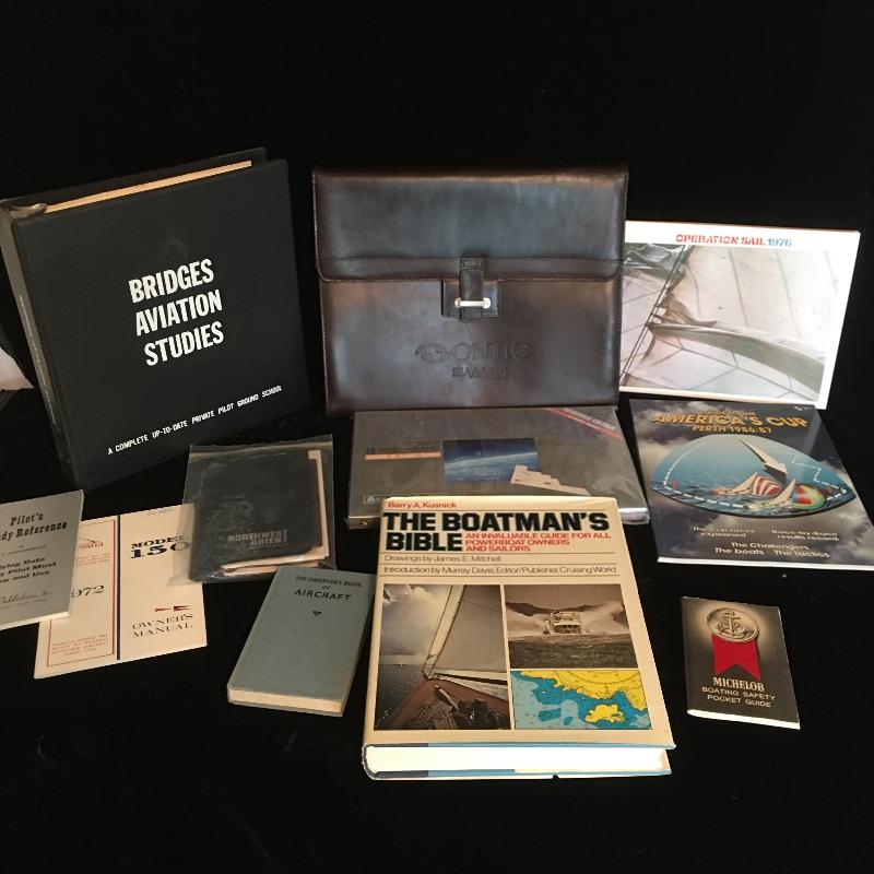 Flying and boating books. Lot includes Cutter and Buck portfolio, The Boatsman Bible, White Wings paper airplanes, Operation Sail 1976, Bridges Aviation Studies and more. Great read for the aviation or nautical buff.