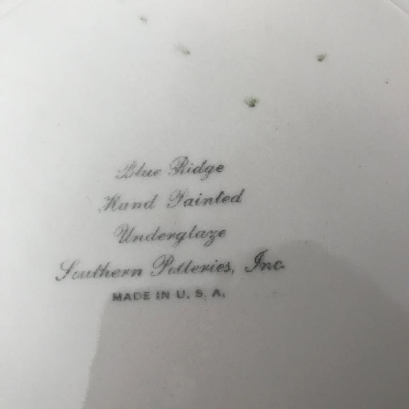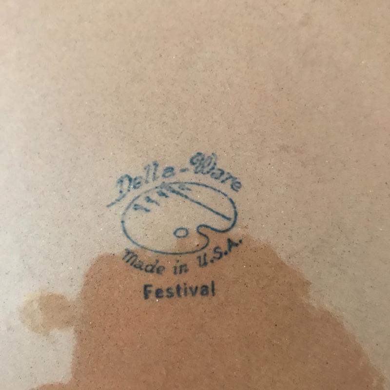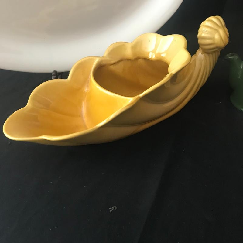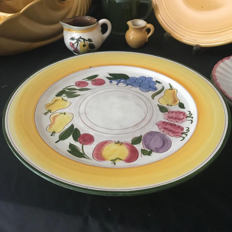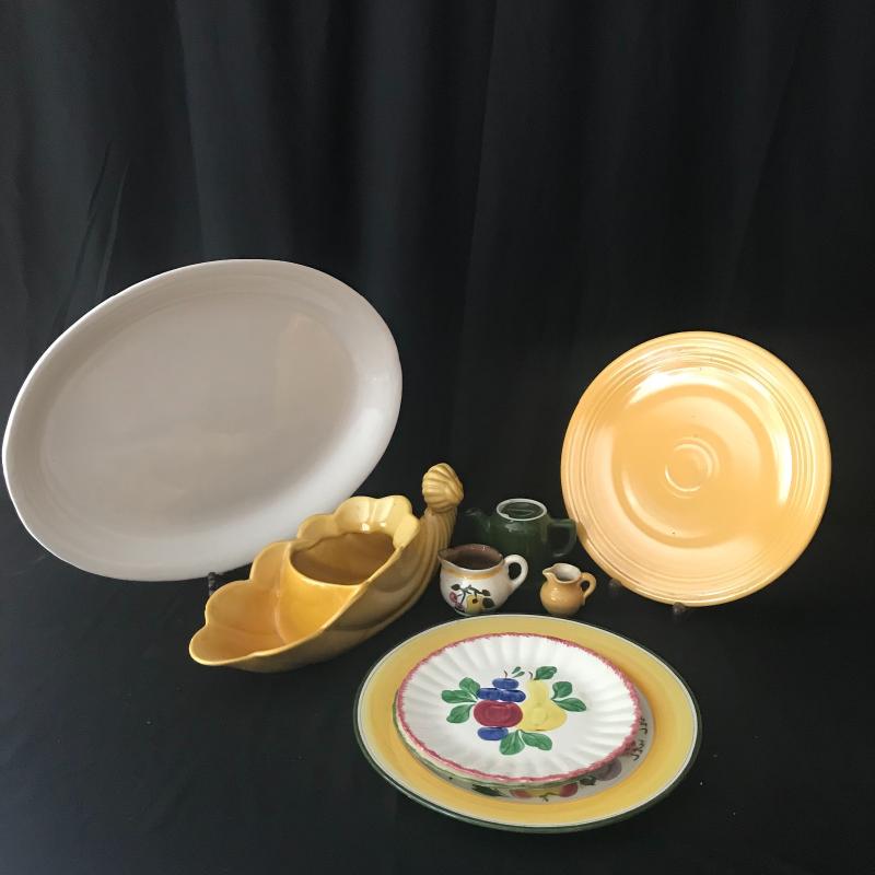 This collection of mostly ceramic pieces is quite charming with its warm colors. Two Blue Ridge painted plates, Haeger cornucopia, two Della Ware pieces, plate has a chip see pix. Large white platter measures 22” x16”. Local pick up only.