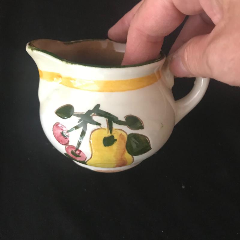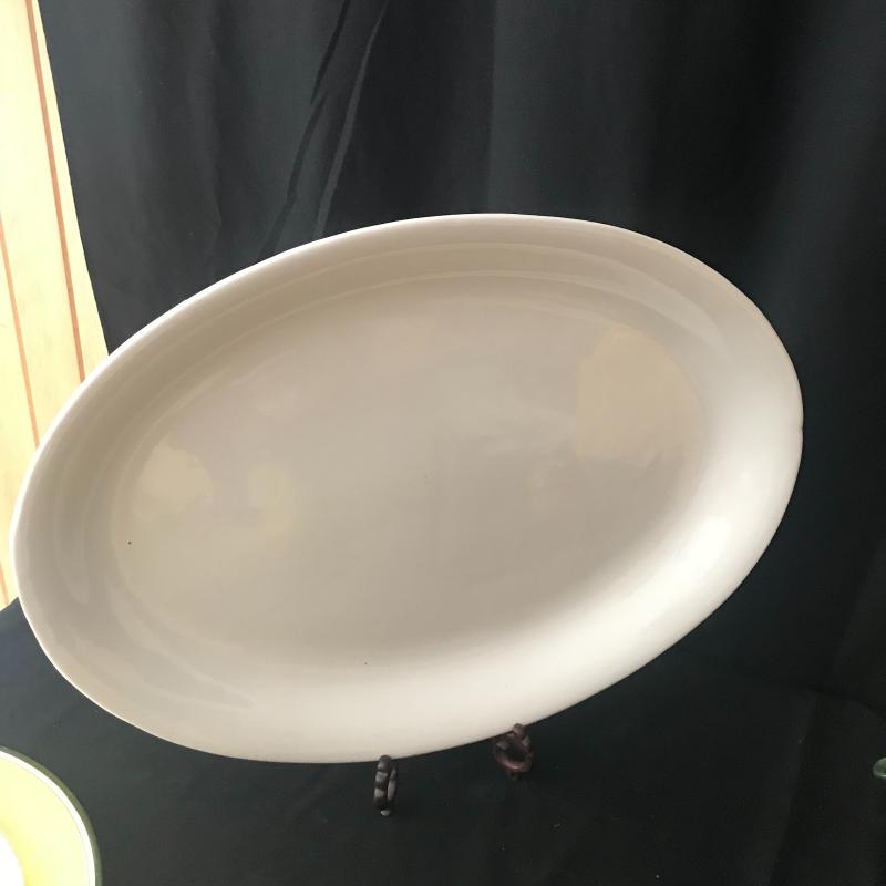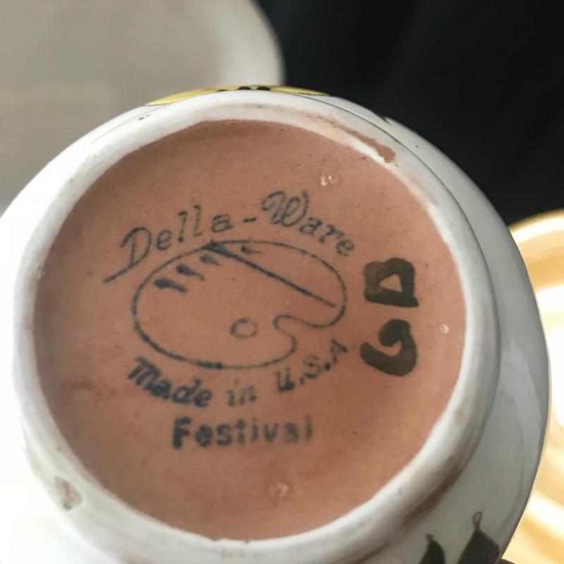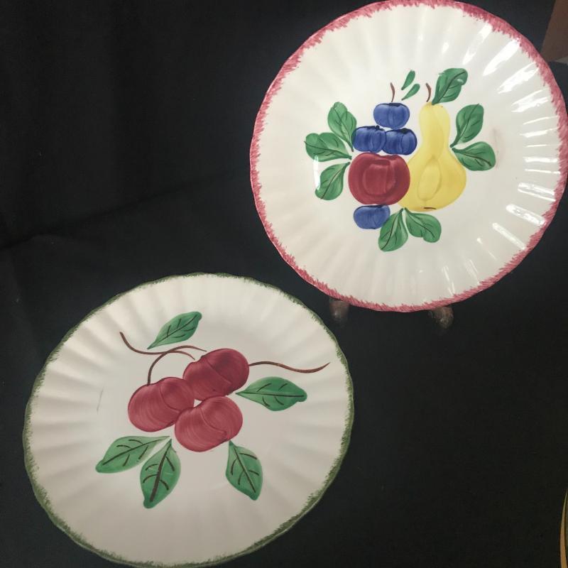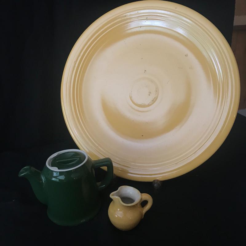 This collection of mostly ceramic pieces is quite charming with its warm colors. Two Blue Ridge painted plates, Haeger cornucopia, two Della Ware pieces, plate has a chip see pix. Large white platter measures 22” x16”. Local pick up only.