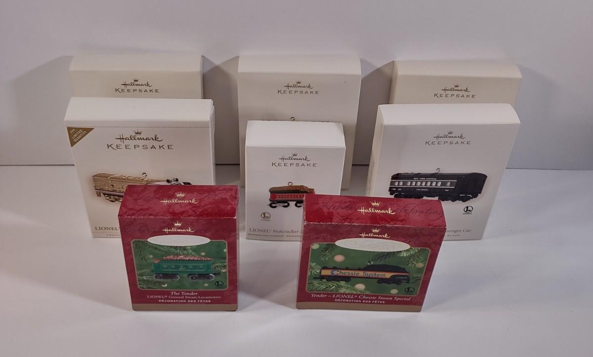 Hallmark Keepsake Lionel Ornaments With Boxes. All Holiday items in this auction are as-seen. The client collected a lot of holiday pieces and some are new in box, some were displayed once and come with original box, and some have been displayed and come with no box. They are all pre-owned in some fashion and have been stored in an attic or on shelf in library. Please see all pictures. The pictures show condition, measurements if taken, and what is included in the lot. Due to the large amount that we photograph and the time frame, we are not always able to take measurements. All items unless noted, are pre-owned and have been used. Thank you