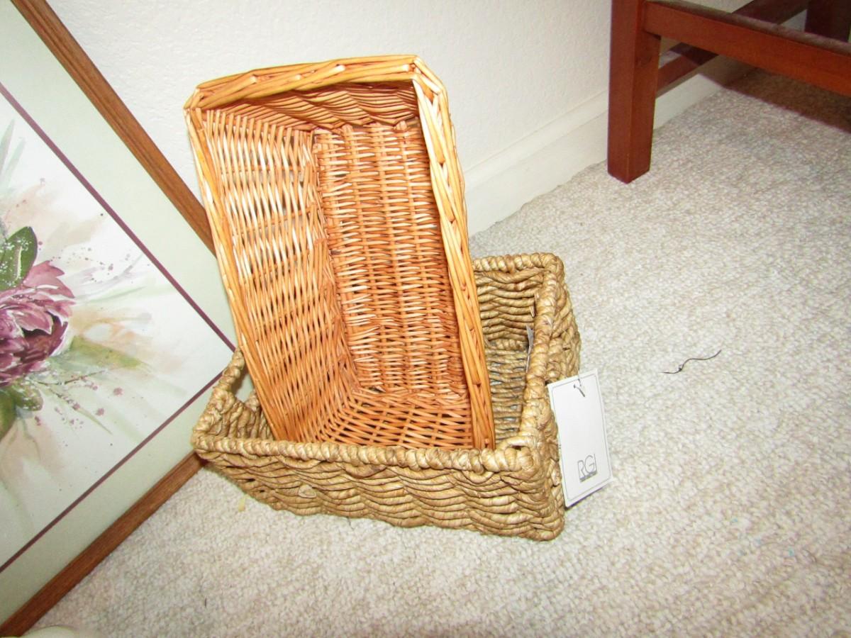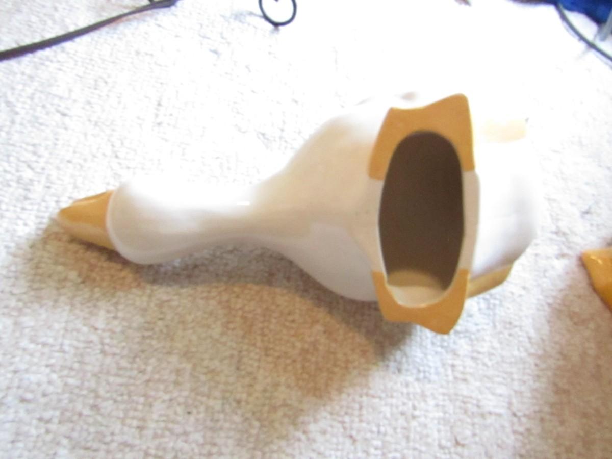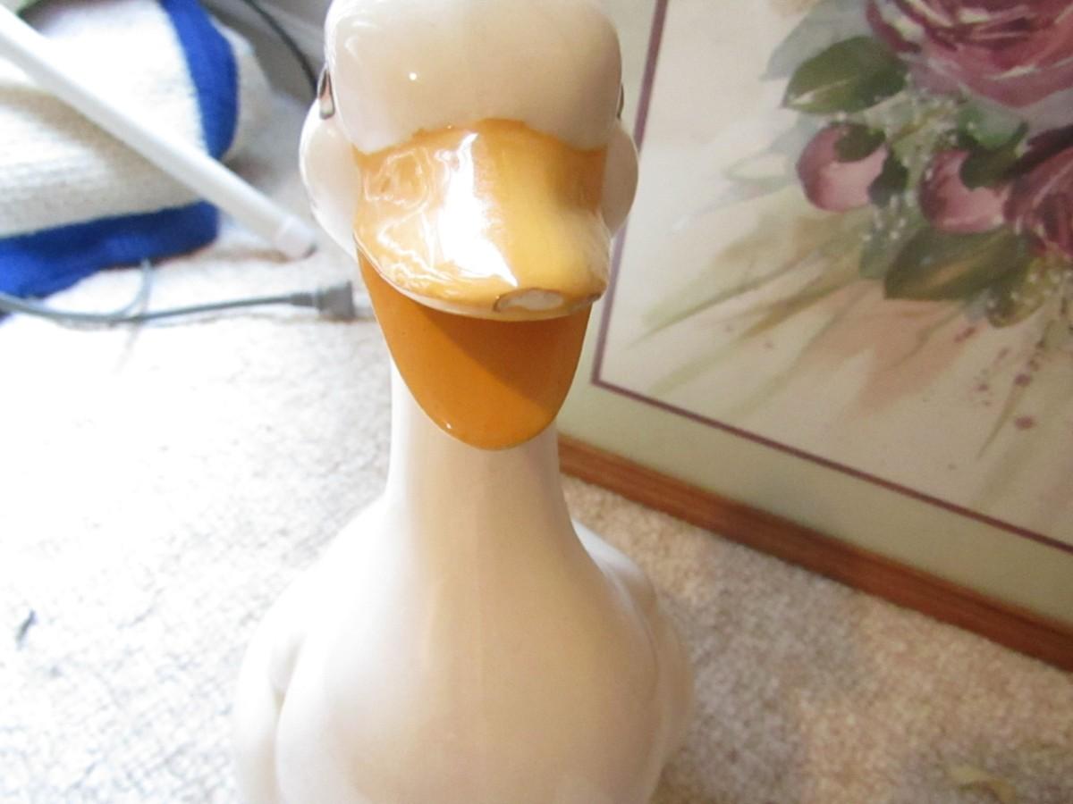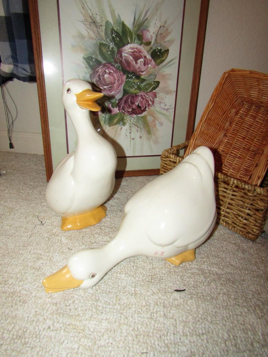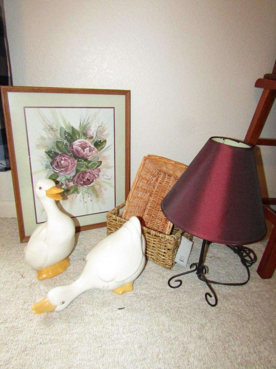 2 CERAMIC DUCKS 12" AND 14" LONG, THERE IS A SMALL CHIP TO ONE OF THE DUCKS BILLS, SMALL LAMP, 2 WICKER BASKETS AND A FRAMED PRINT
