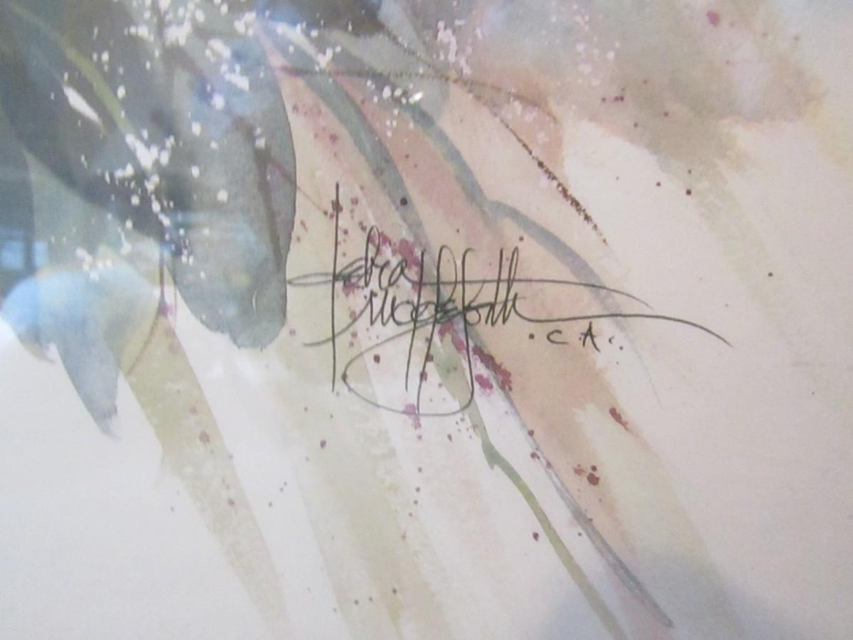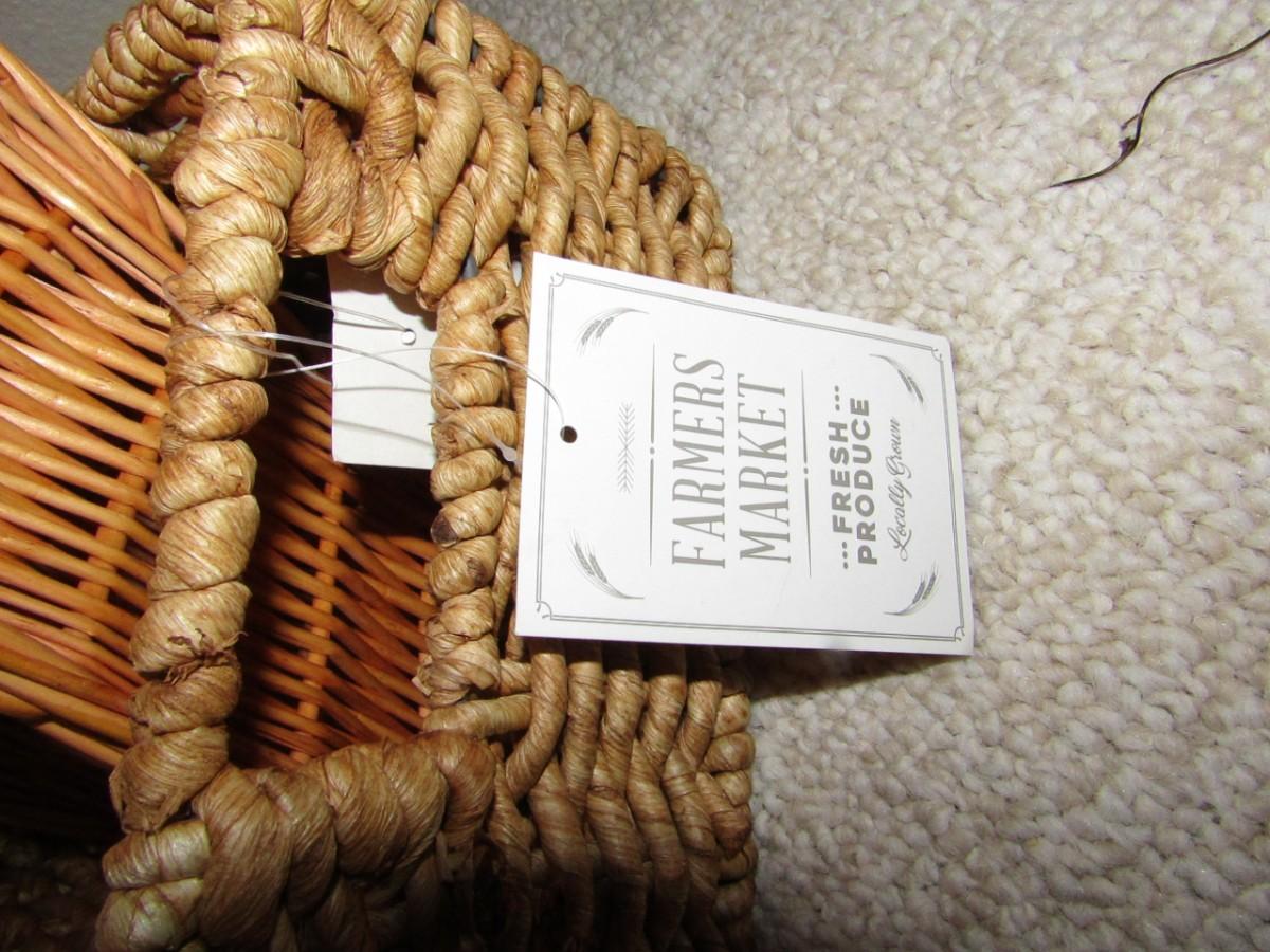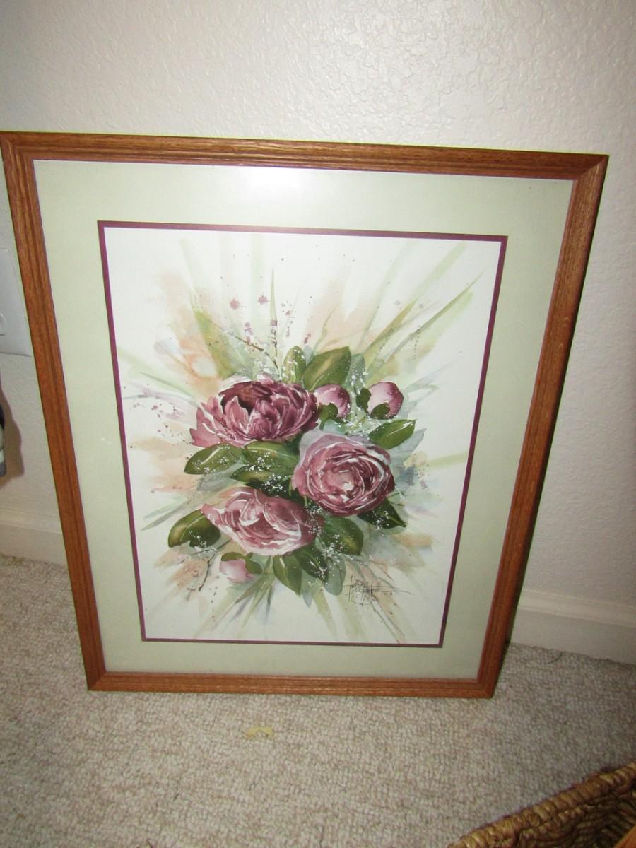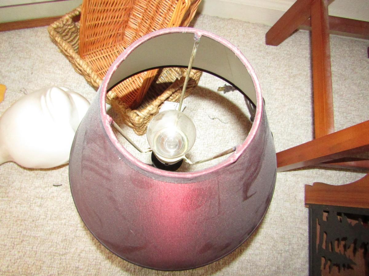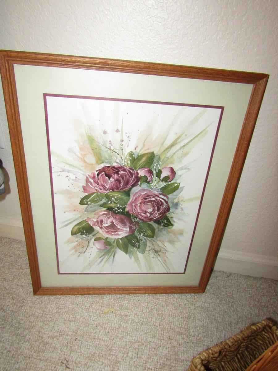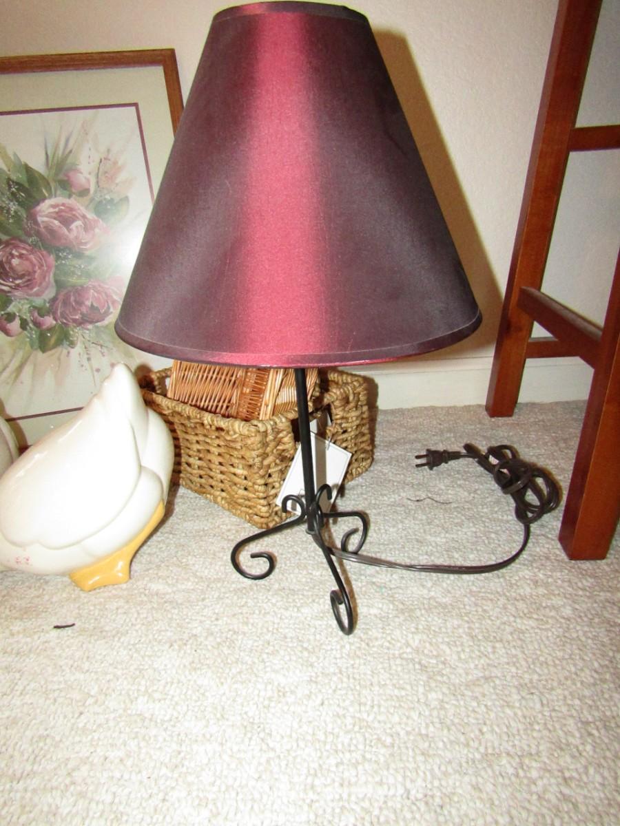 2 CERAMIC DUCKS 12" AND 14" LONG, THERE IS A SMALL CHIP TO ONE OF THE DUCKS BILLS, SMALL LAMP, 2 WICKER BASKETS AND A FRAMED PRINT