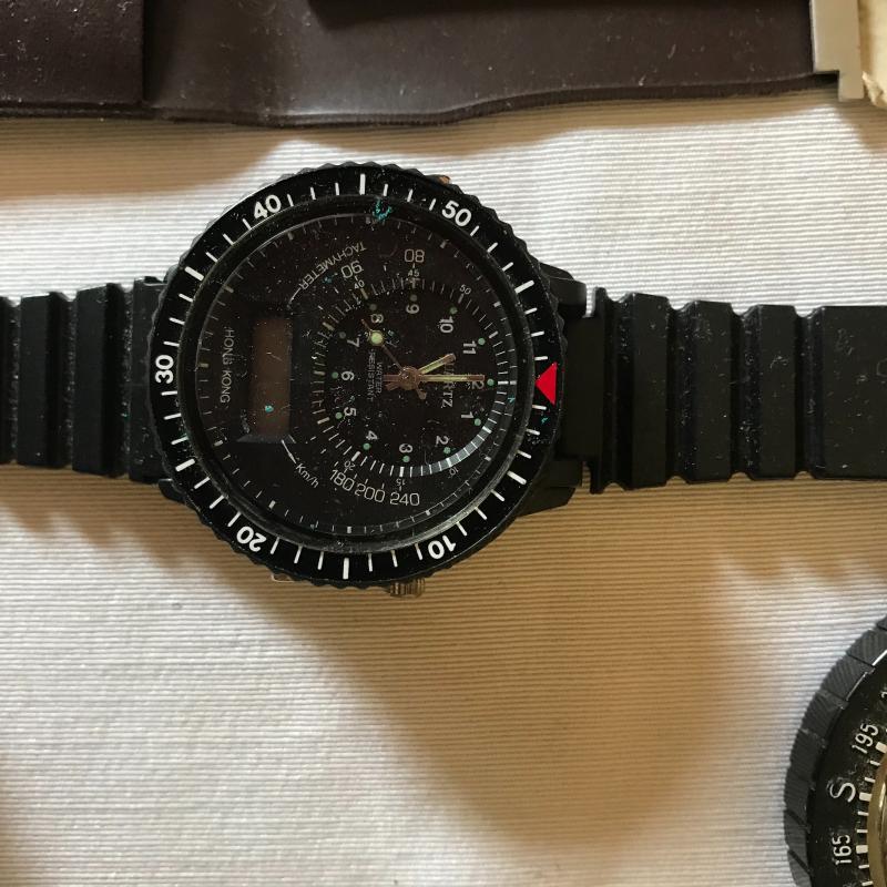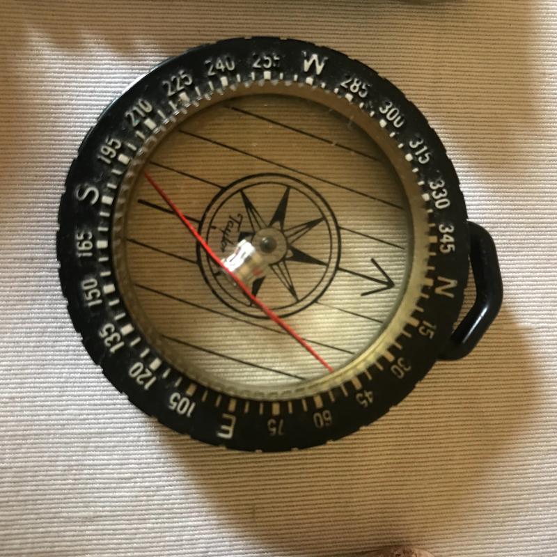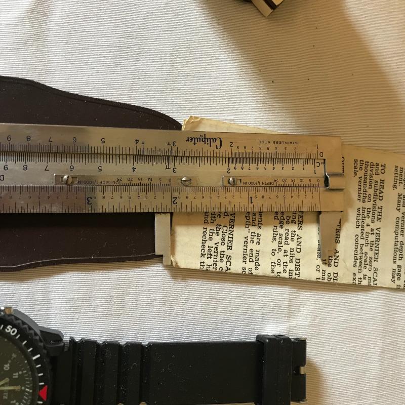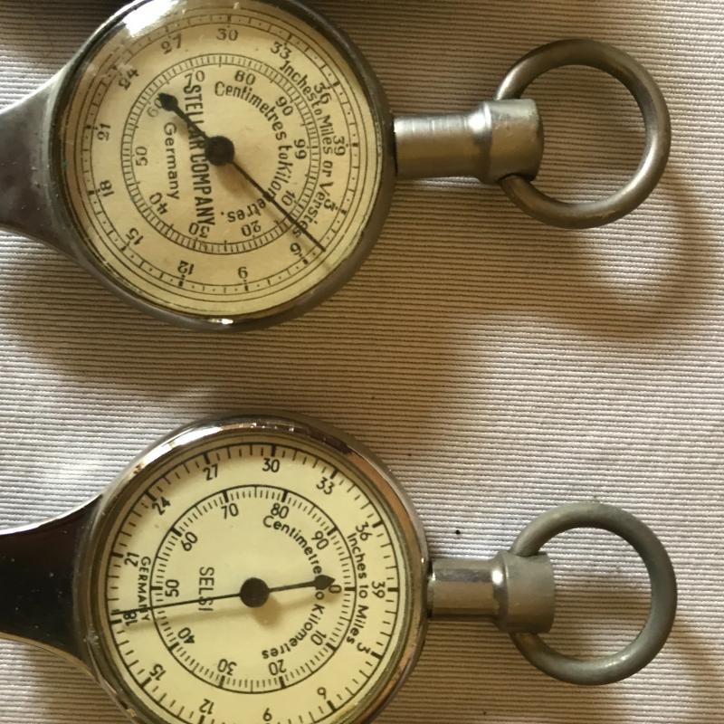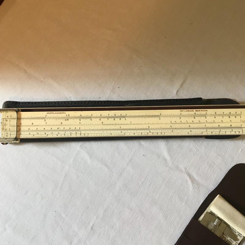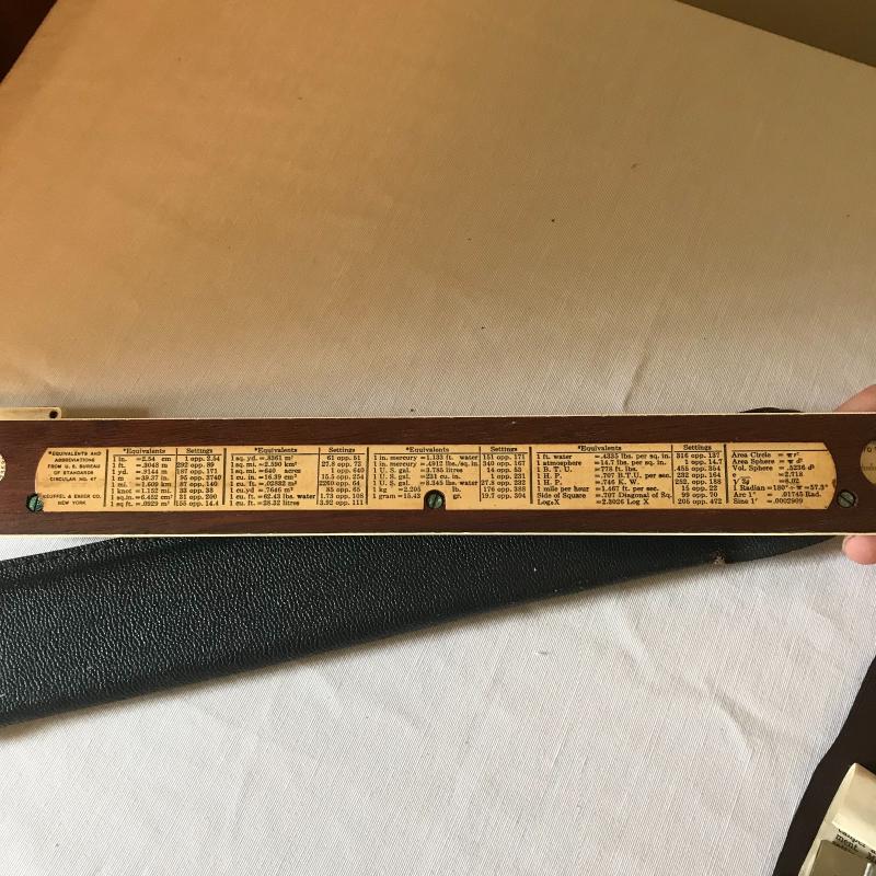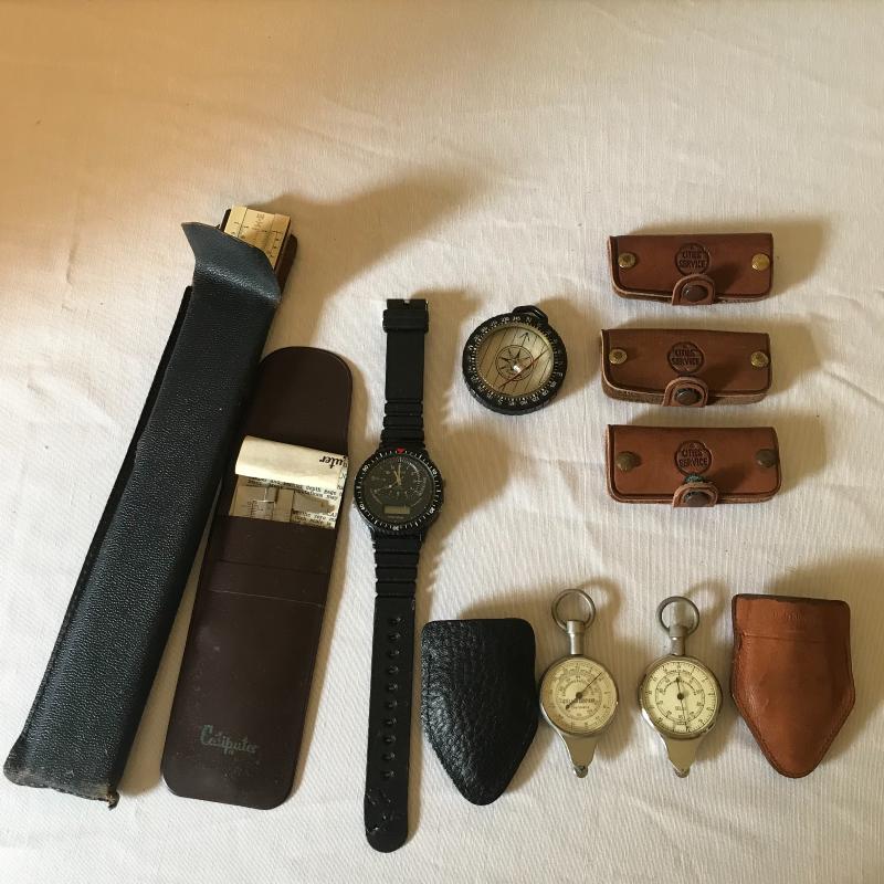 Leuffel & Esser Co. slide ruler, caliper ruler, compass, watch and two dial measurers. One has broken compas on back side. Both have leather cases. Also 3 dealership key ring guards. Shipping avaialable.