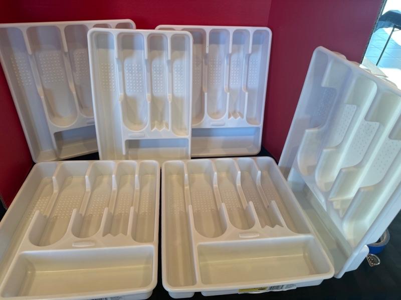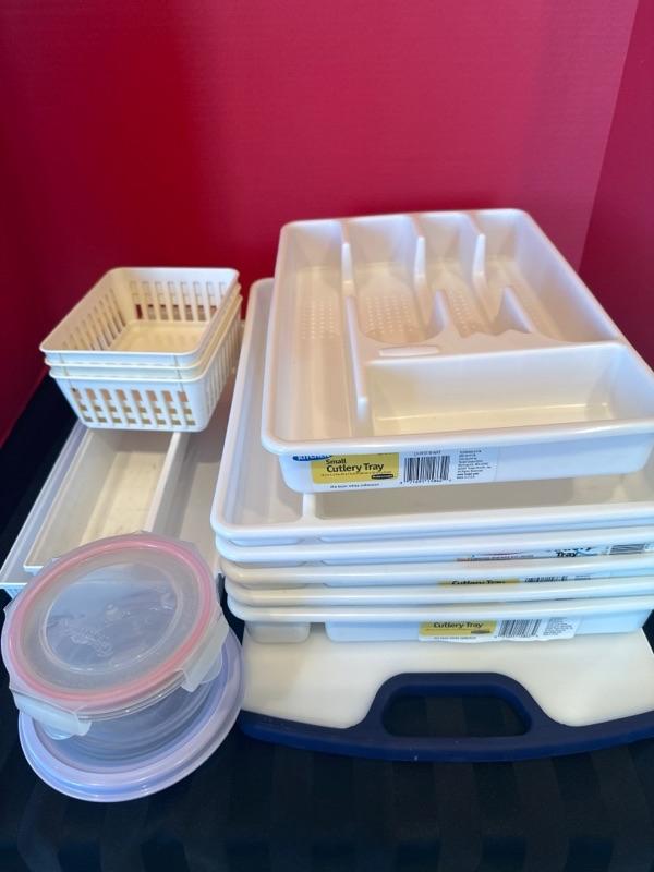 Kitchen aid cutting board, 5 Large cutlery trays, baskets, 2 drawer trays, food storage containers, 1 small cutlery tray, 1 plastic pie server