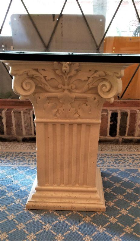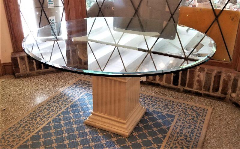 Nice round glass dining table with plaster columnar base - Tempered, beveled glass top - good condition. Purchaser will have to move this themselves. 54" across. Glass lifts off of base.