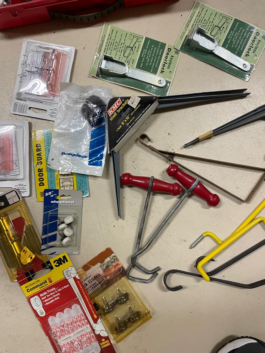 A variety of household hardware items,--metal brackets, sliding door security latches, etc with divided box