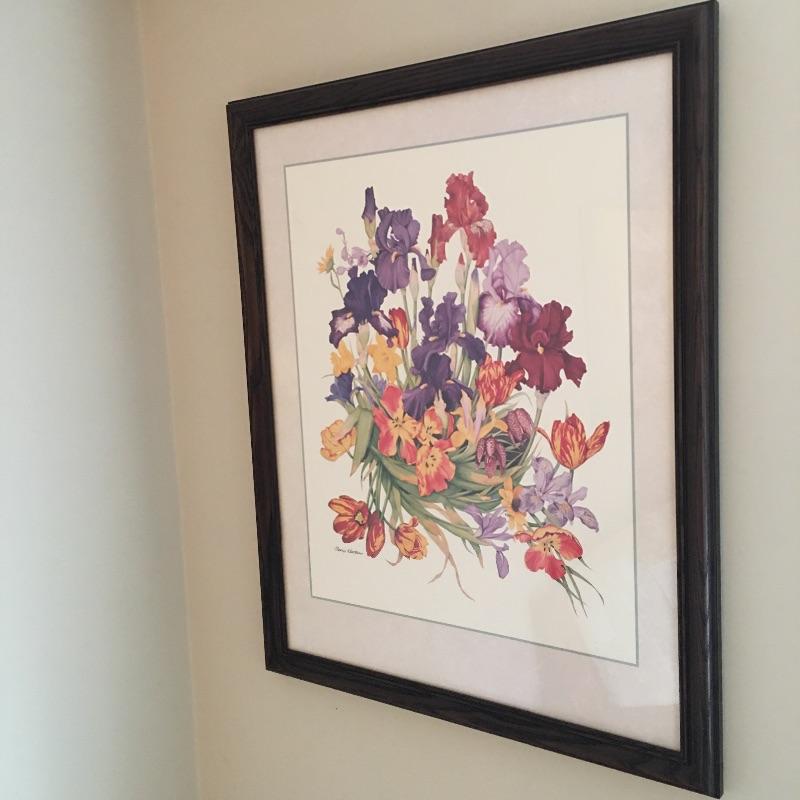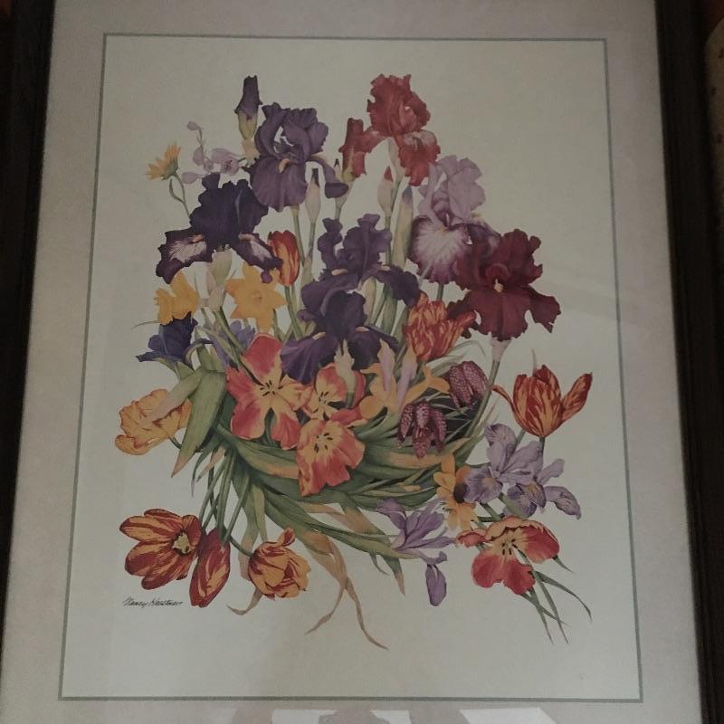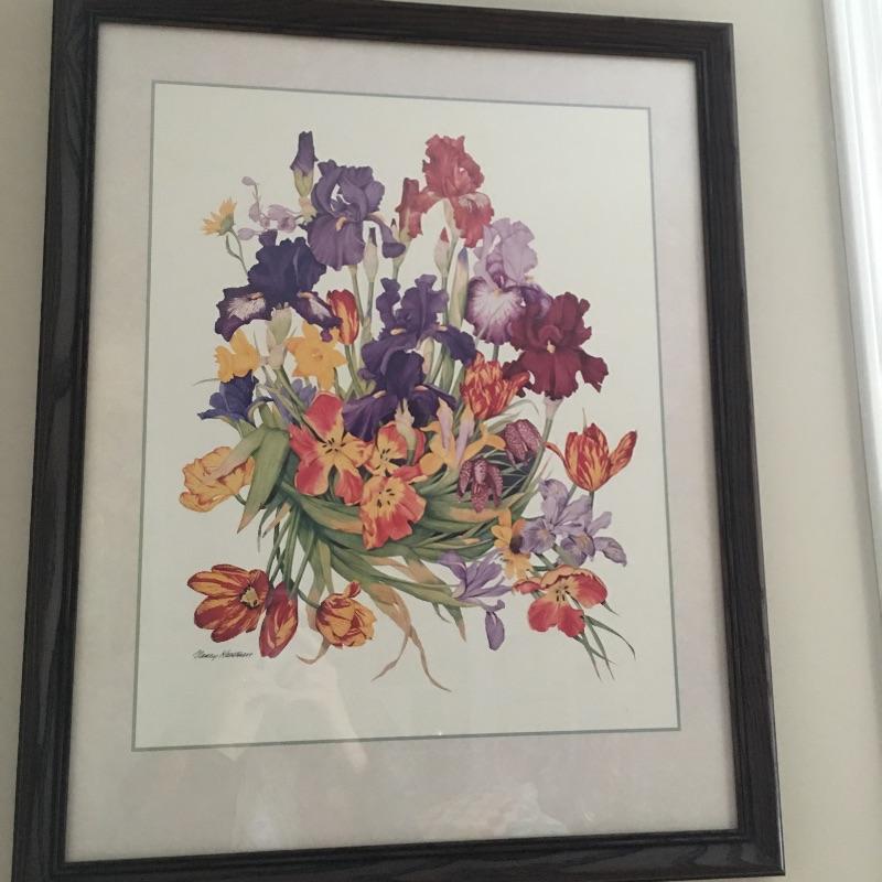Nancy Kaestner framed print from a watercolor titled “Jubilation”. Bring Iris and other flowers to your home with this bright and airy print. Frame measures 24.5” x 30.5”.