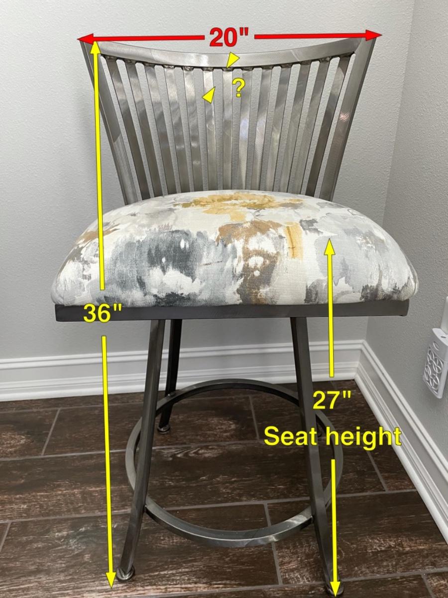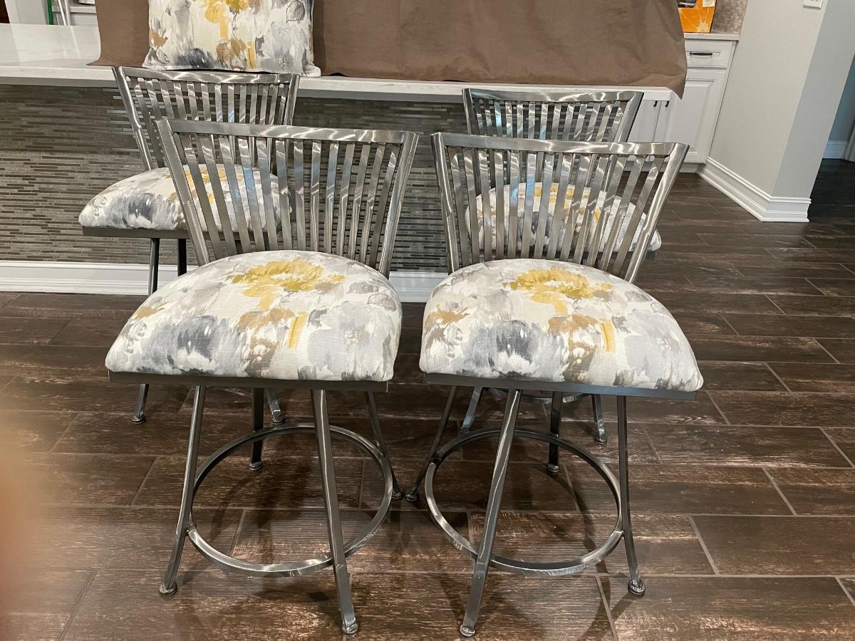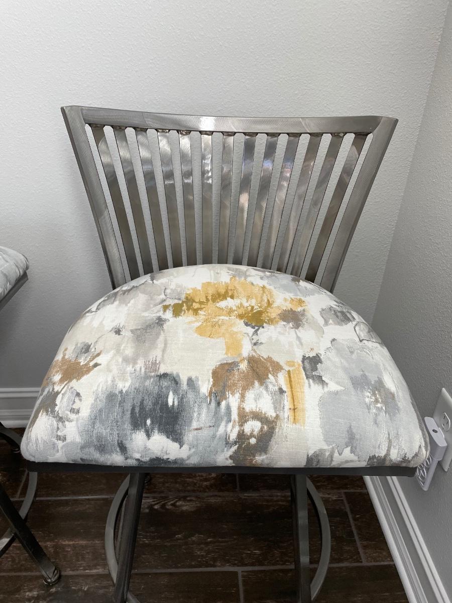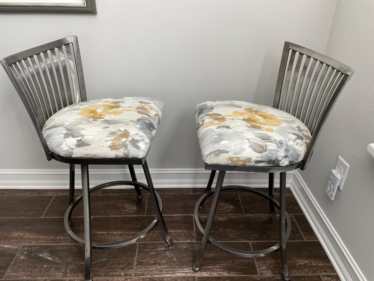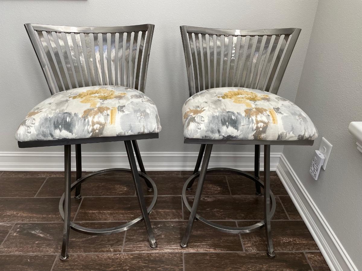 Brushed steel with an upholstered seat. They swivel. High quality, very sturdy, perfect condition. Includes a matching lumbar pillow.