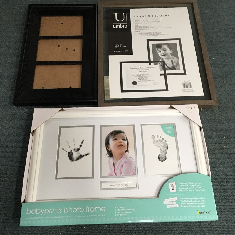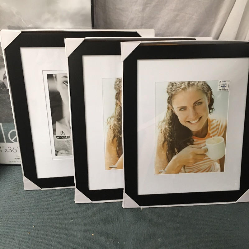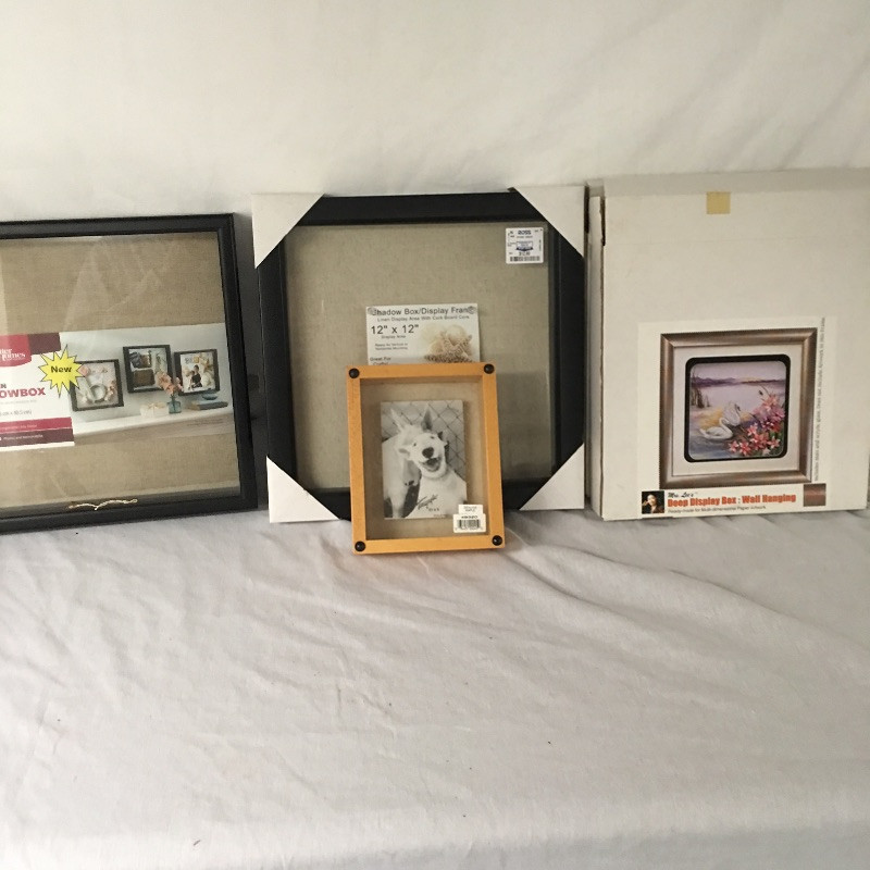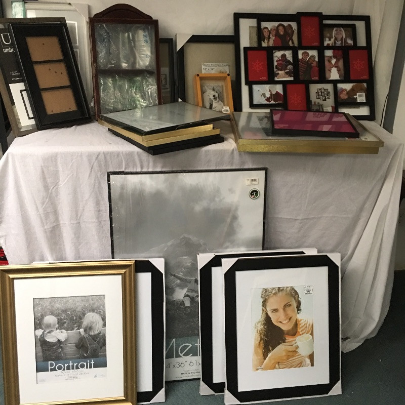 Large variety of picture frames in a variety of sizes, shapes and materials also shadow boxes - see pictures.
