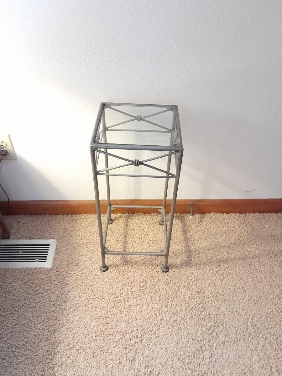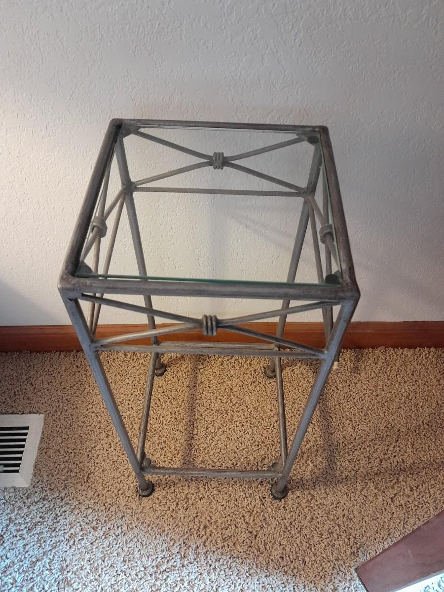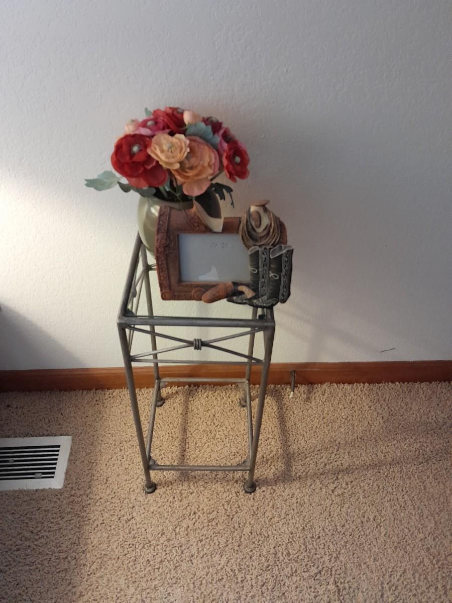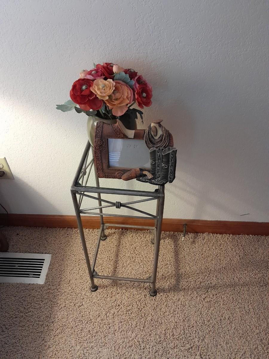 SMALL GLASS AND METAL TABLE WITH PICTURE FRAME AND FAUX FLOWERS