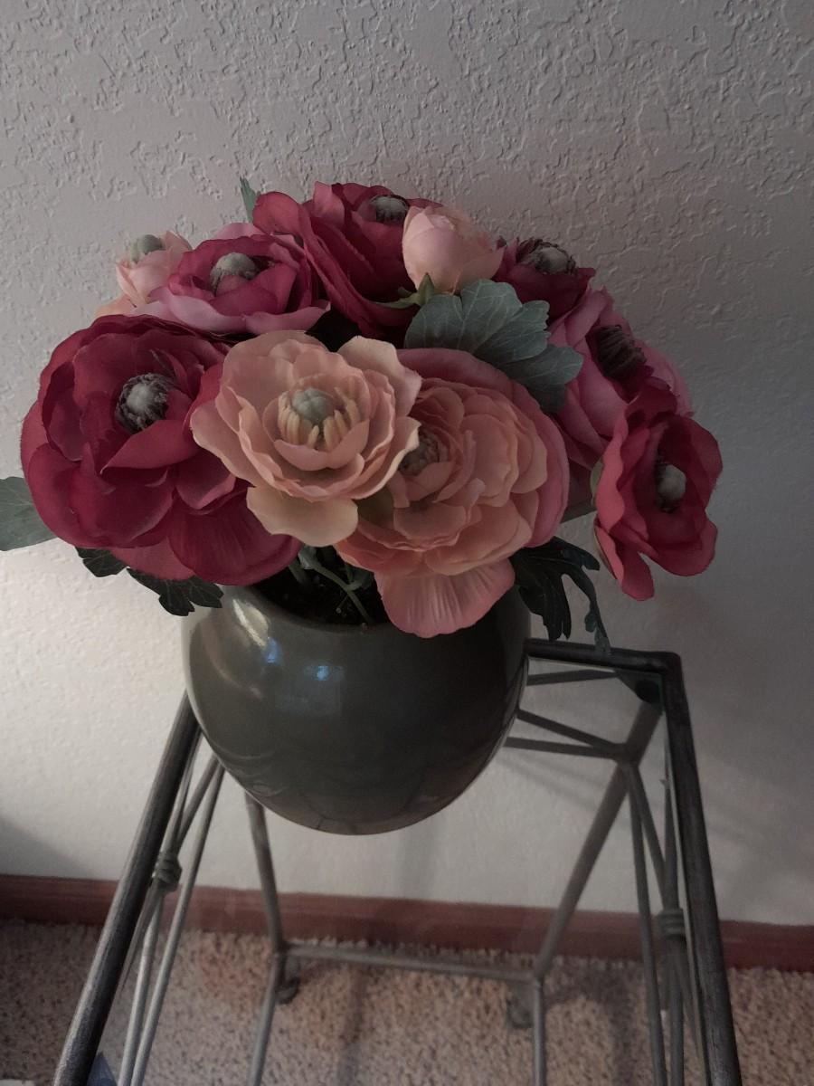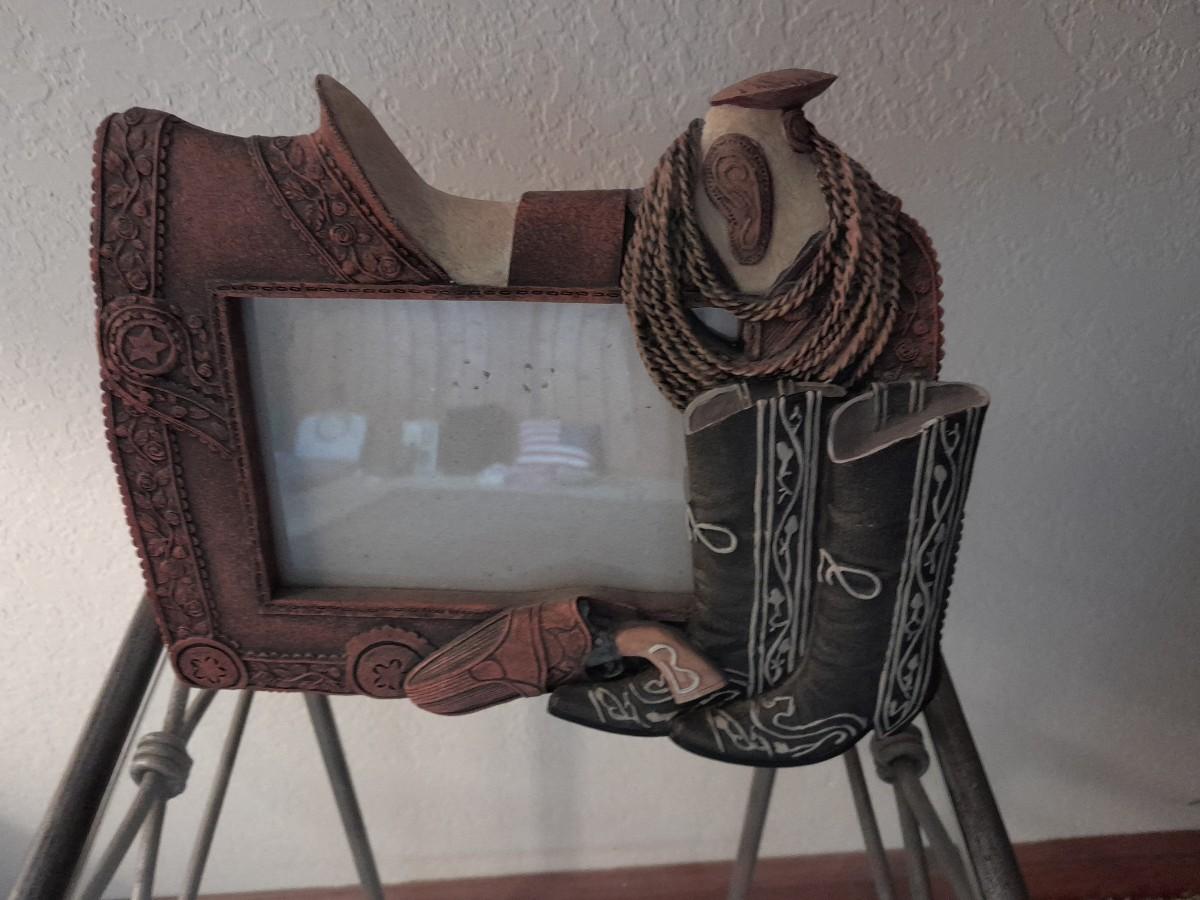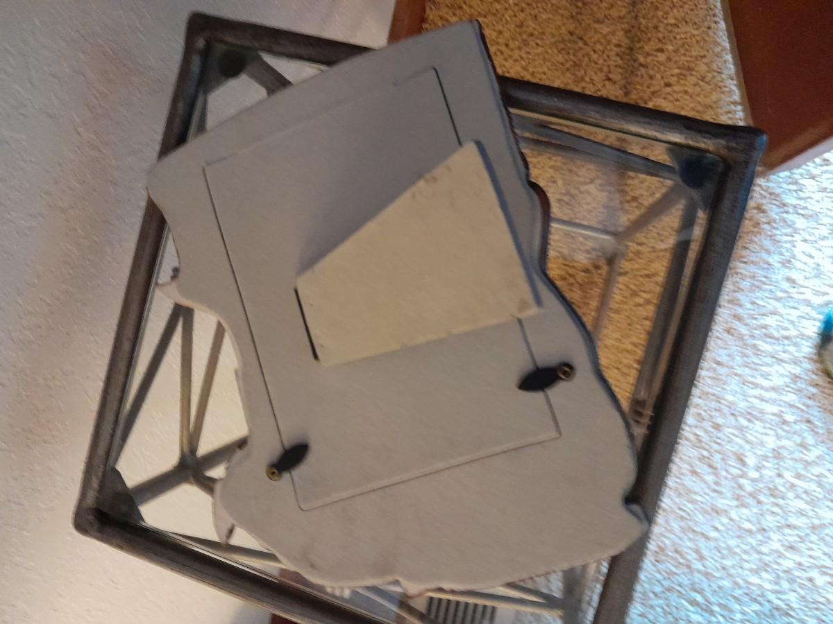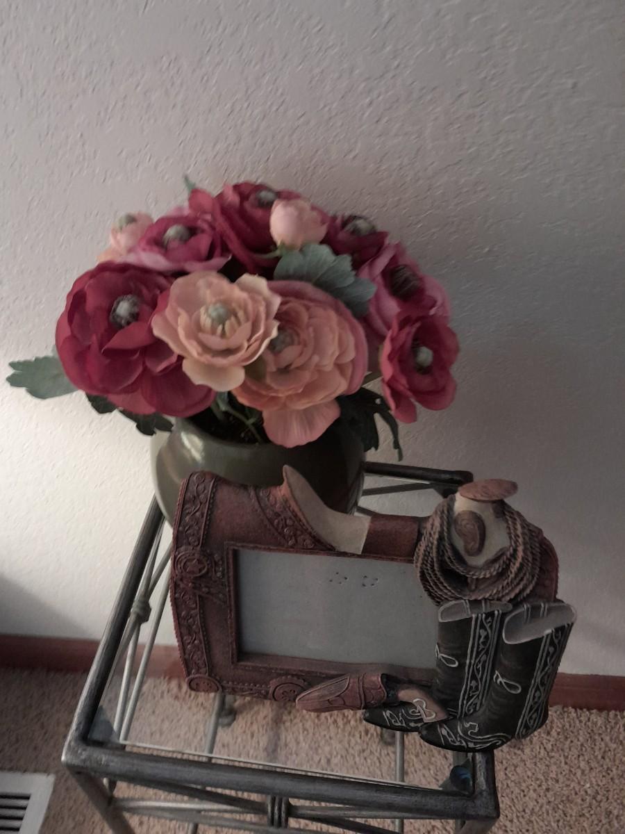 SMALL GLASS AND METAL TABLE WITH PICTURE FRAME AND FAUX FLOWERS
