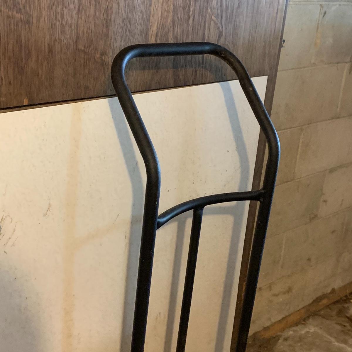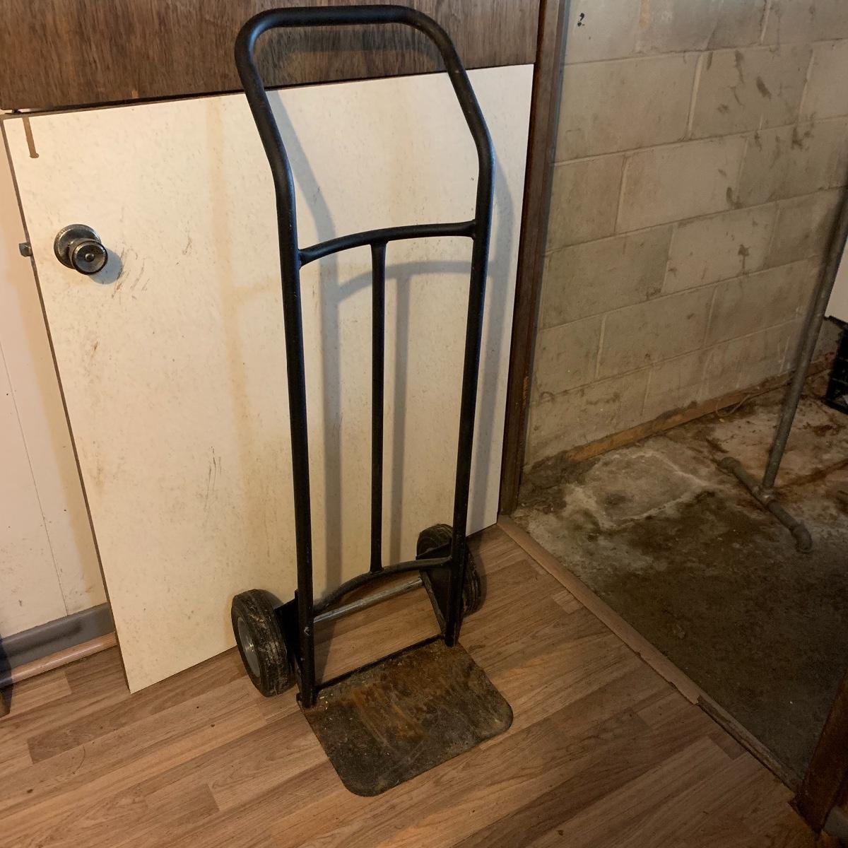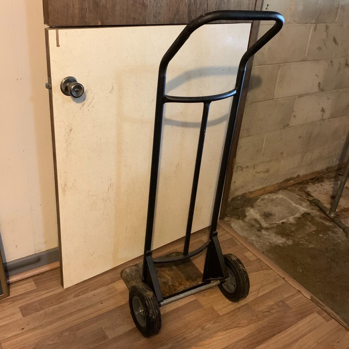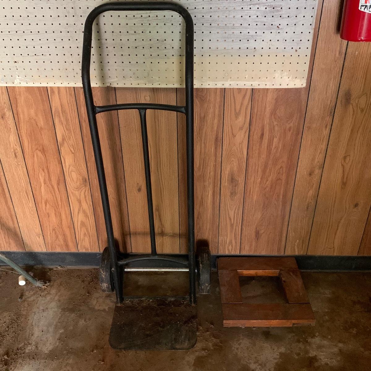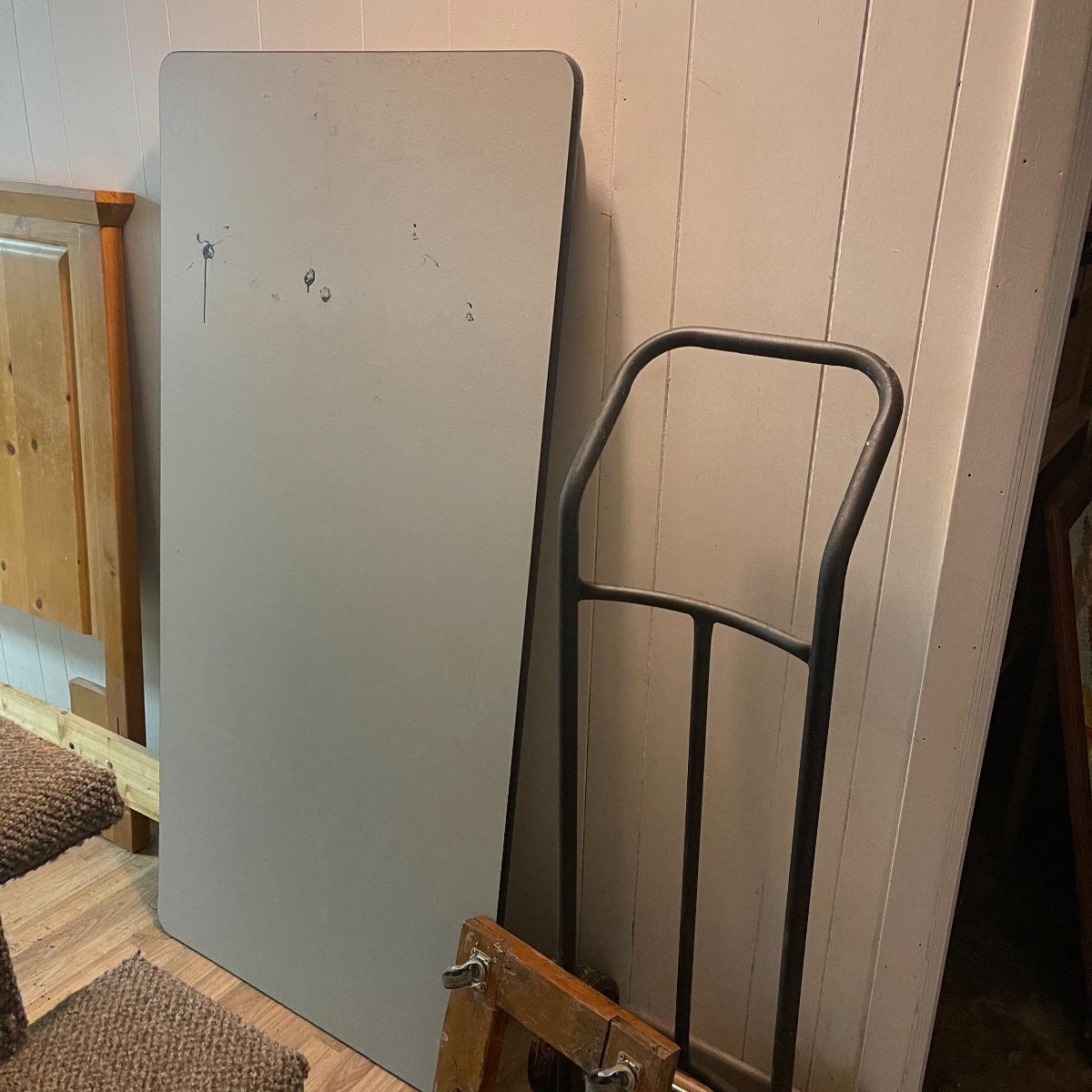 This lot includes a sturdy folding table, a metal hand truck, and a small wooden dolly. The table measures 30” x 60” and is 29.5” tall. It has a sticky substance on the surface and would benefit from a good cleaning. The hand truck is about 48” tall. The dolly measures 14.5” x 14.5”. Local pickup only.