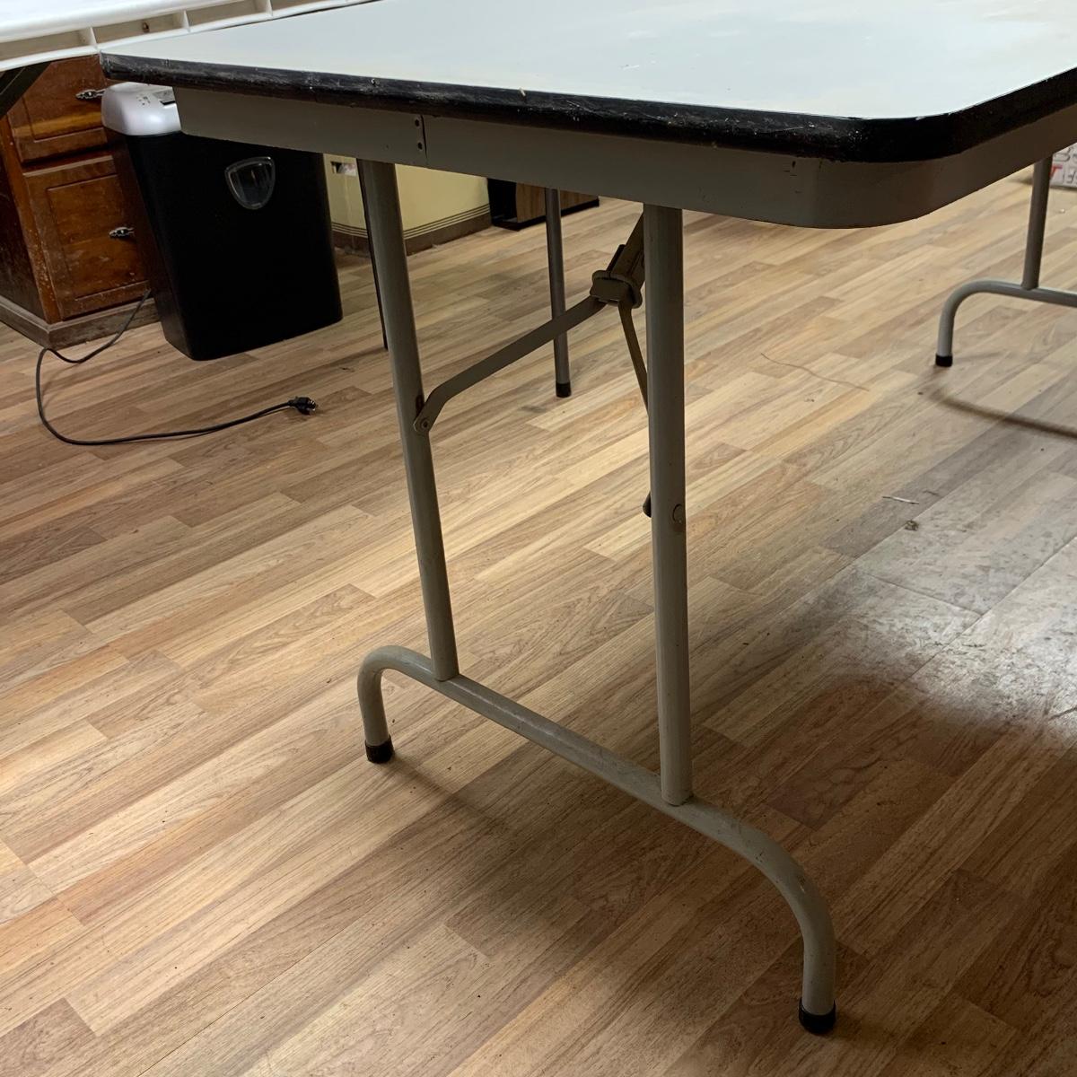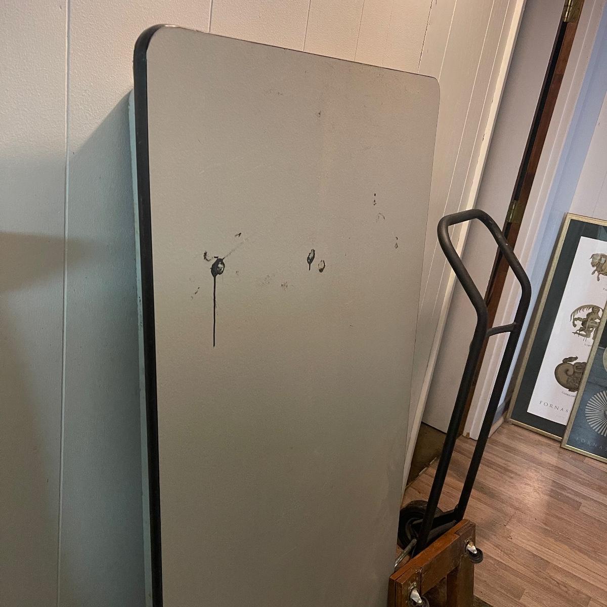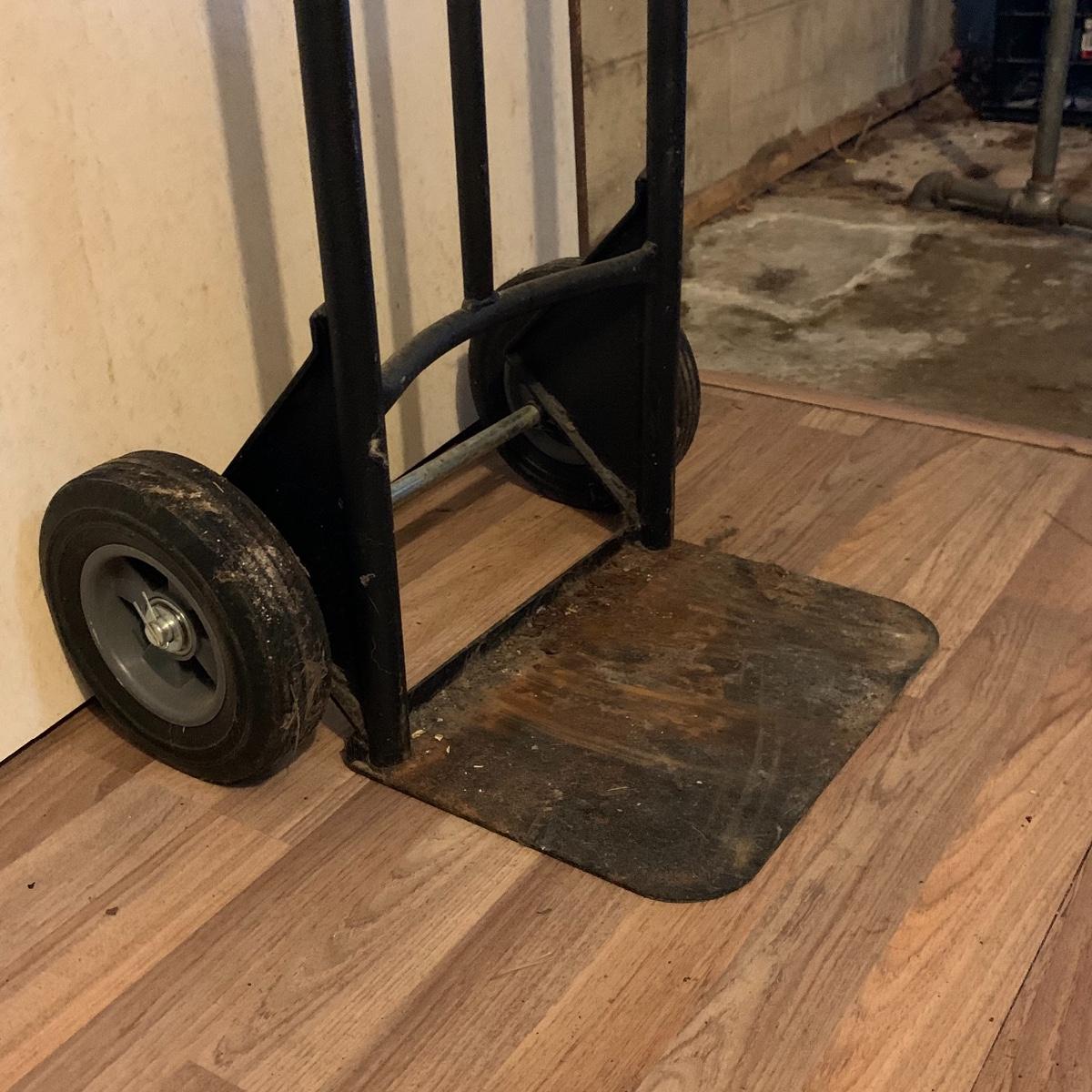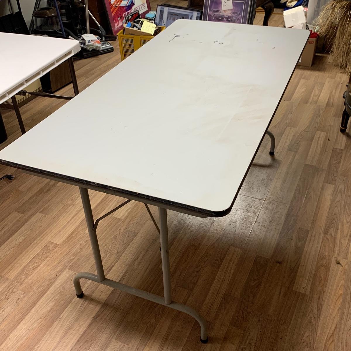 This lot includes a sturdy folding table, a metal hand truck, and a small wooden dolly. The table measures 30” x 60” and is 29.5” tall. It has a sticky substance on the surface and would benefit from a good cleaning. The hand truck is about 48” tall. The dolly measures 14.5” x 14.5”. Local pickup only.