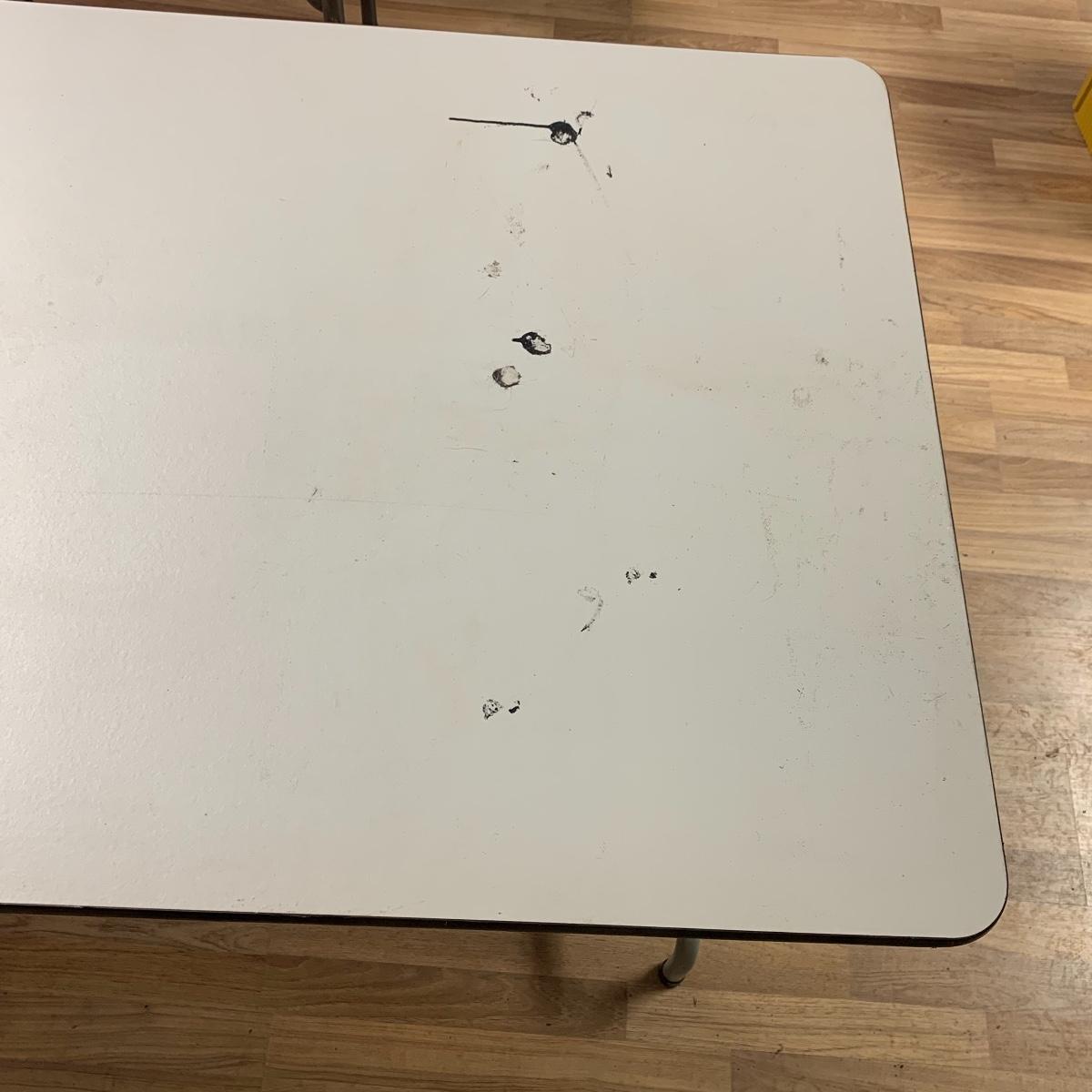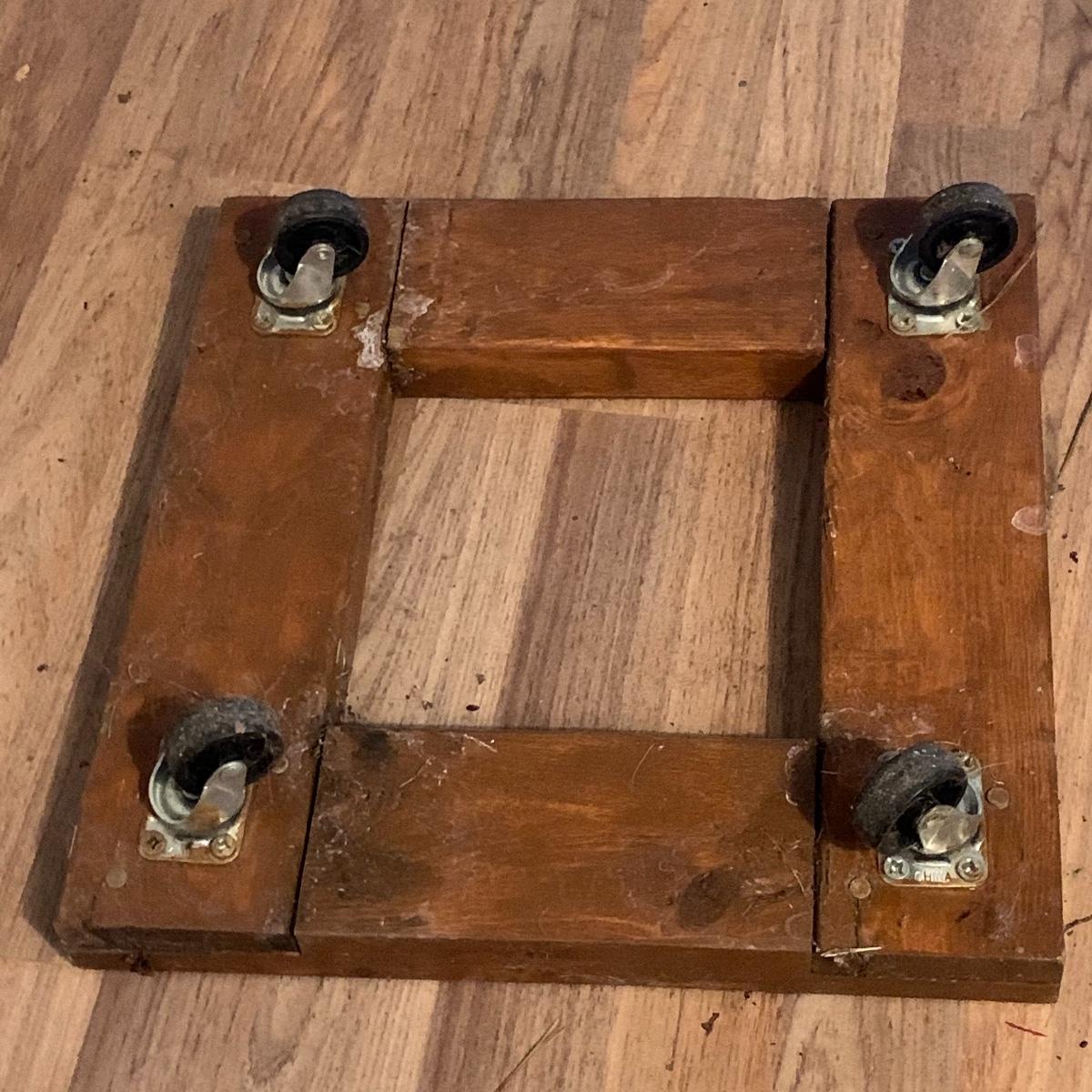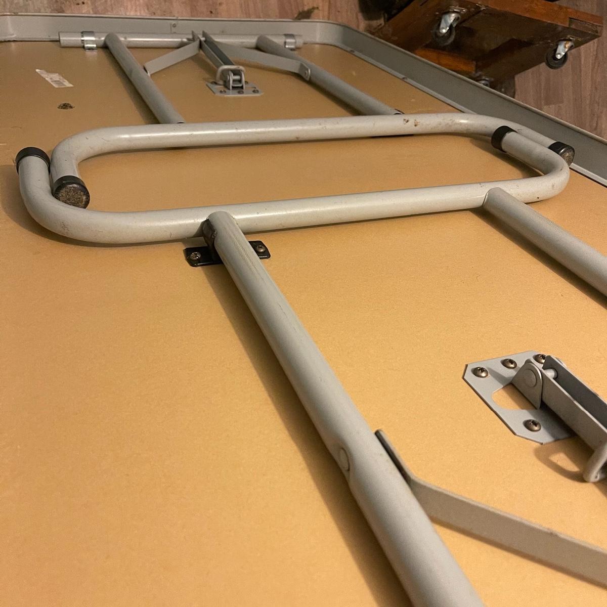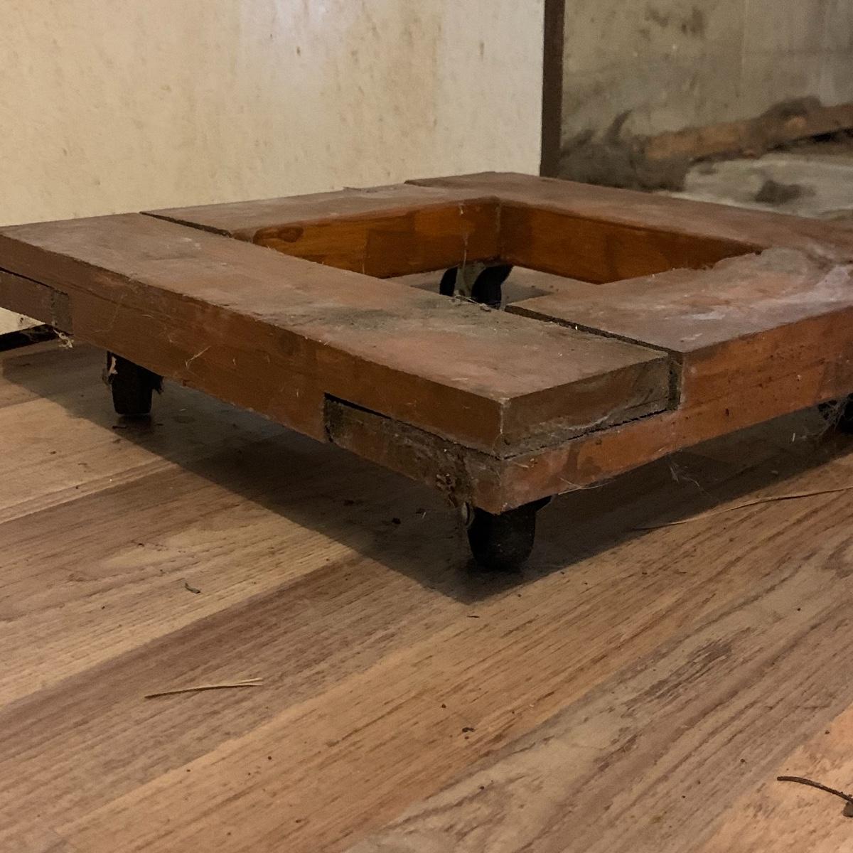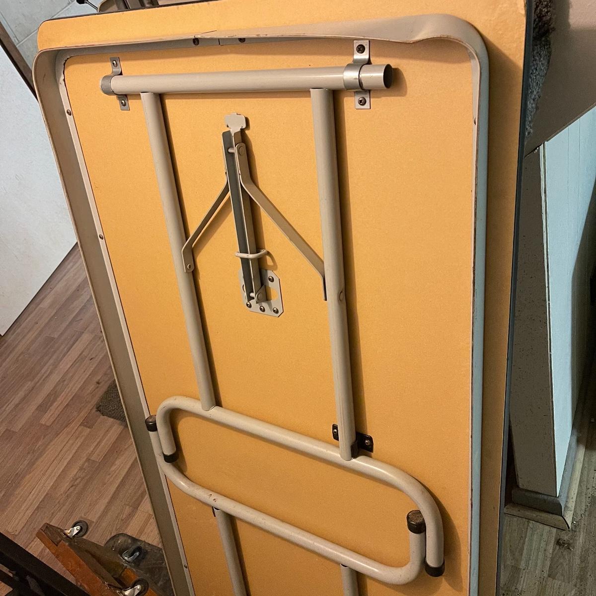 This lot includes a sturdy folding table, a metal hand truck, and a small wooden dolly. The table measures 30” x 60” and is 29.5” tall. It has a sticky substance on the surface and would benefit from a good cleaning. The hand truck is about 48” tall. The dolly measures 14.5” x 14.5”. Local pickup only.