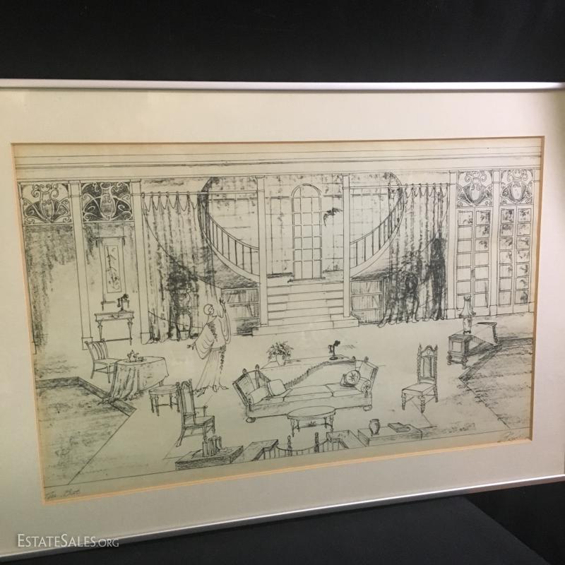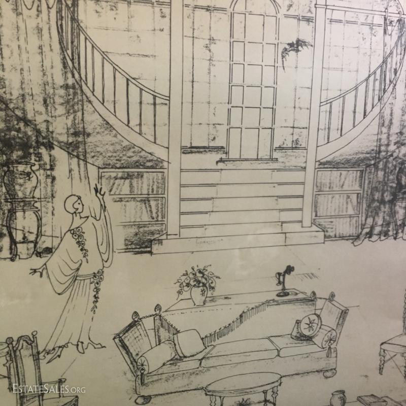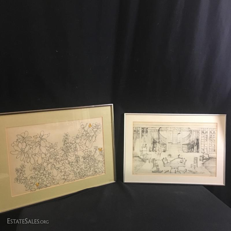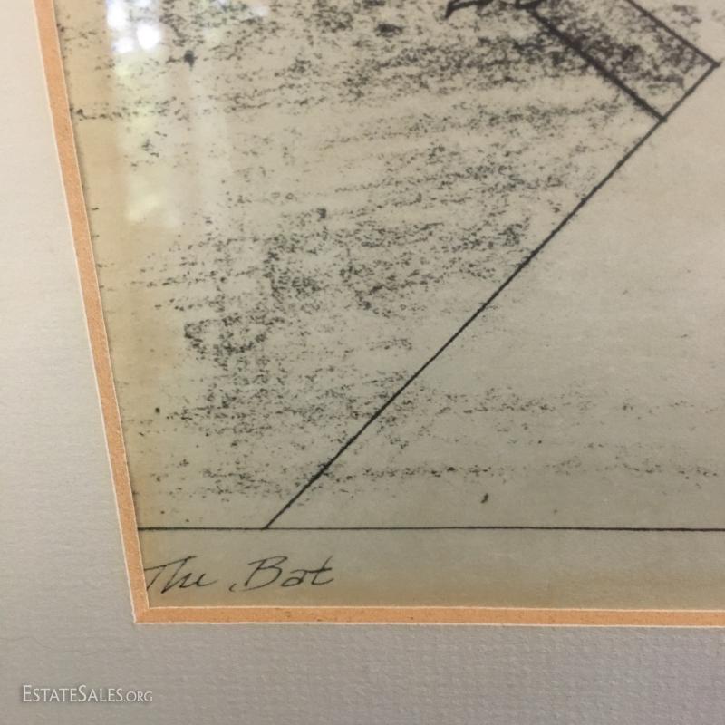 Two silver framed drawings. One is of a wealthy woman in a mansion with a bat flying in the center. It is signed by illegible artist name (see photos) and called "The Bat" 20"l x 14"w