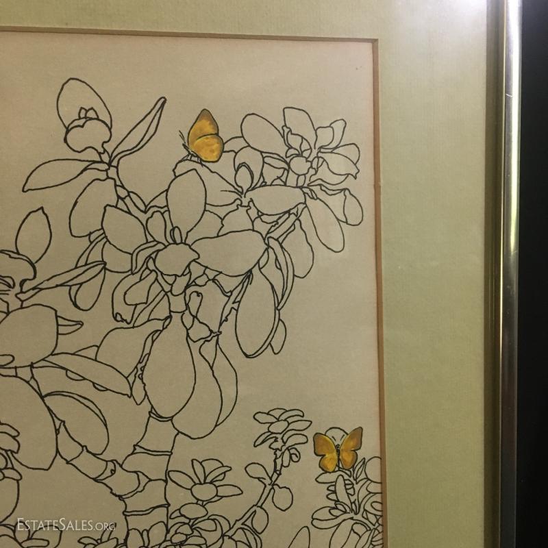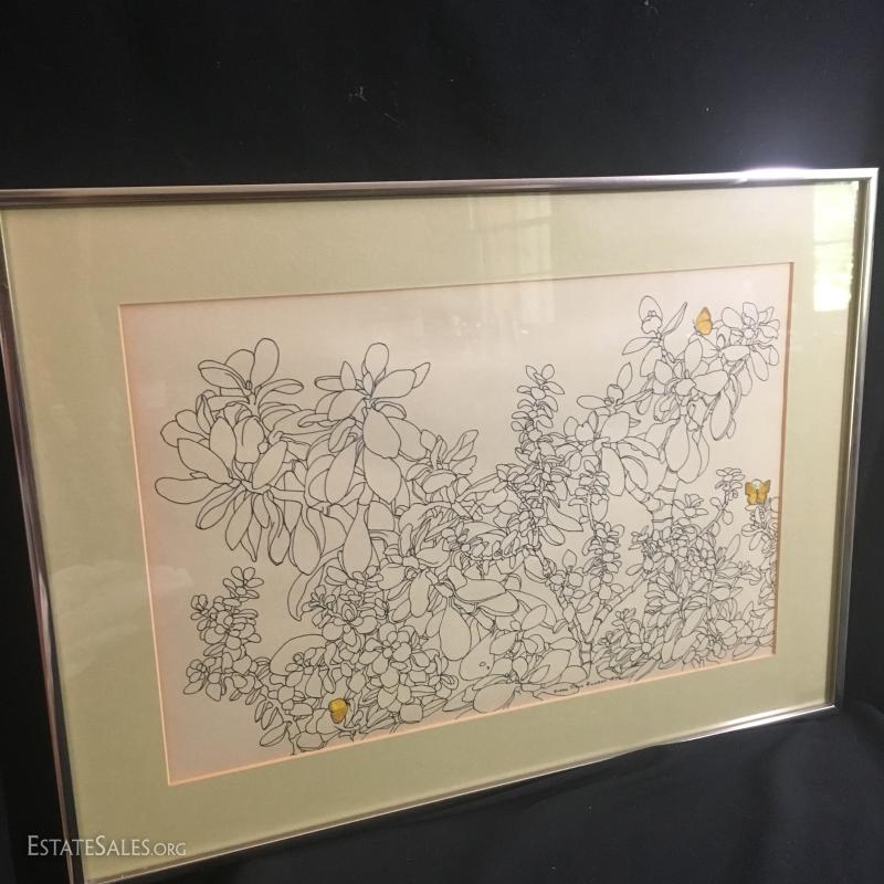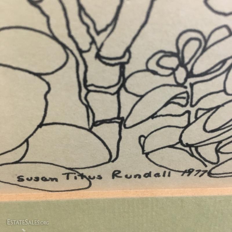 The other drawing is signed Susan Titus Rundall 1977. Has accents of yellow butterflies within black and white drawing. 22.5"l x 16.5"w