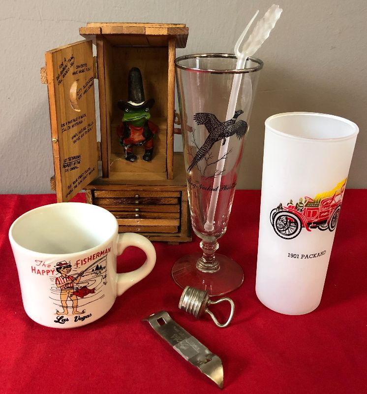 Lot 192 Vintage Drinking: Coaster, can opener, cup (offensive)