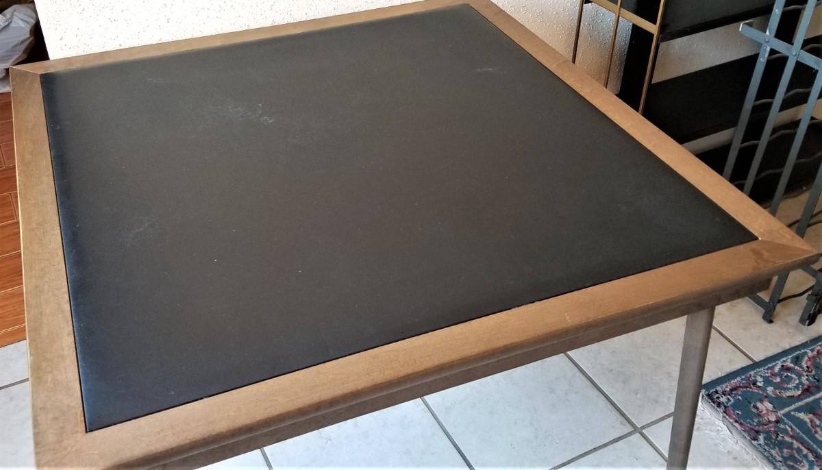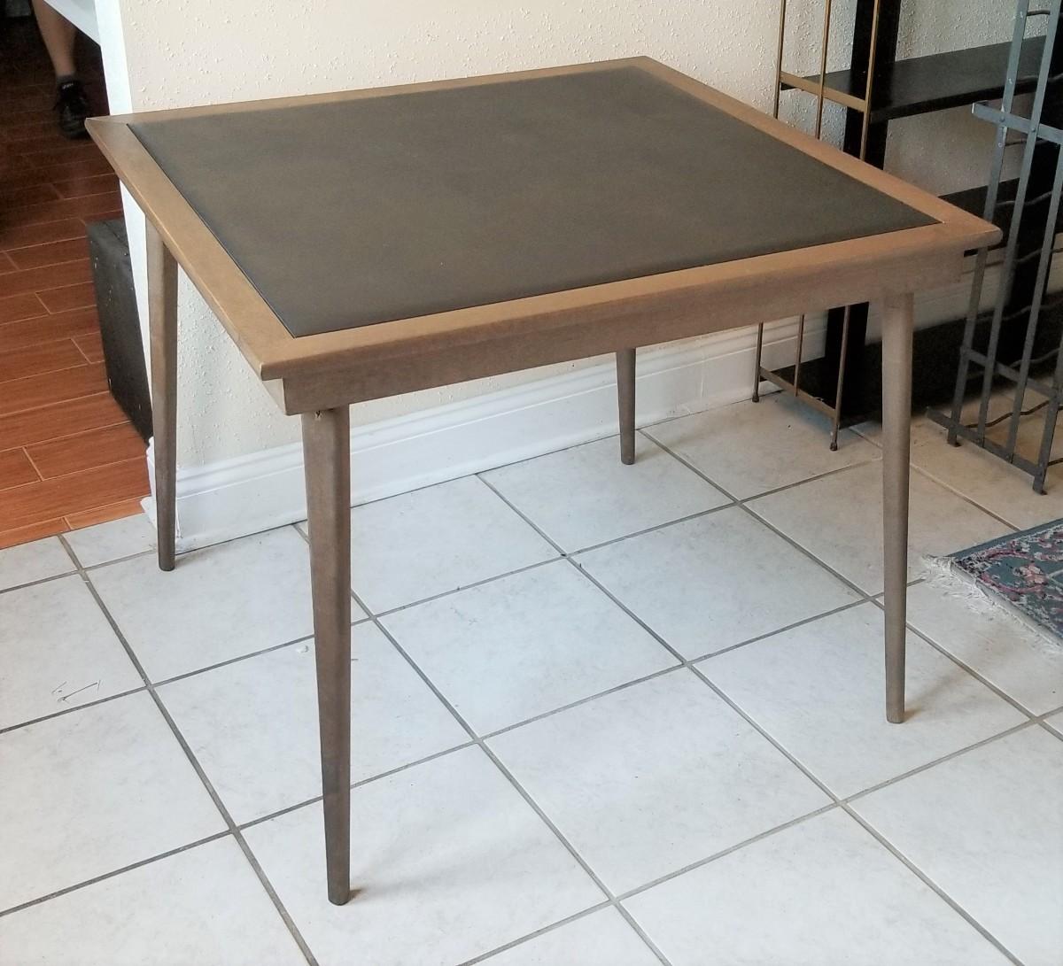 Vinyl top, folding card table - heavy - vintage. Good used condition - 28" tall, 34" x 34".