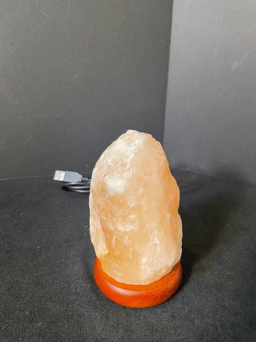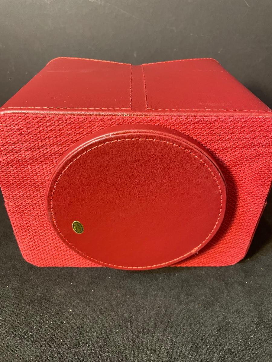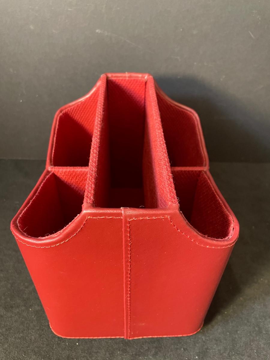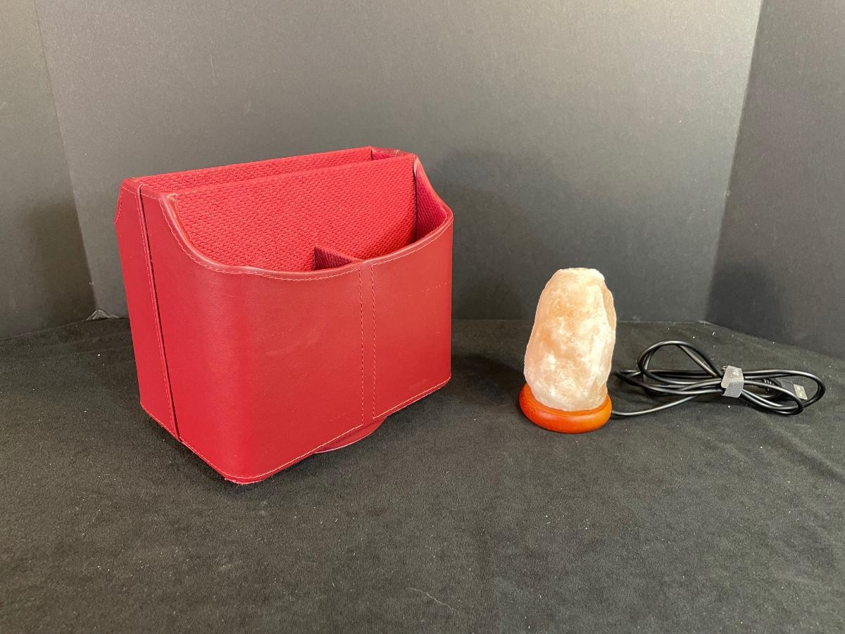 Red Leather (?) swivel caddy for your TV remote control devices AND a small Himalyan salt lamp