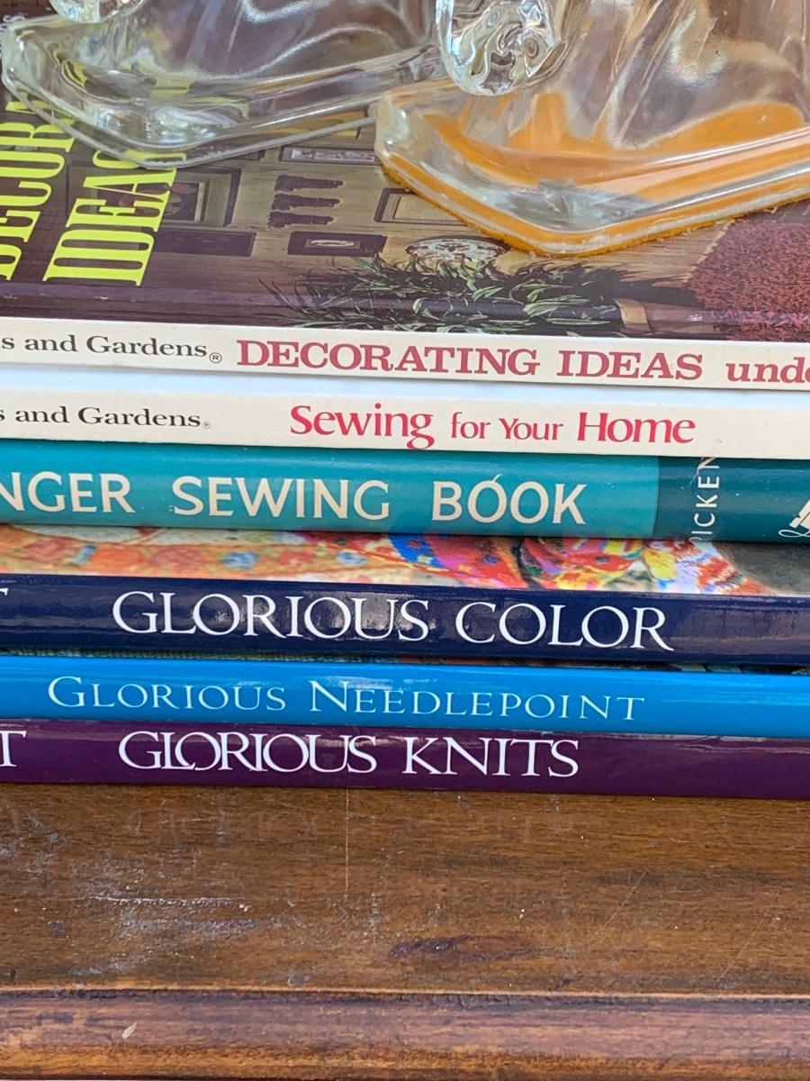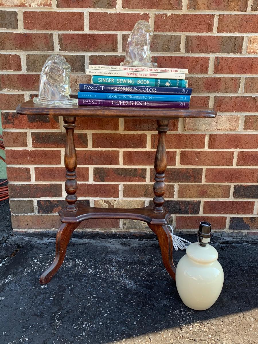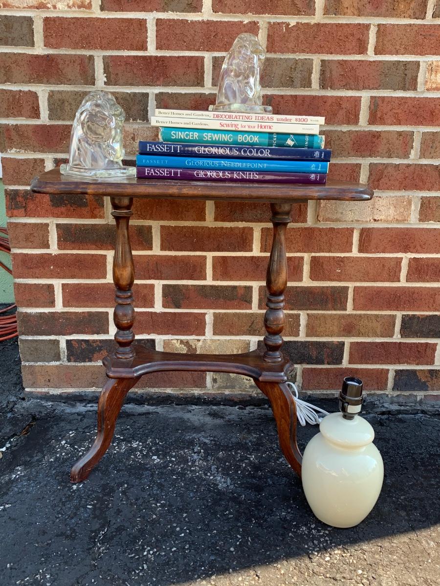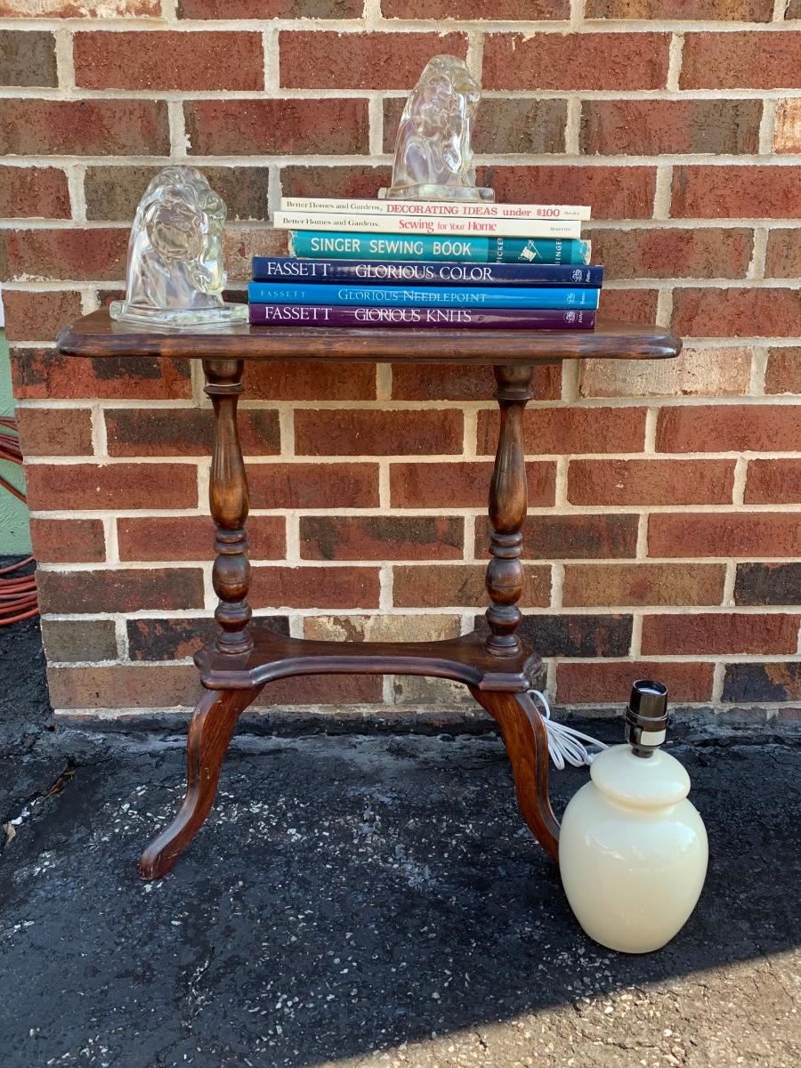 Includes table, lamp with no bulb, two clear horse head bookends and a small collection of craft books.