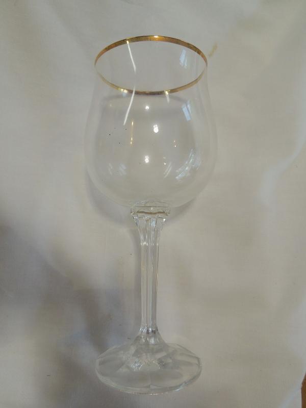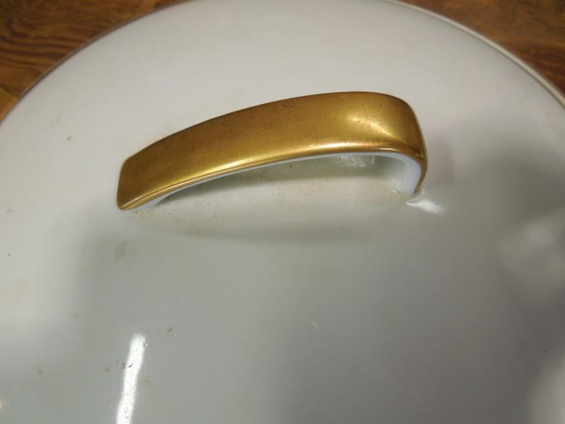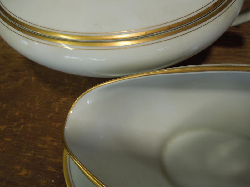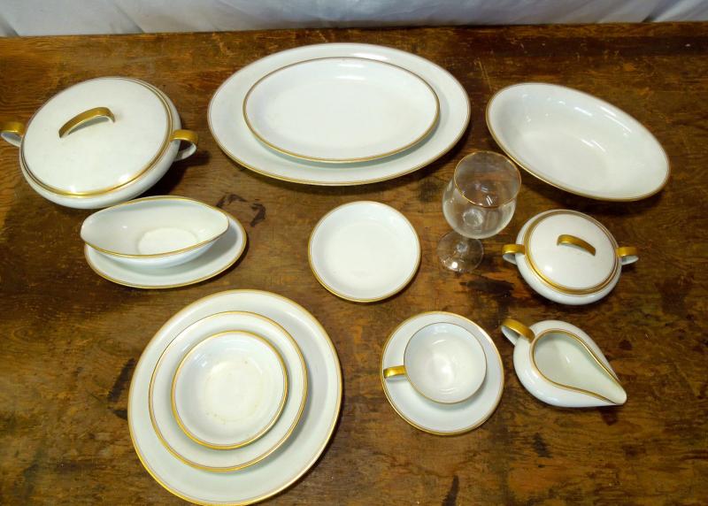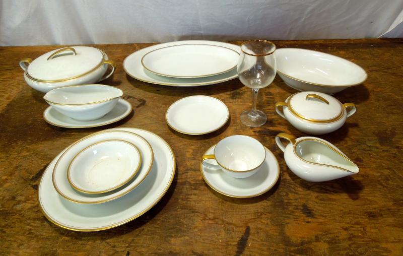 16" and 14" oval serving platters; 10" oval serving bowl; 9" covered csserole; gravy bowl; covered sugar and cream; twelve 10" 8" and 6" plates; twelve cups and saucers; .5" and 5.5" bowls; 12 crystal goblets with gold rim. Very little wear to gold rims. these are absolutley stunning! Complete set not shown. Each piece checkd and no cracks or chips found. NOTE: Shipping on this item will be costly. A conservative estimate since it is in 4 boxes is $110 to $125. Please call UPS store (828) 252-6930 to get an estimate BEFORE bidding if in doubt.