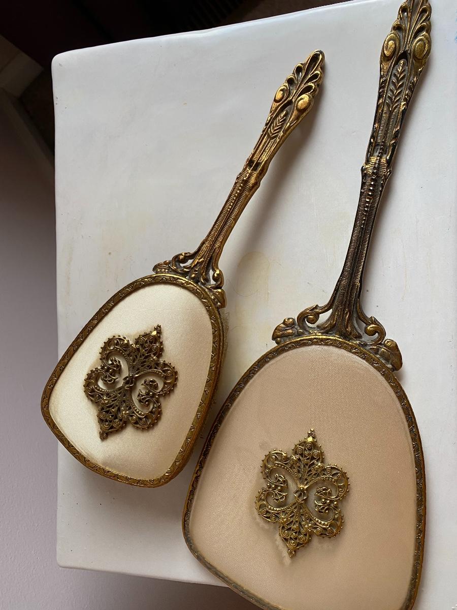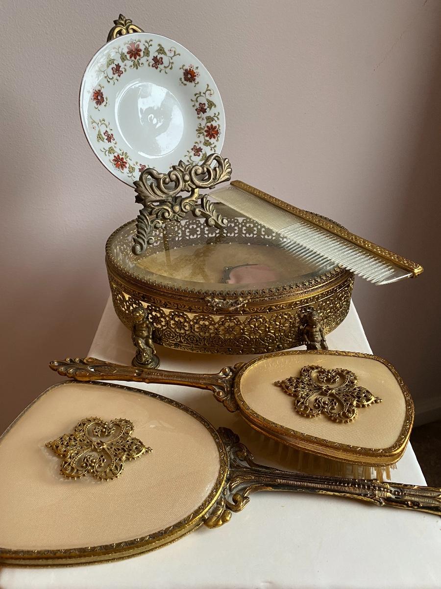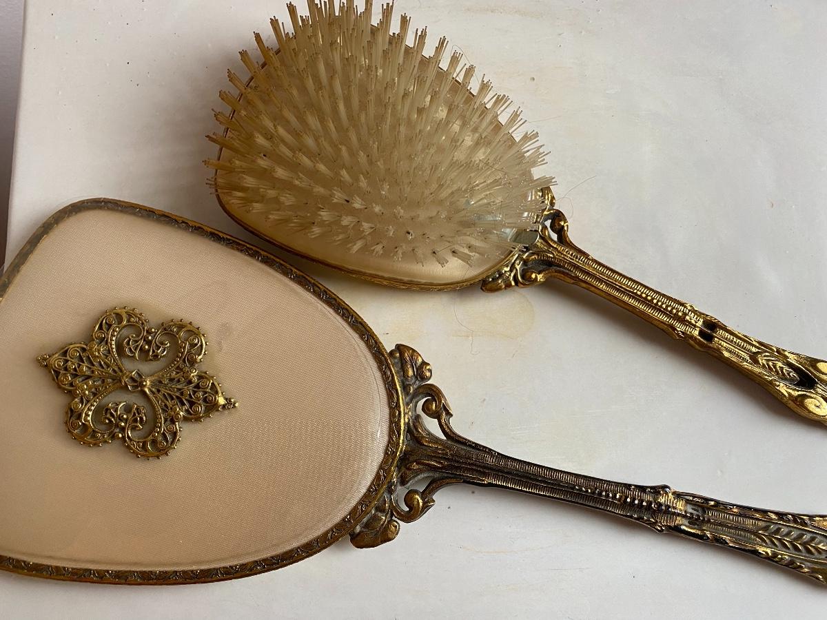 Lovely vintage vanity pieces, the gold accents on the hand mirror and brush were loose and may need to be glued back on, easy fix. Please see all pictures as they are the best representation of the items in the lot, the condition of the lot, and will show measurements if taken. If purchasing furniture you must be able to move yourself with your own help, and truck. This is located on the first floor.