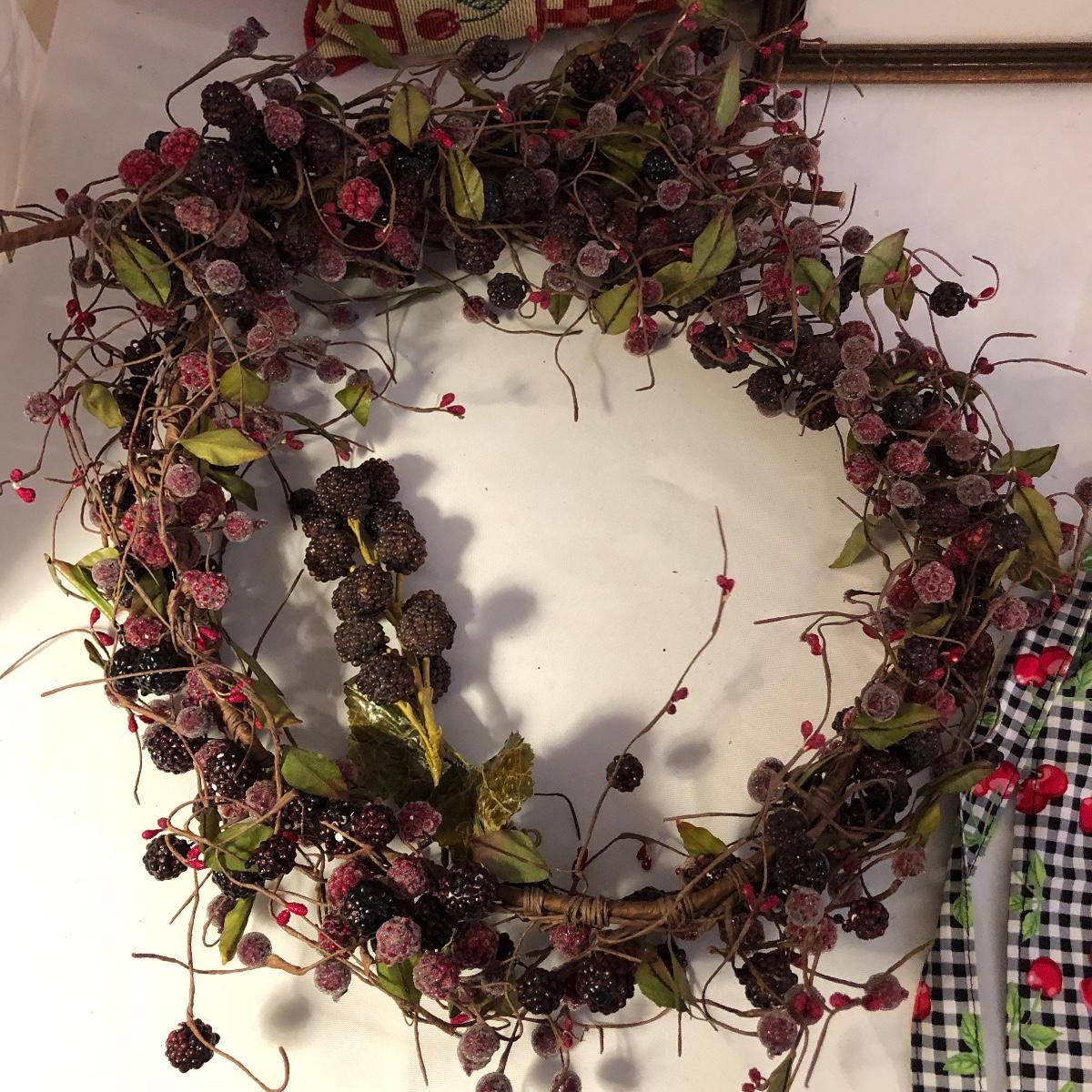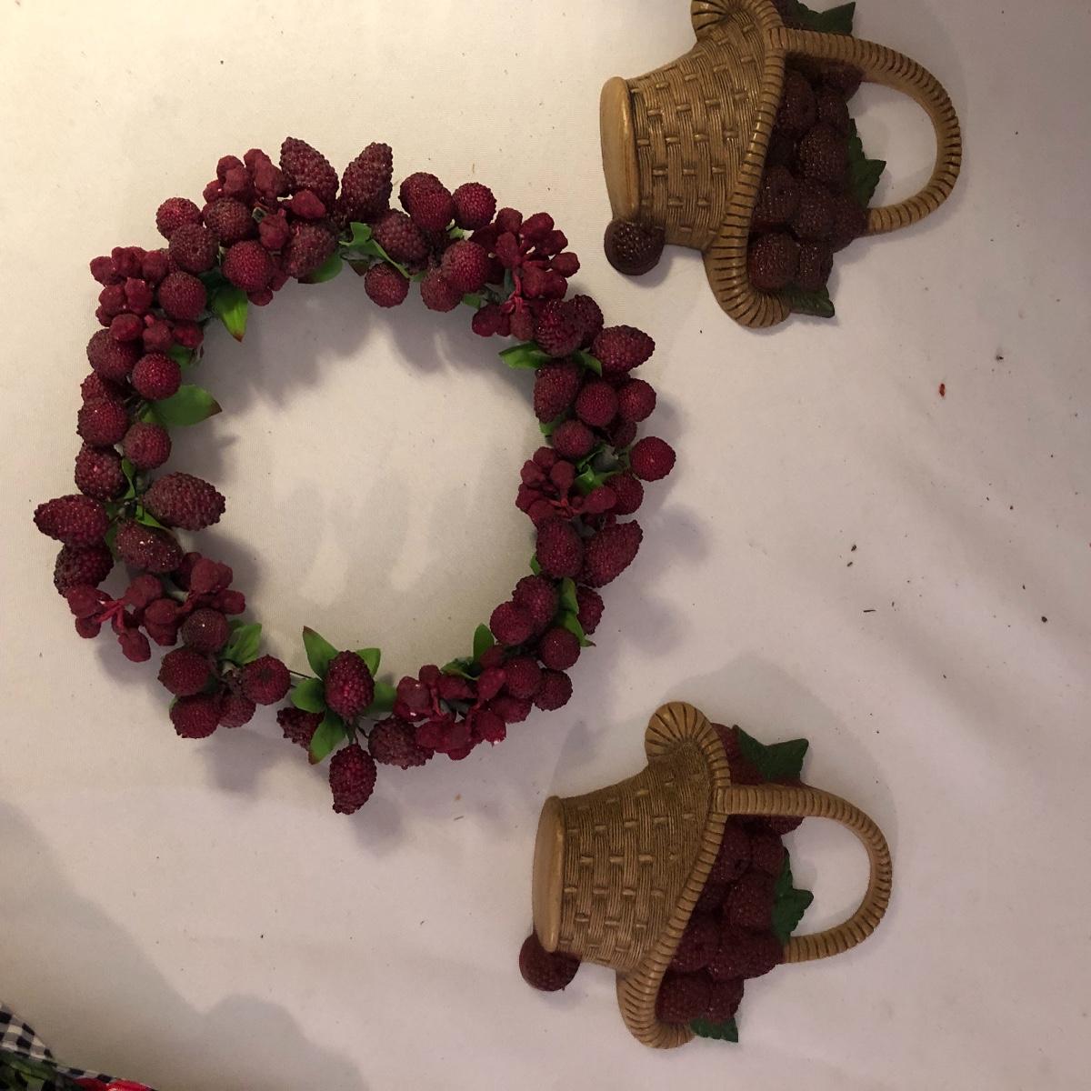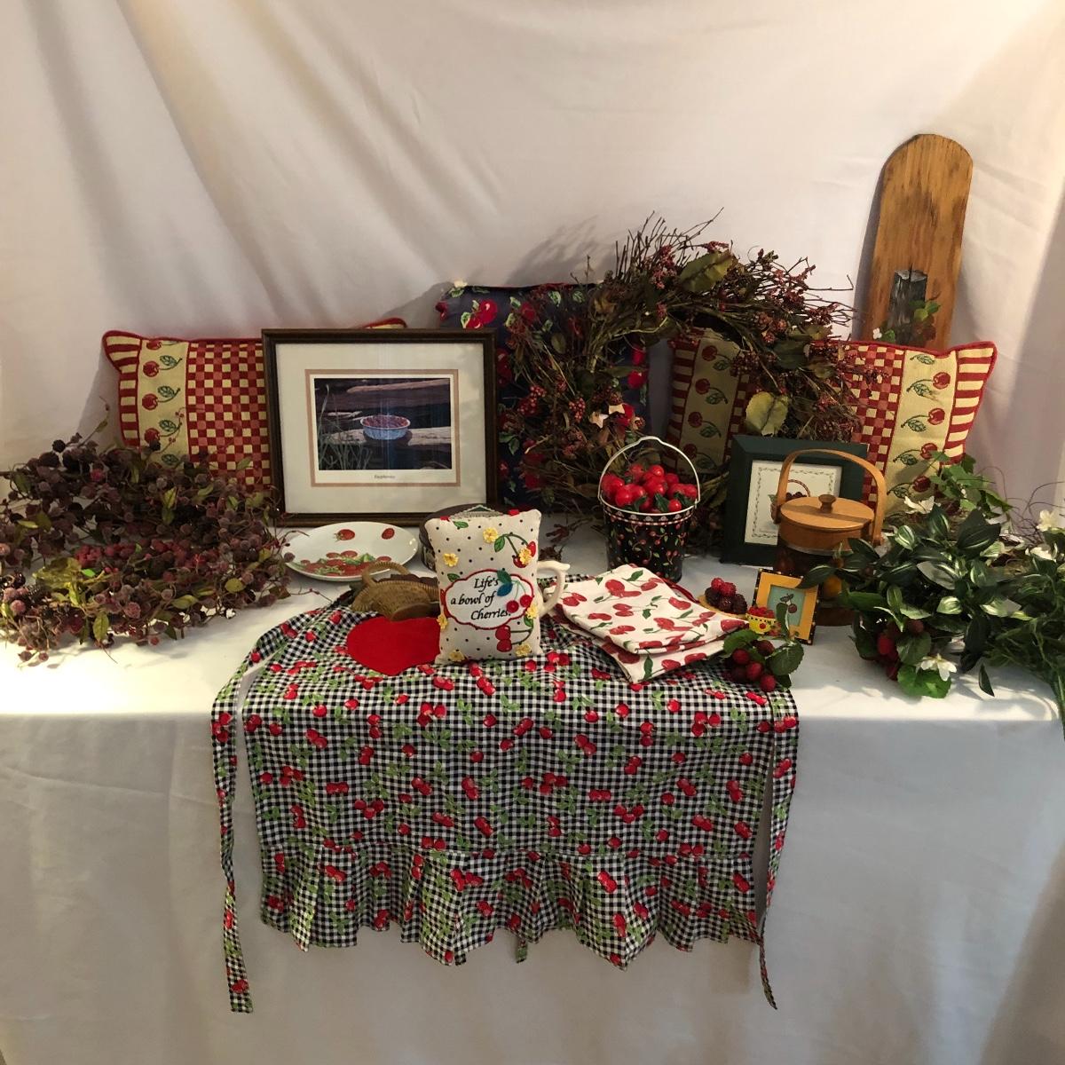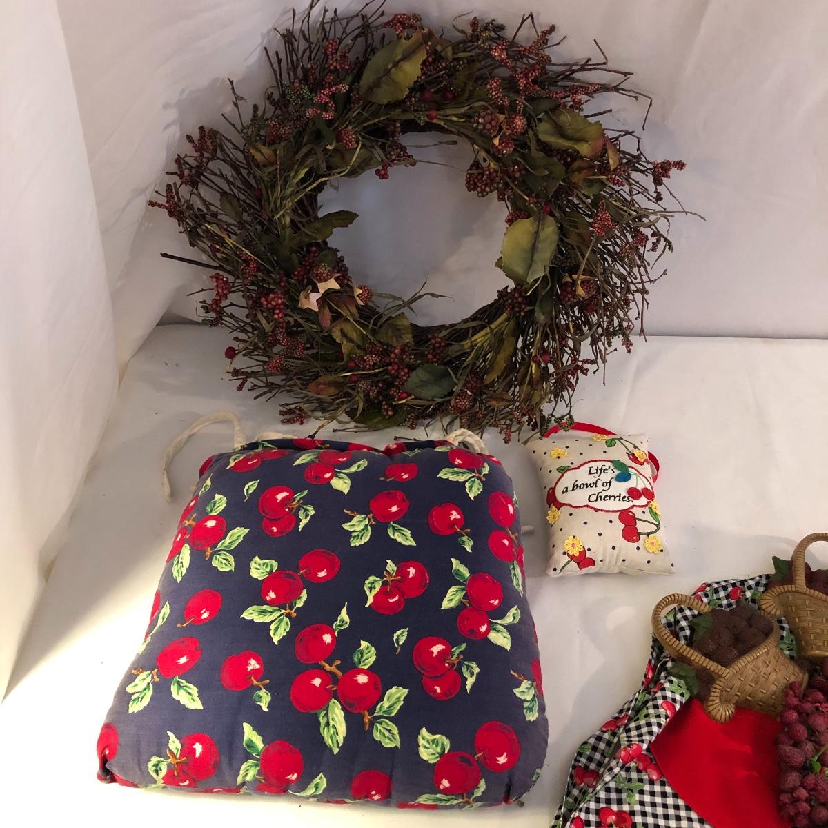 This lot is as delicious as the fruits it’s the theme of! A fairly equal amount of cherry adorned decor to raspberry, this lot has a framed print of a bowl of raspberries (artist unknown), lots of wreaths, a wood decorative piece, pillows, a few cherry napkins and much more (see images).
