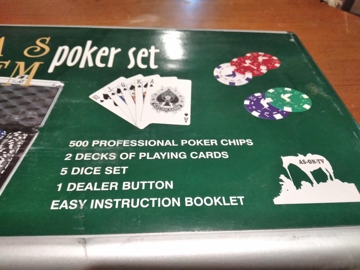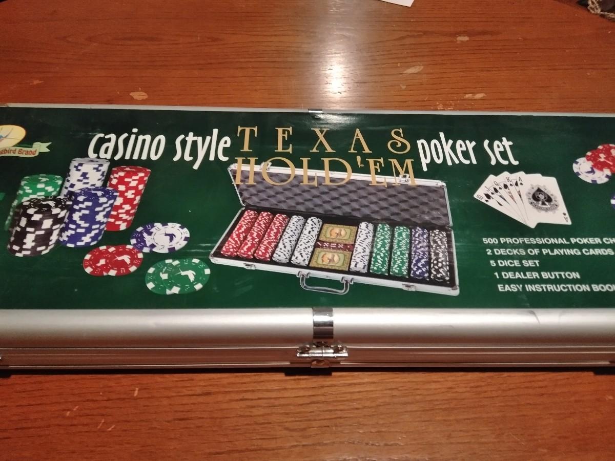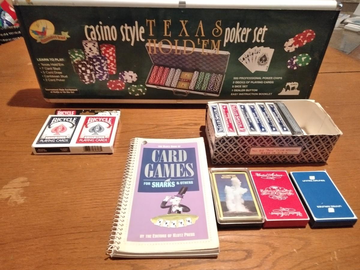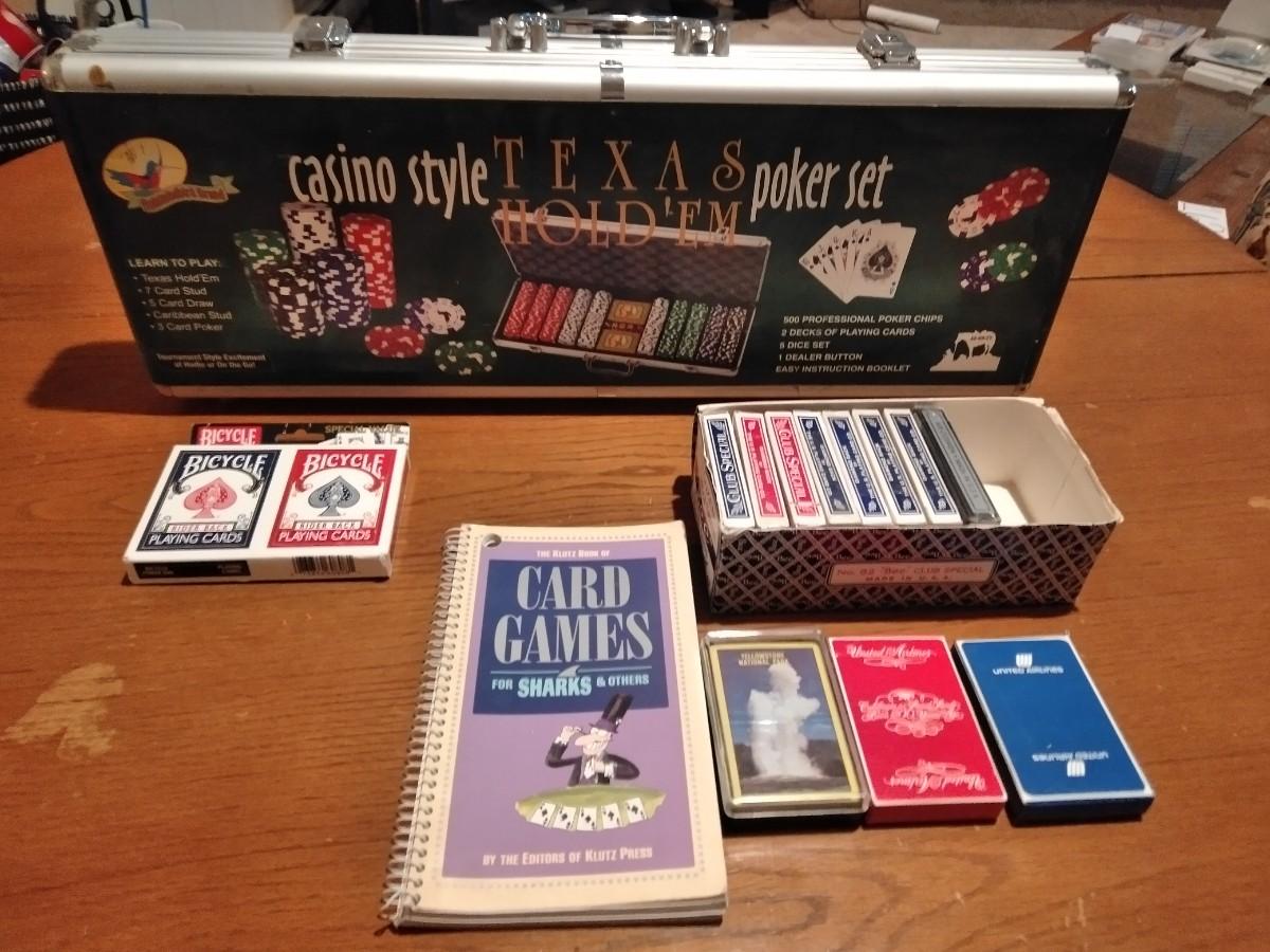 NEW, NEVER OPENENED CASINO STYLE TEXAS HOLD'EM POKER SET , COMES WITH MANY DECKS OF CARDS, AND A CARD GAMES BOOK.