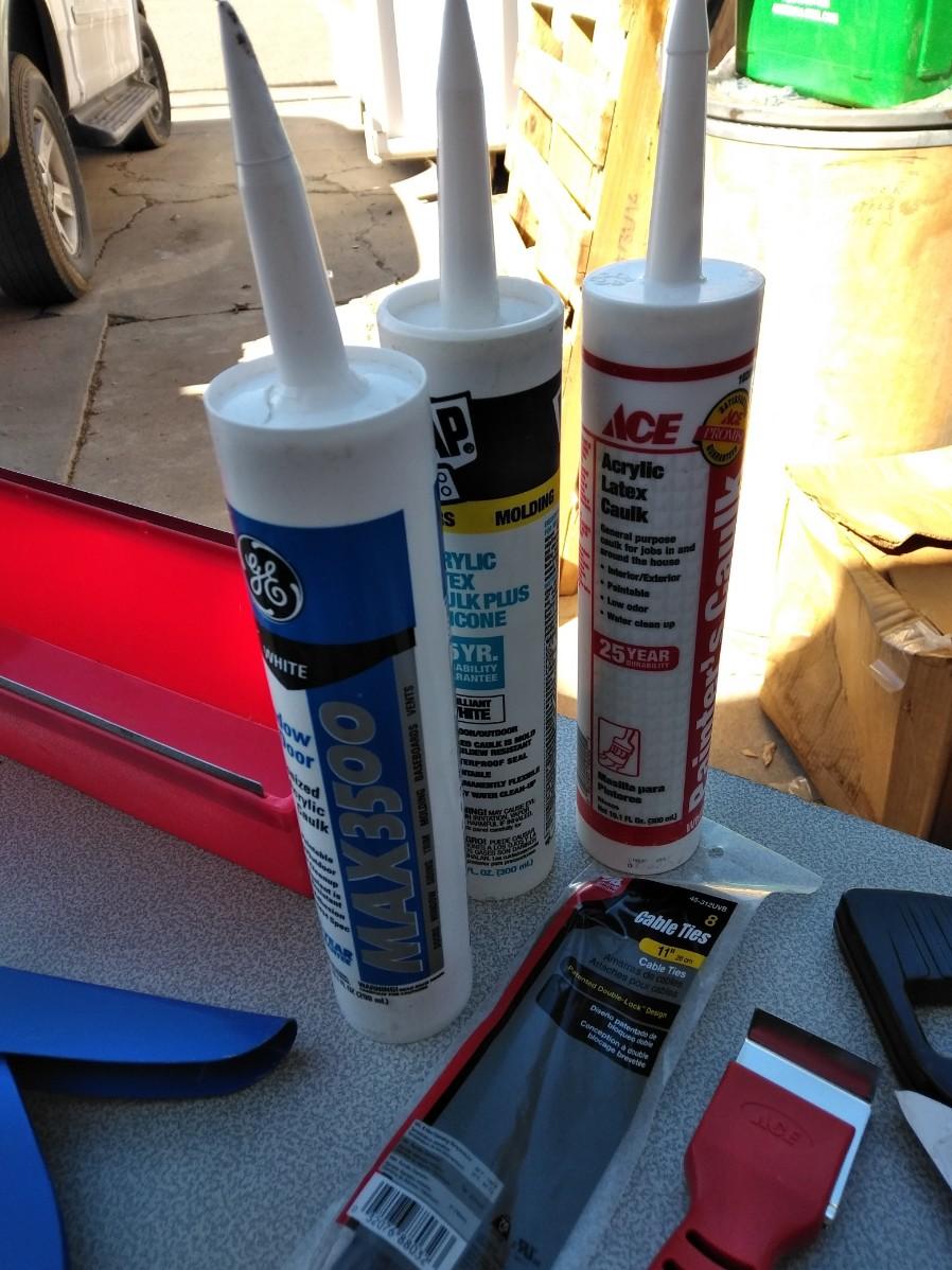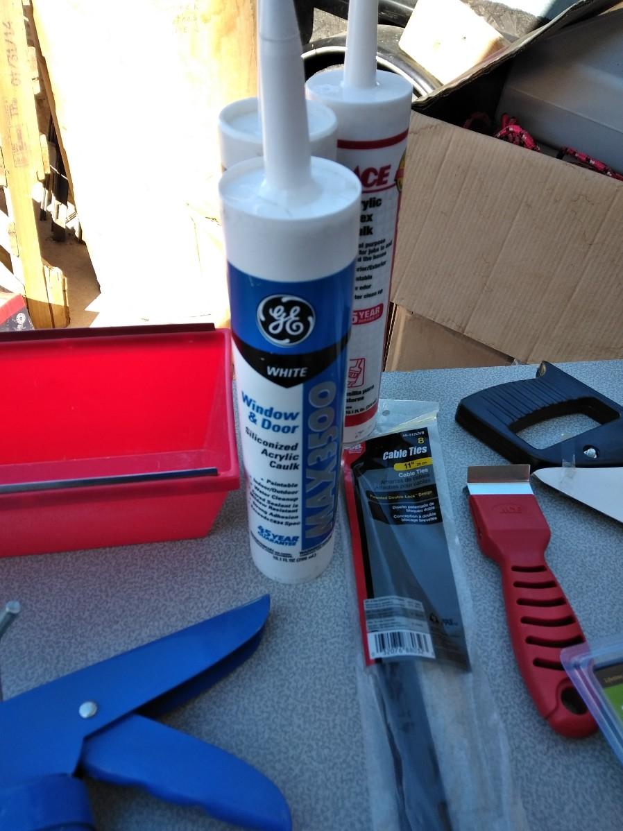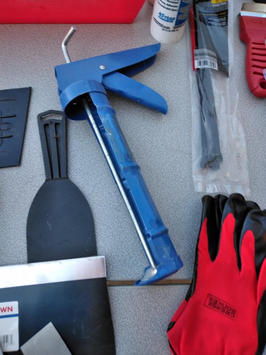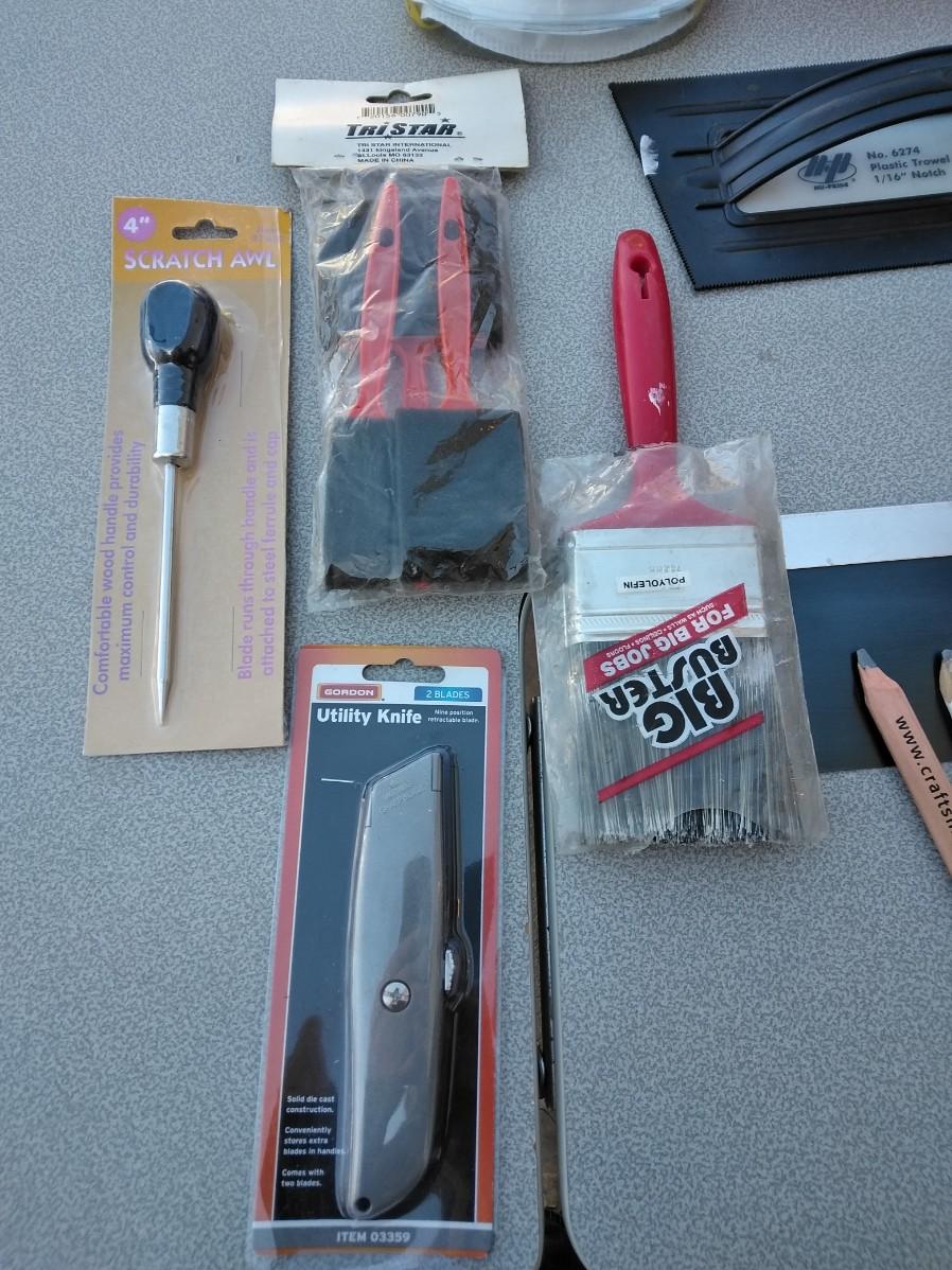 VARIETY OF PUTTY KNIVES, PAINT SPONGES AND BRUSHES, CAULKING GUN, MUD TRAY AND MORE