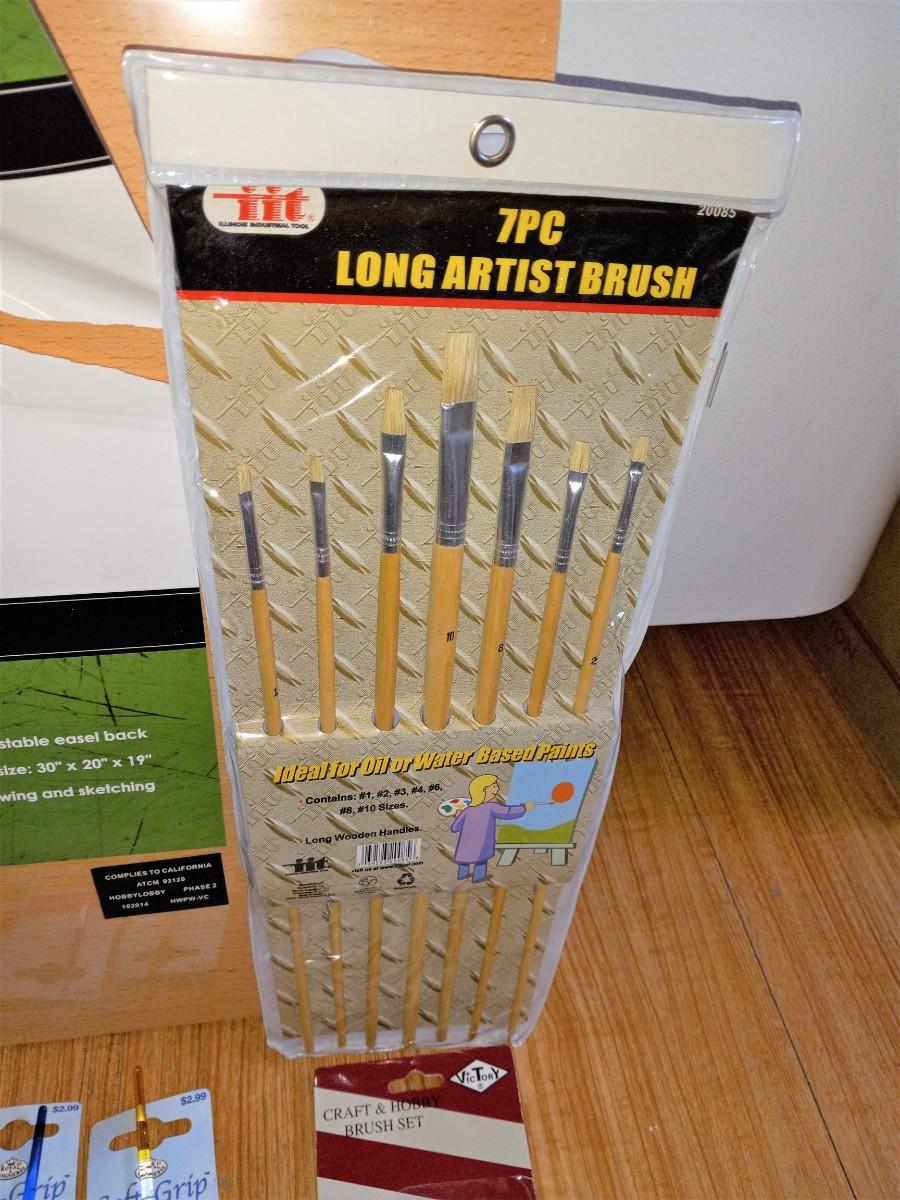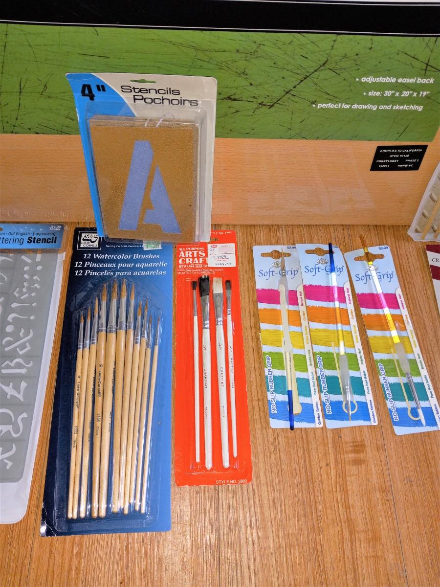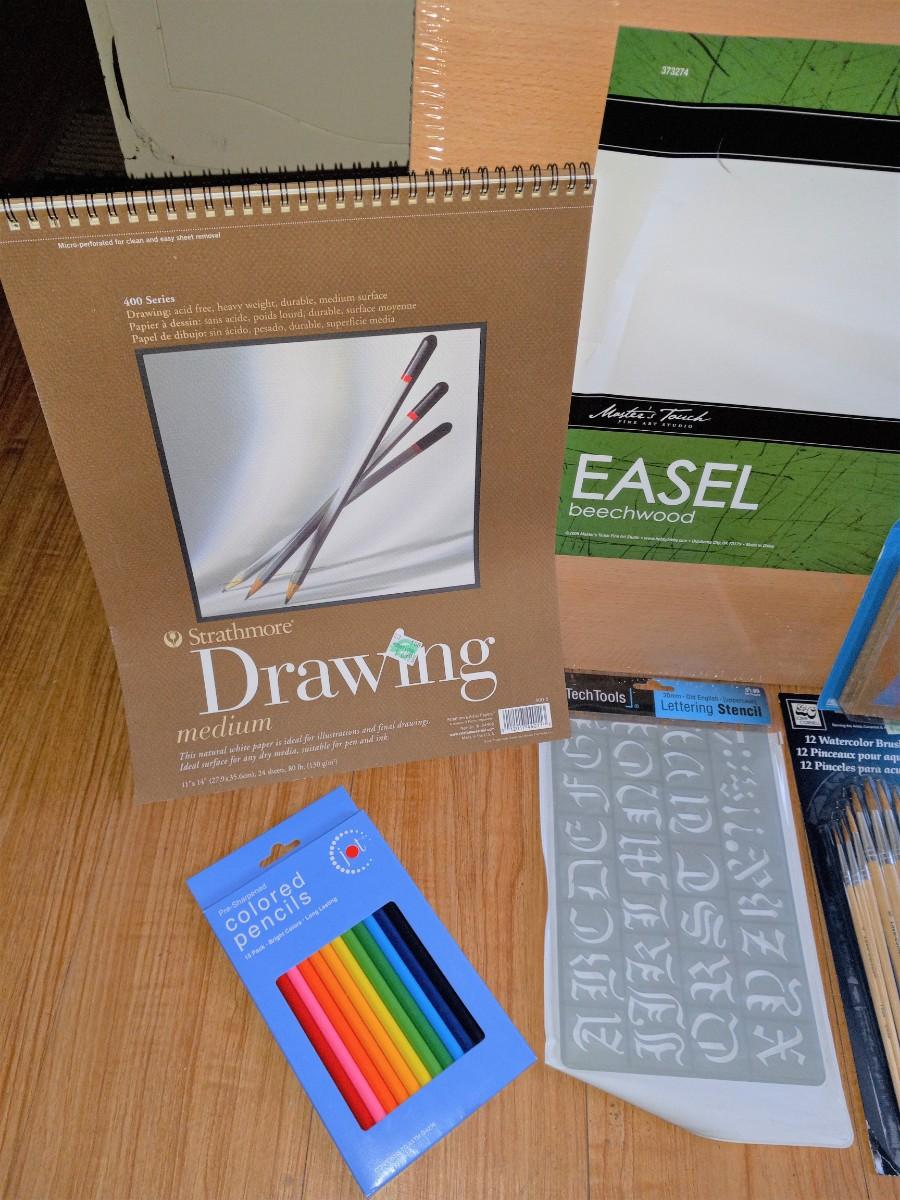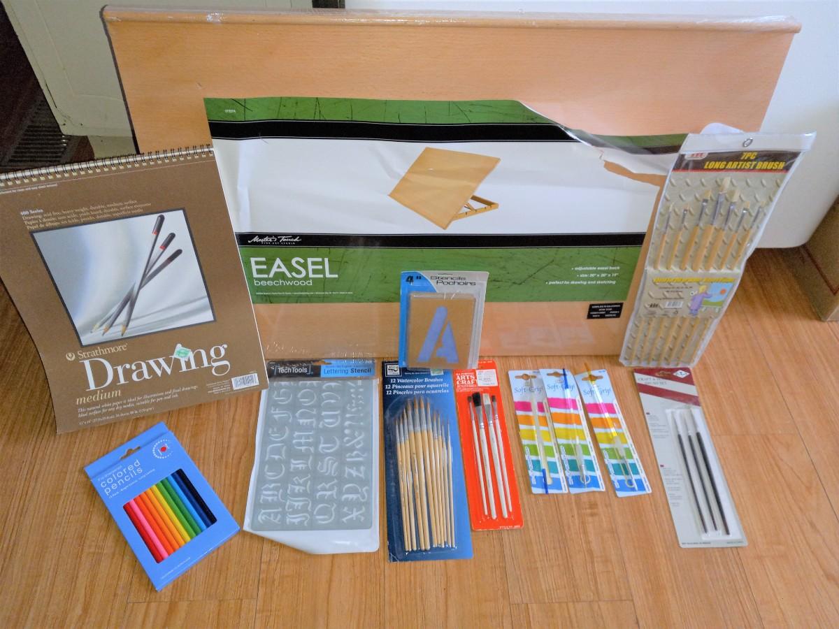 ADJUSTABLE EASEL, PAINT BRUSHES, DRAWING PAPER, COLORED PENCILS