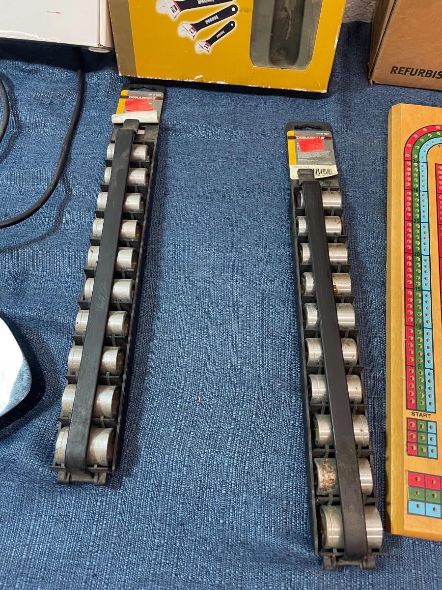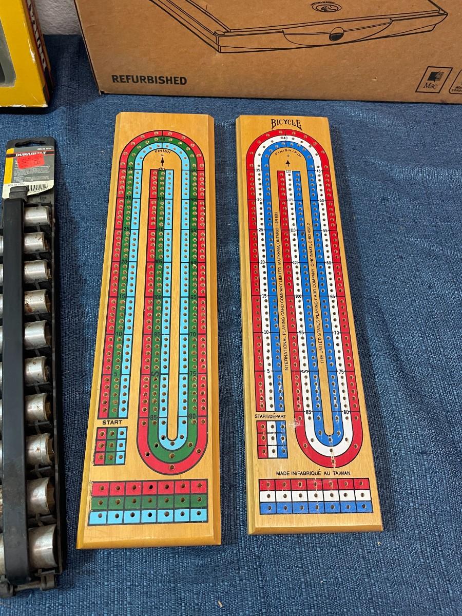 LOT 193. LARGE MISC LOT INCLUDING ROKU, TOOLS, SCANNER, CRIBBAGE BOARDS & MORE