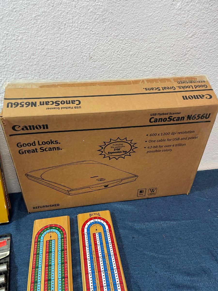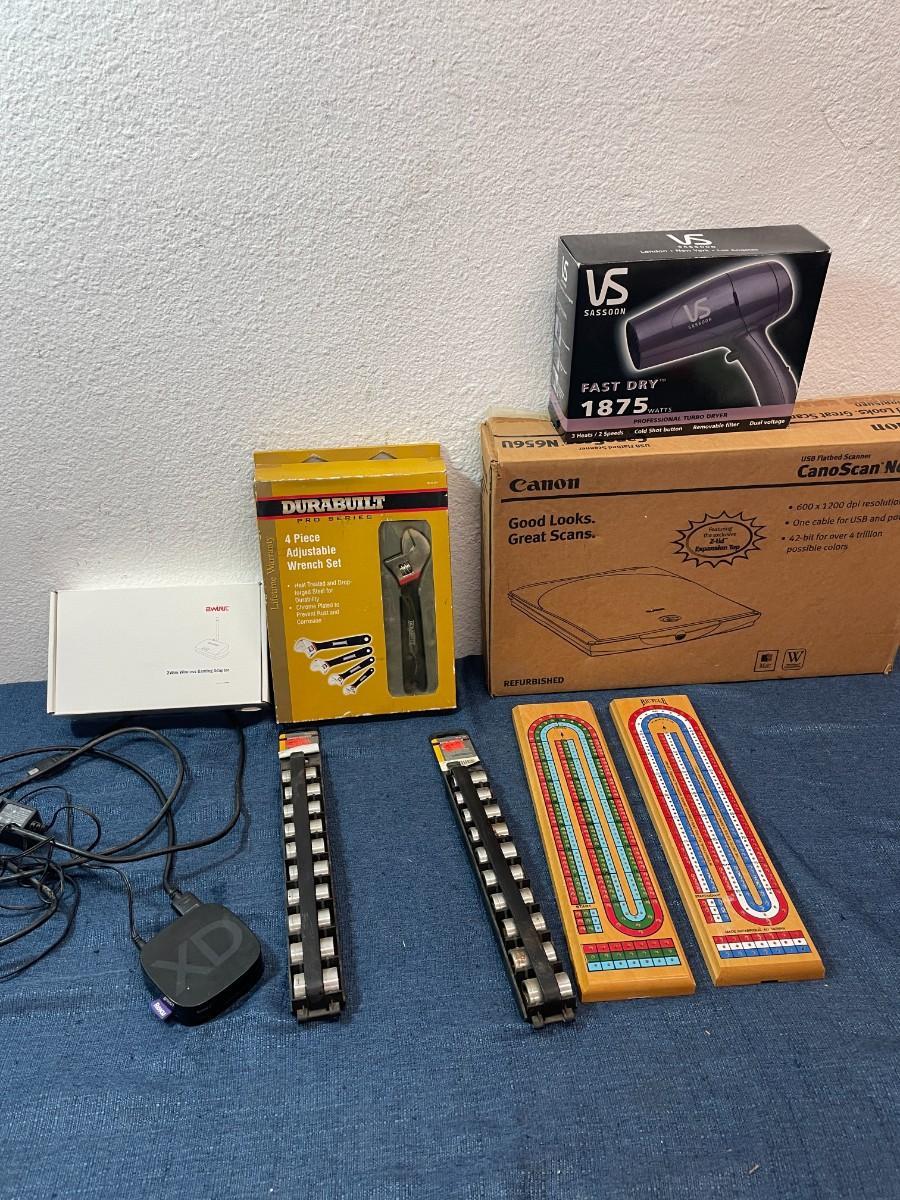 LARGE MISC LOT INCLUDING ROKU, TOOLS, SCANNER, CRIBBAGE BOARDS & MORE
