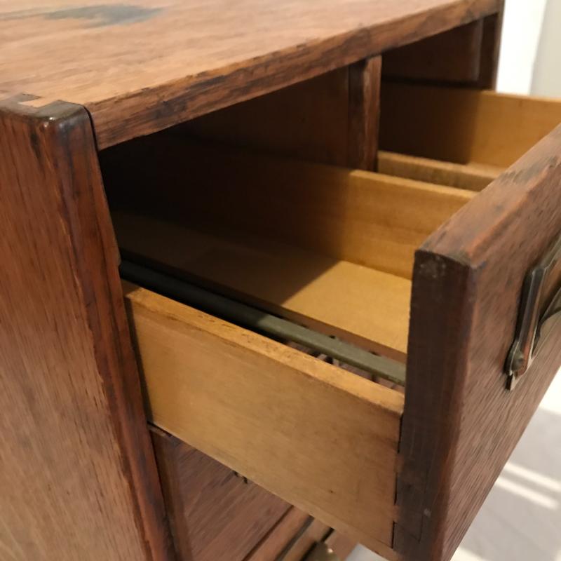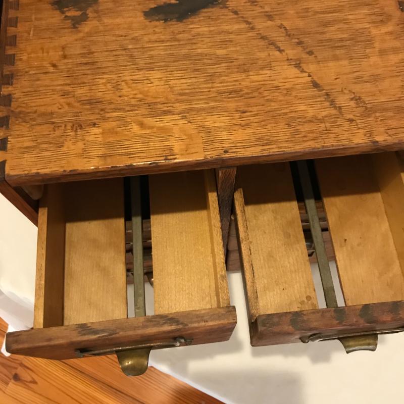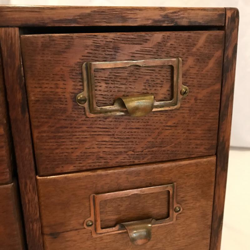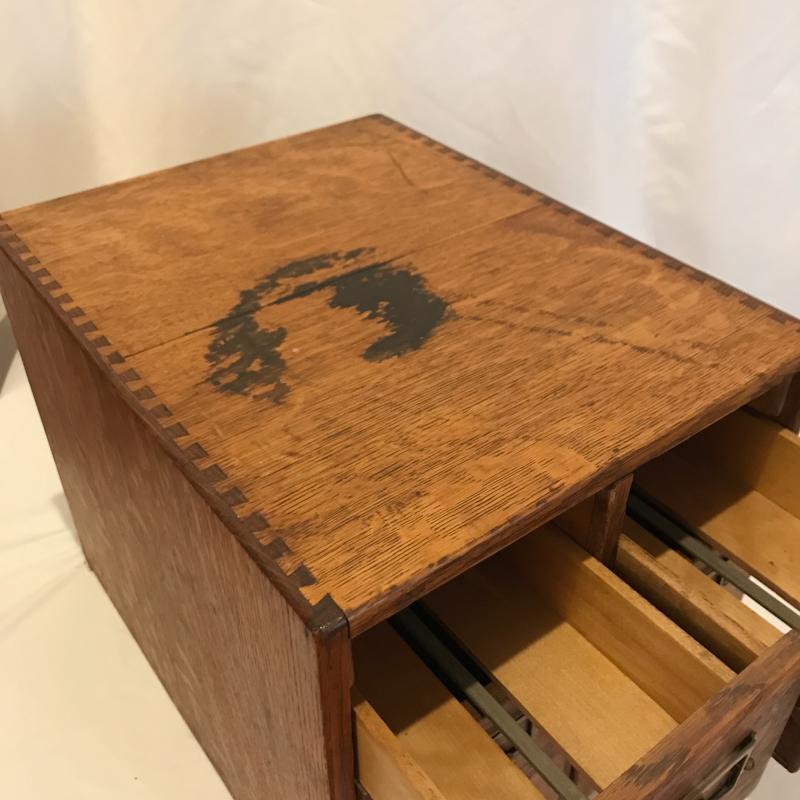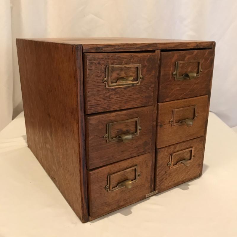 Antique wooden file box. Six drawers. Measures 17”l x 13”w x 24”h. Great condition but has a stain on top. See photos. No shipping. Local pick up only in Asheville