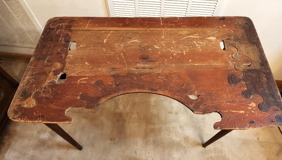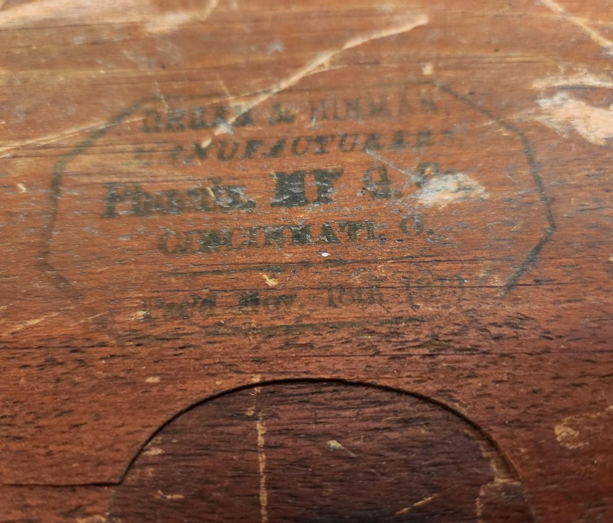 This antique (ca. 1875) sewing table was purchased at the auction of the contents of famous Melrose Plantation (Natchitoches, LA) in the 1970's. 34" x 18.5", 25.5" tall. Has a faint label on top: "Green & Hinman, Cincinnati & Phoenix, NY, May 1873". Antique condition.