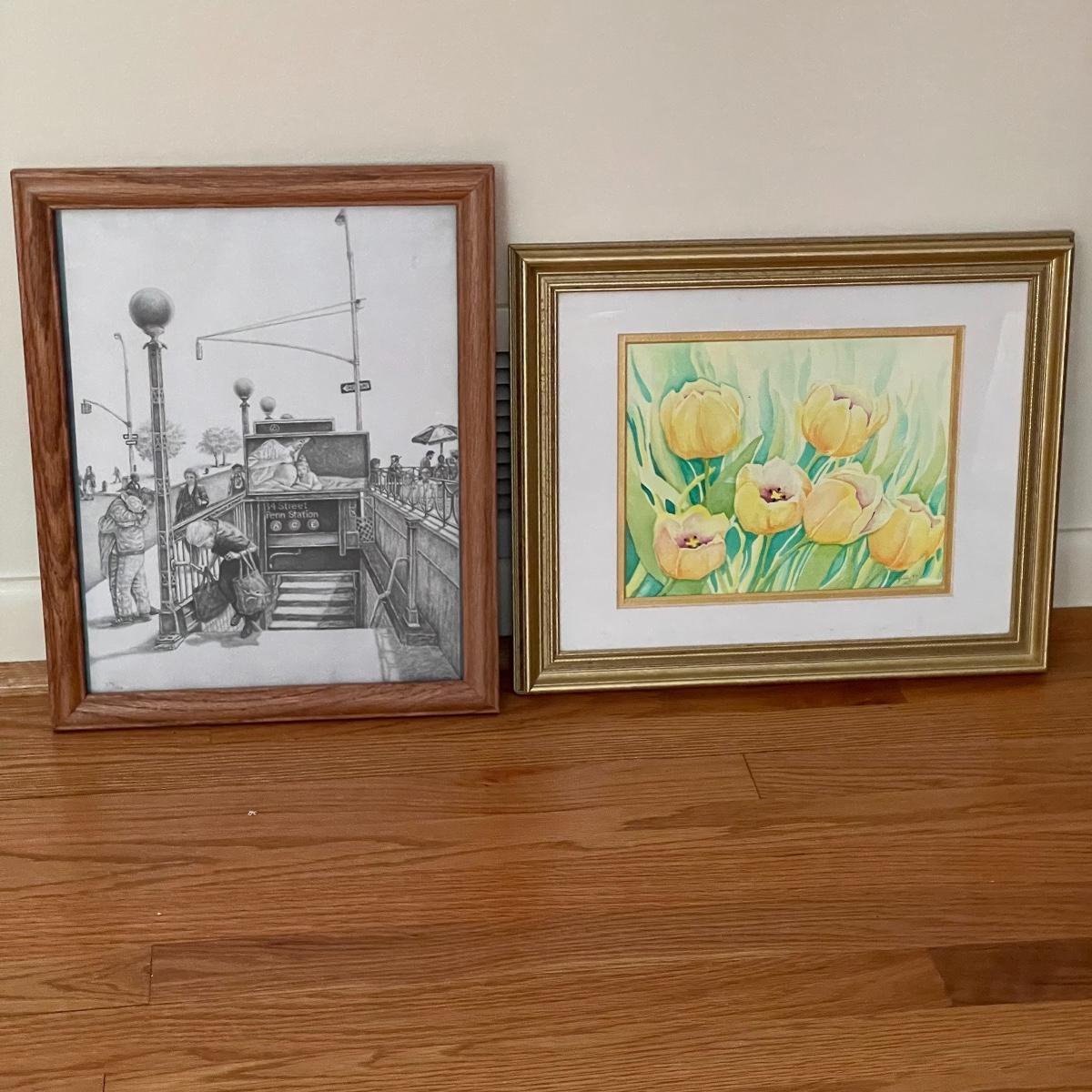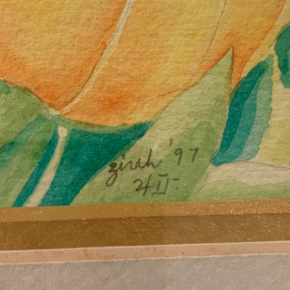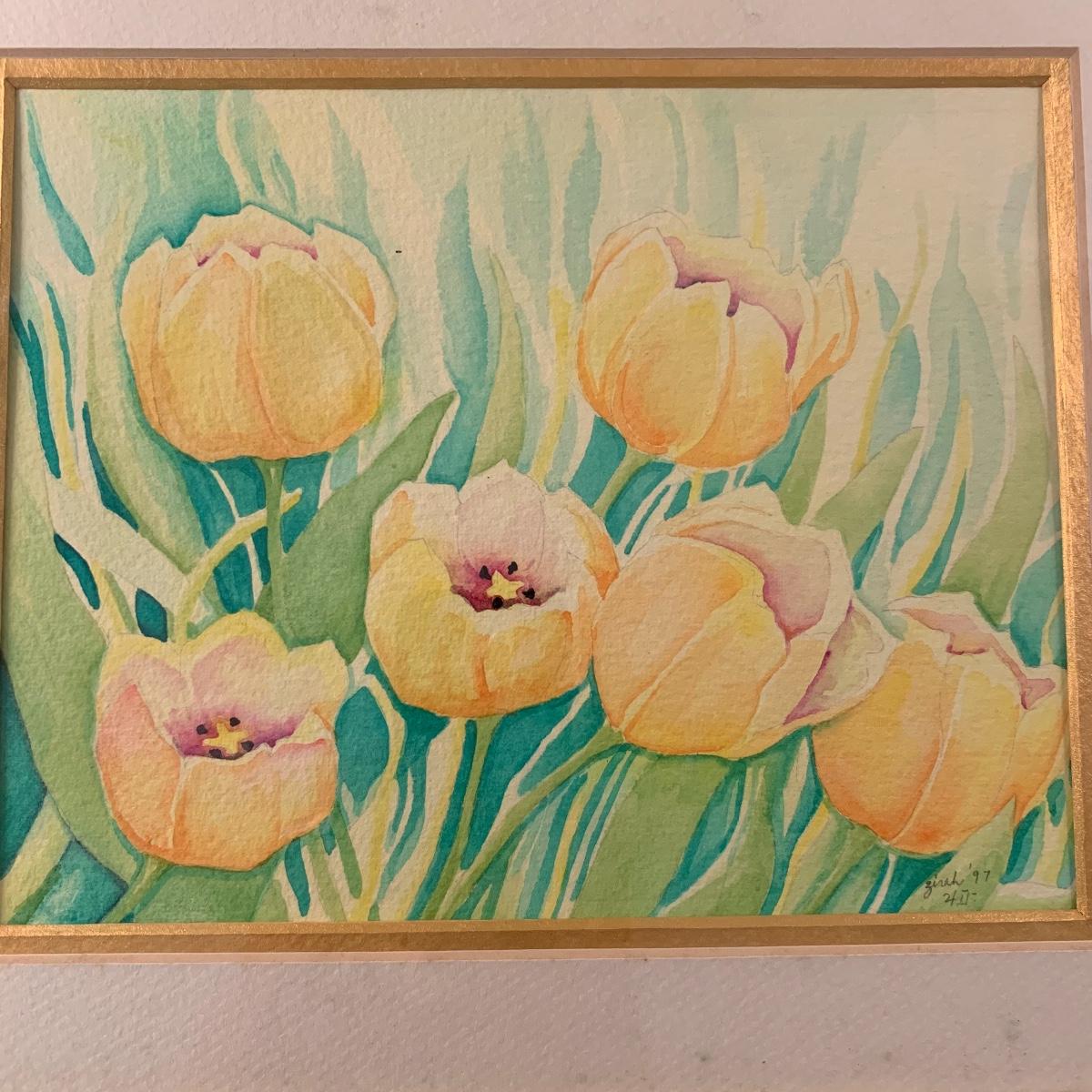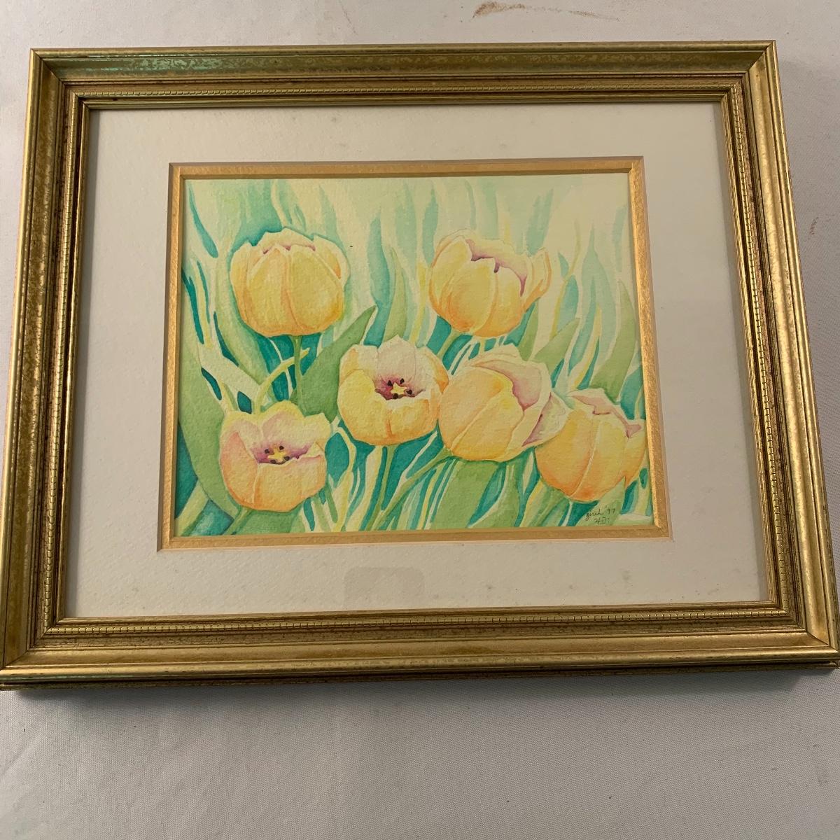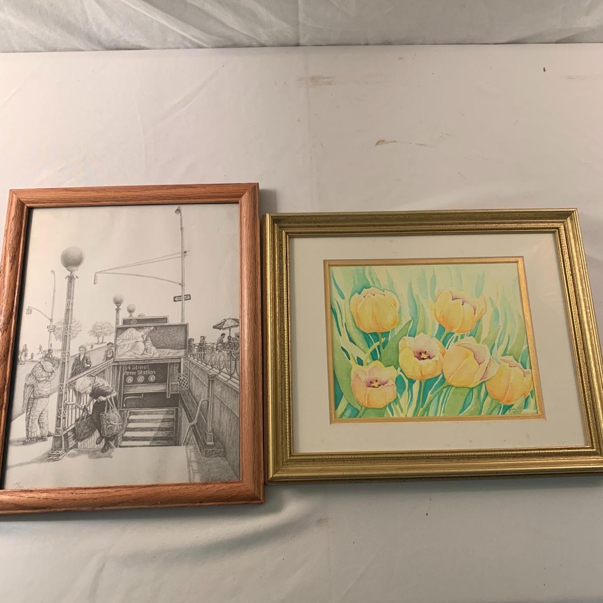 These delightful two pieces of art includes one black and white pencil print and one watercolor. The pencil print is mounted in a simple wood frame and has a signature, see images. It is also numbered 270/330. It measures 15.5in x 12.5in. The yellow tulip art is a watercolour that also has a signature and is matted and mounted in a gilded frame. It measures about 13.5in x 16.5in. Shipping available.