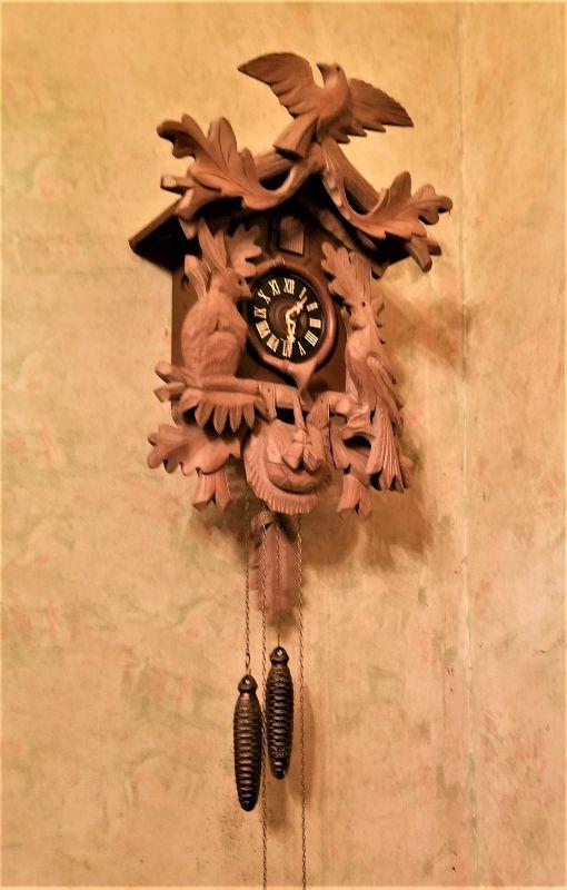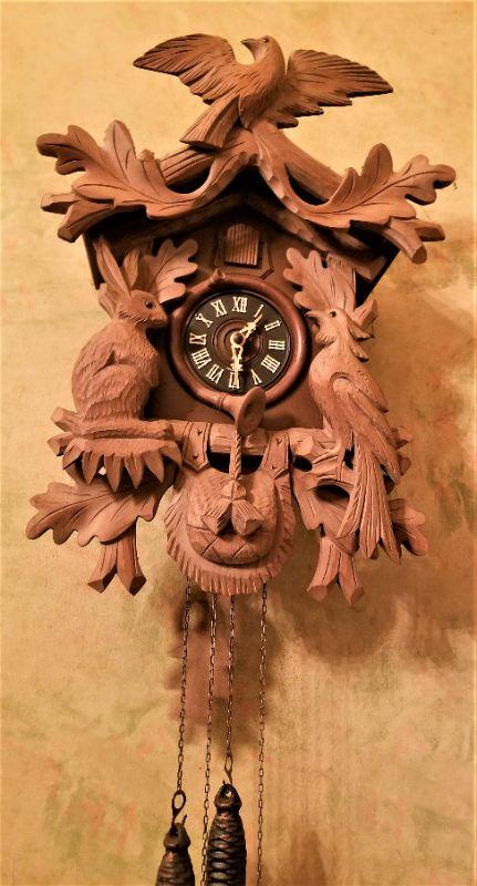 Nice "made in Germany" carved cuckoo clock - appears to be in good working condition. Carved figures of a rabbit and Bird on either side of the clock face. 17" long, not counting the pendulum.