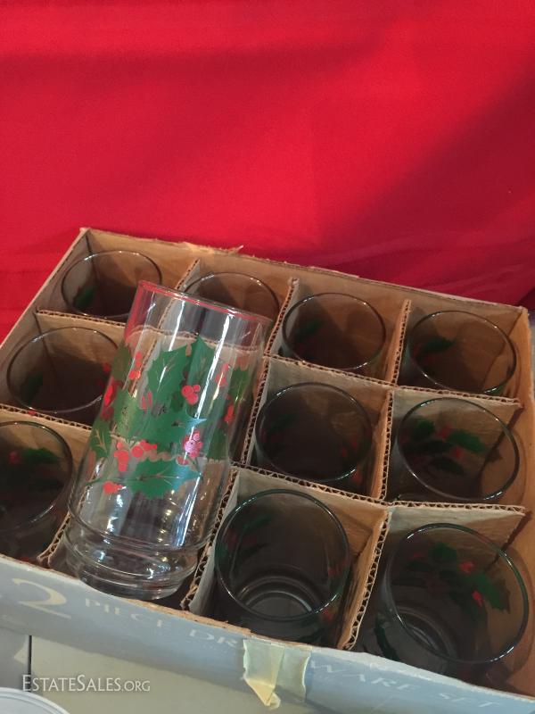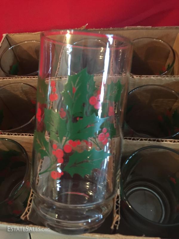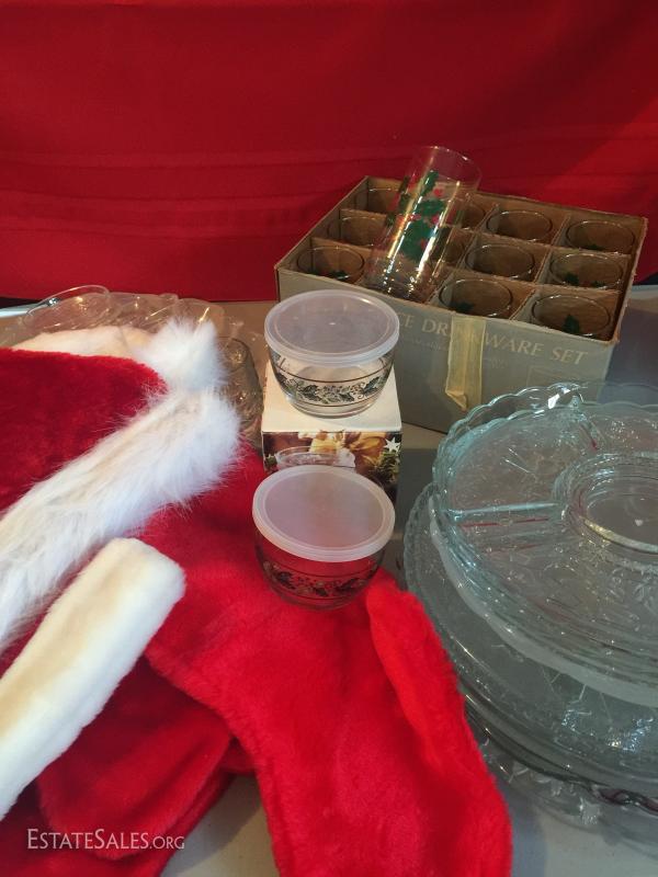 Large lot of Christmas items: ten Christmas serving platters, two sets of "Holly" drink coasters, three coffee/tea cups, set of twelve (12) matching MCM, Holly drinking glasses.