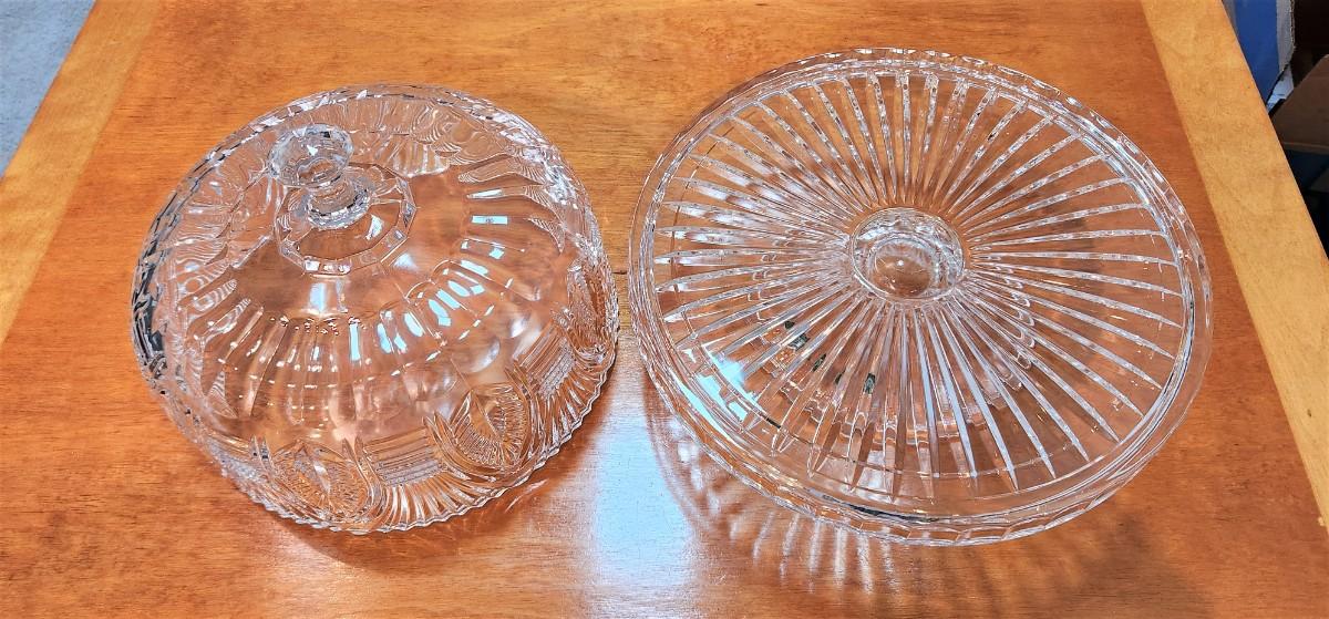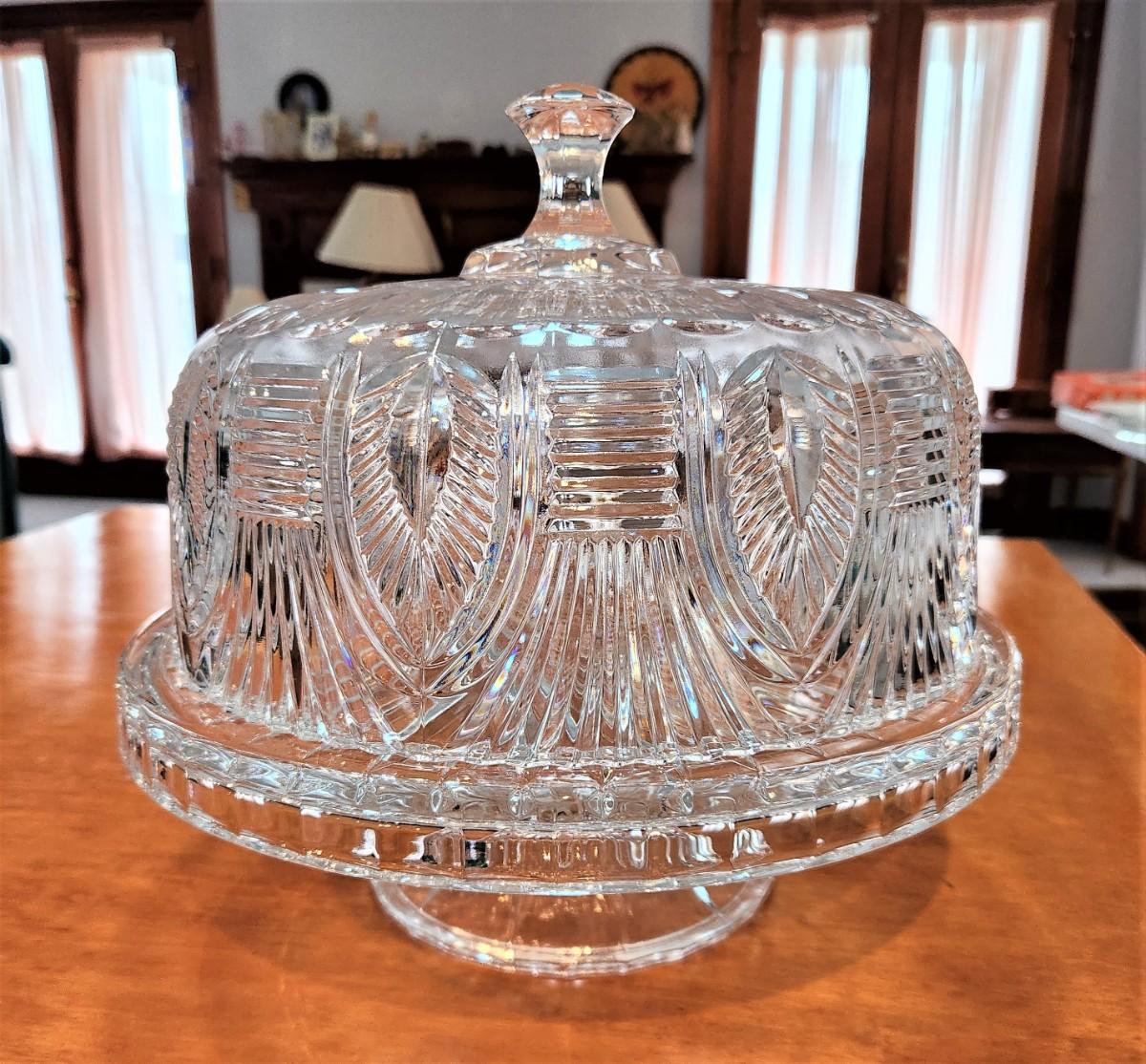 So pretty - and in great condition. HEAVY pressed glass cake plate on stand with cover - 12" tall, 12" across.