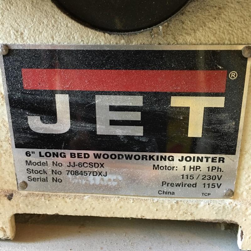 Jet 6” long bed Woodworking jointer model # JJ-6CSDX. Jointer is mounted on platform with wheels. Jointer measures 36” x 56” x 21” without platform