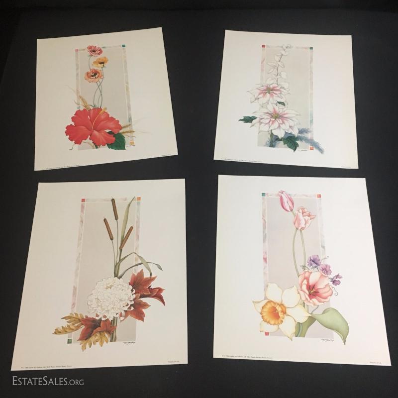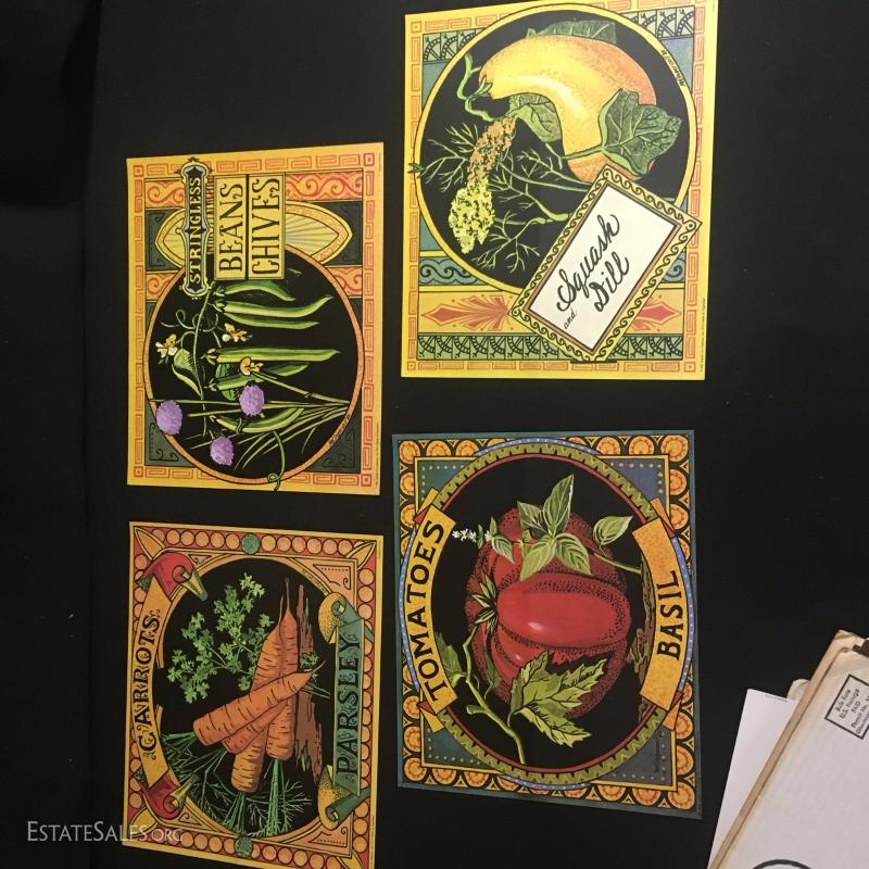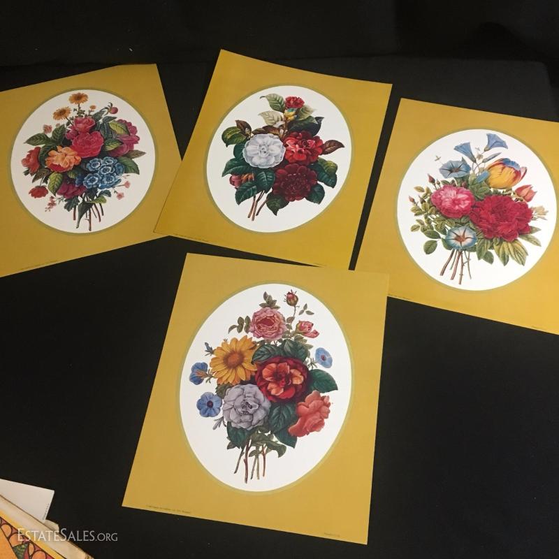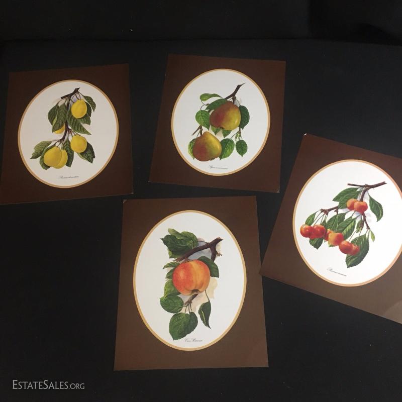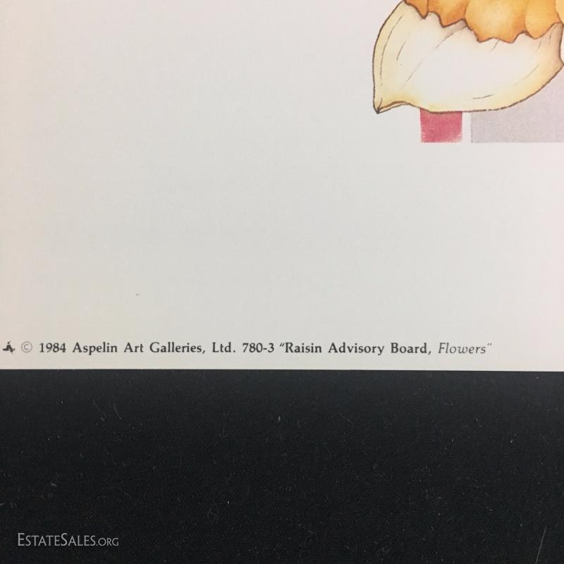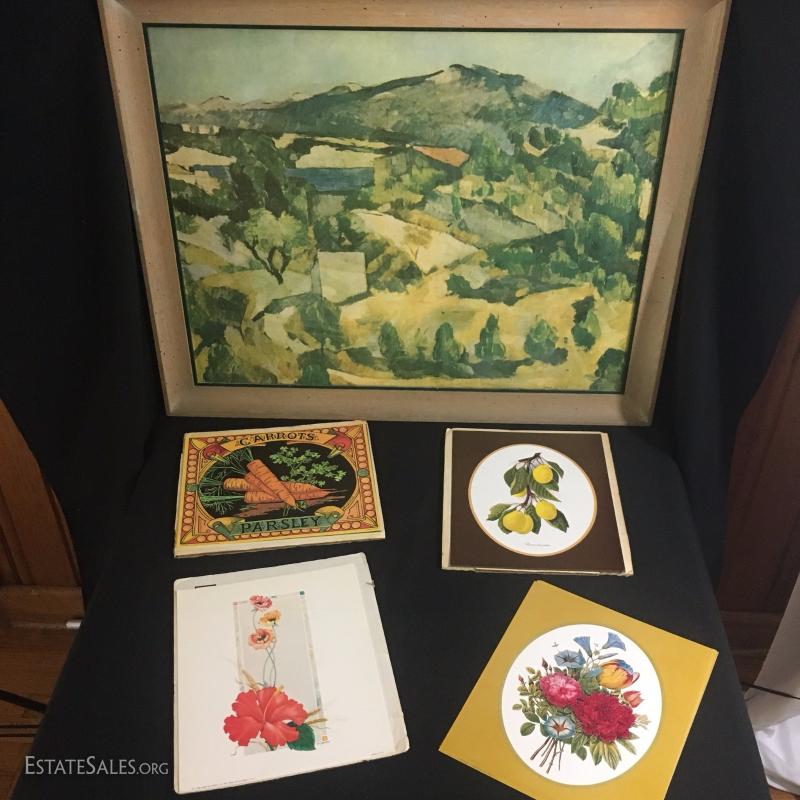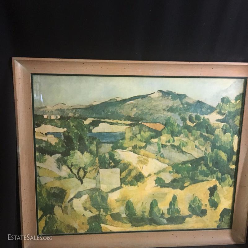 Large framed landscape print. Not signed. 34"l x 27.5"w. Also inlcude 16 unframed flower and vegetable prints. Approx 10 x 12 sizes. Vary.