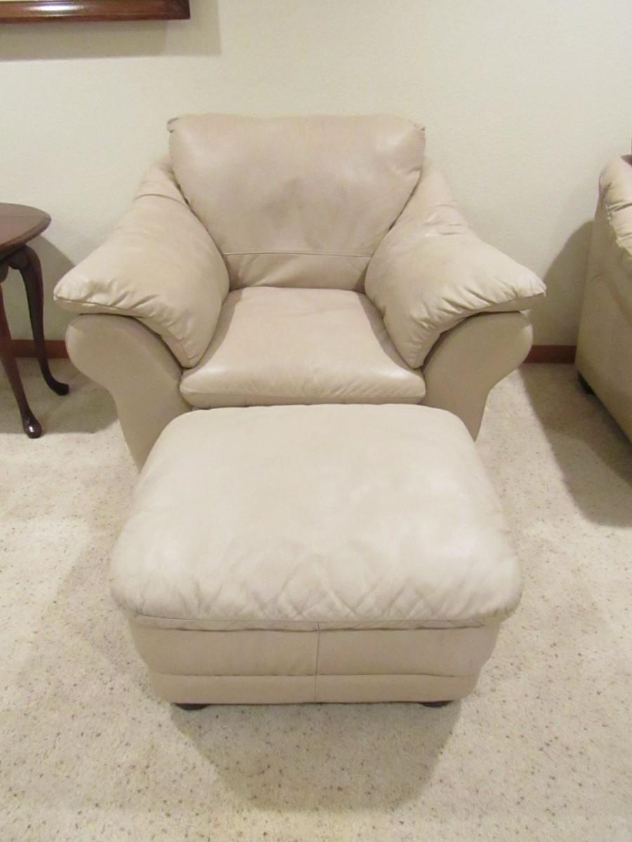 CREAM COLORED LEATHER LOUNGE CHAIR WITH MATCHING OTTOMAN IN GREAT SHAPE. THIS MATCHES THE LOVE SEAT AND SOFA